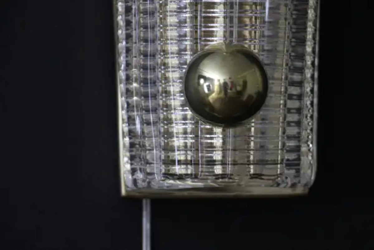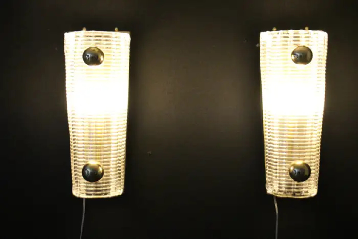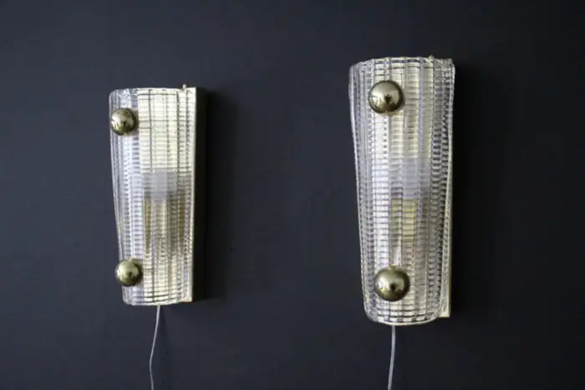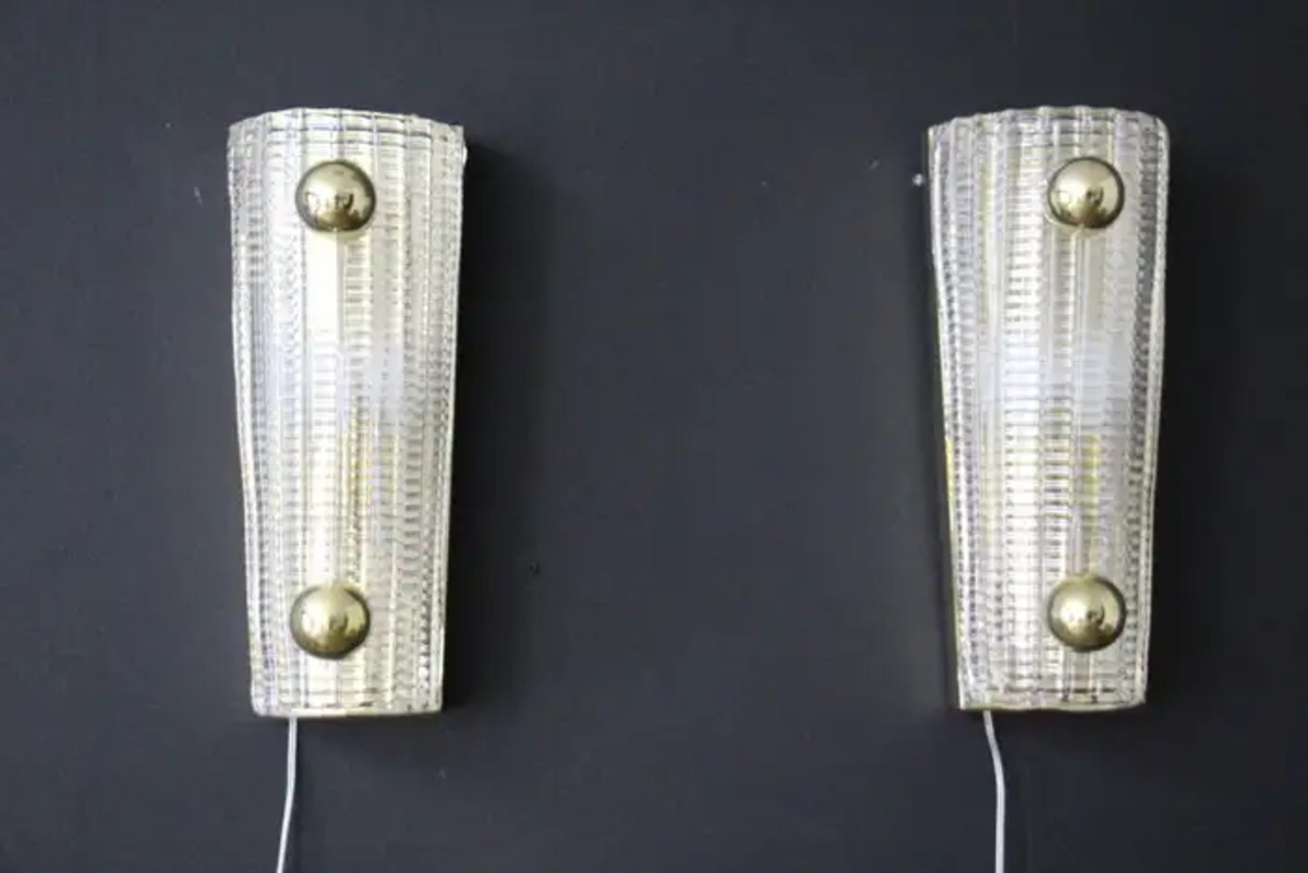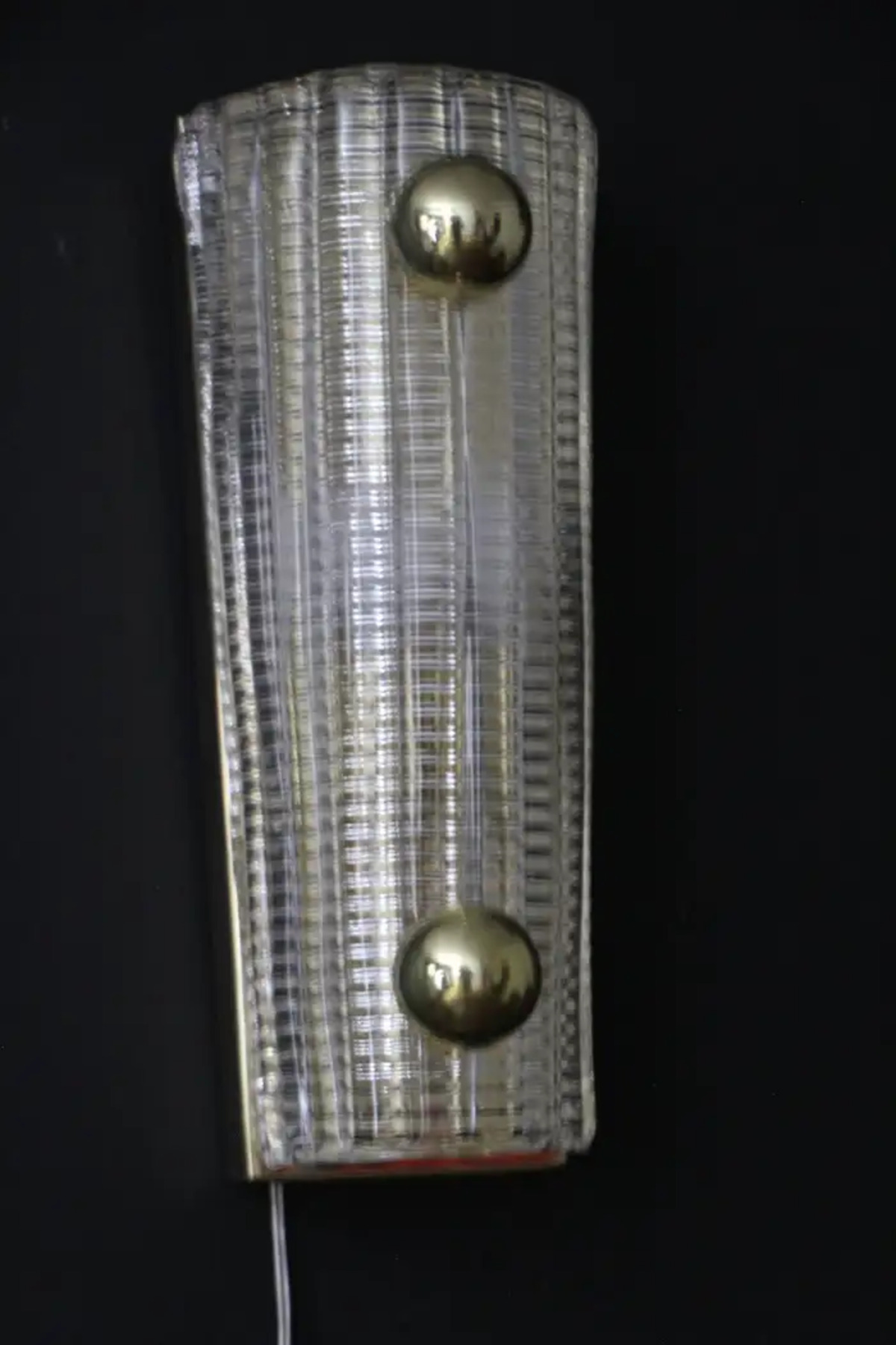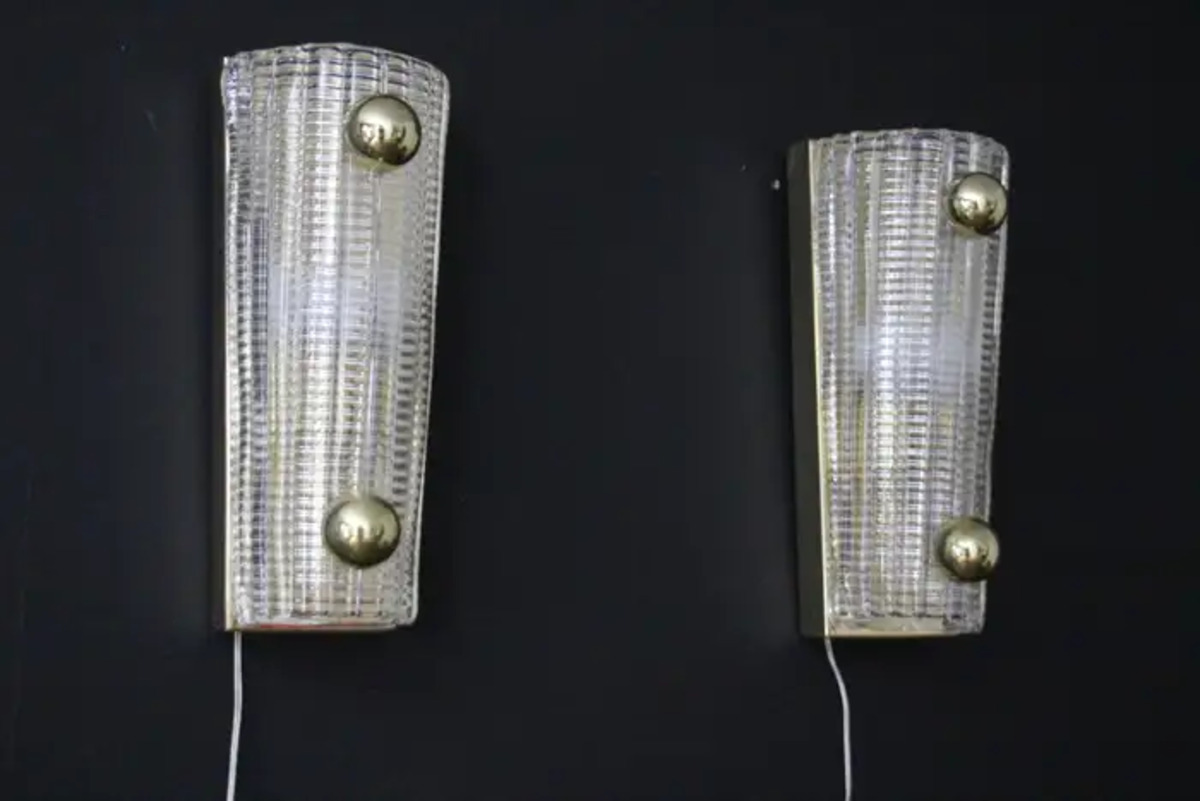 Cette magnifique paire d’appliques a été fabriquée à Murano . Elles présentent un aspect classique et très moderne à la fois grâce à leur beau verre de cristal texturé. Leur forme est très stricte et s’adoucit grâce à ses boules en laiton doré.