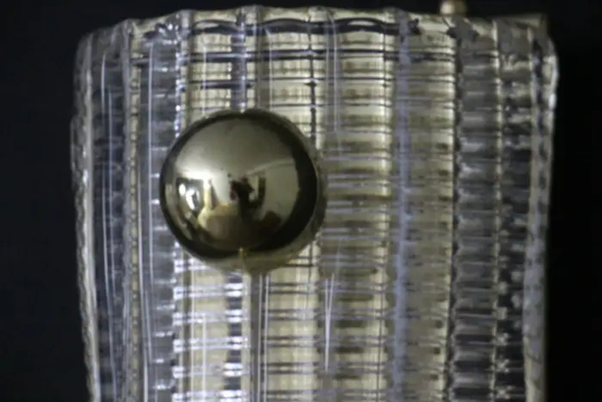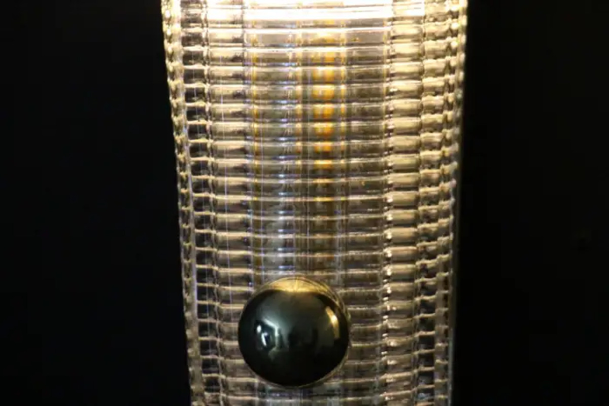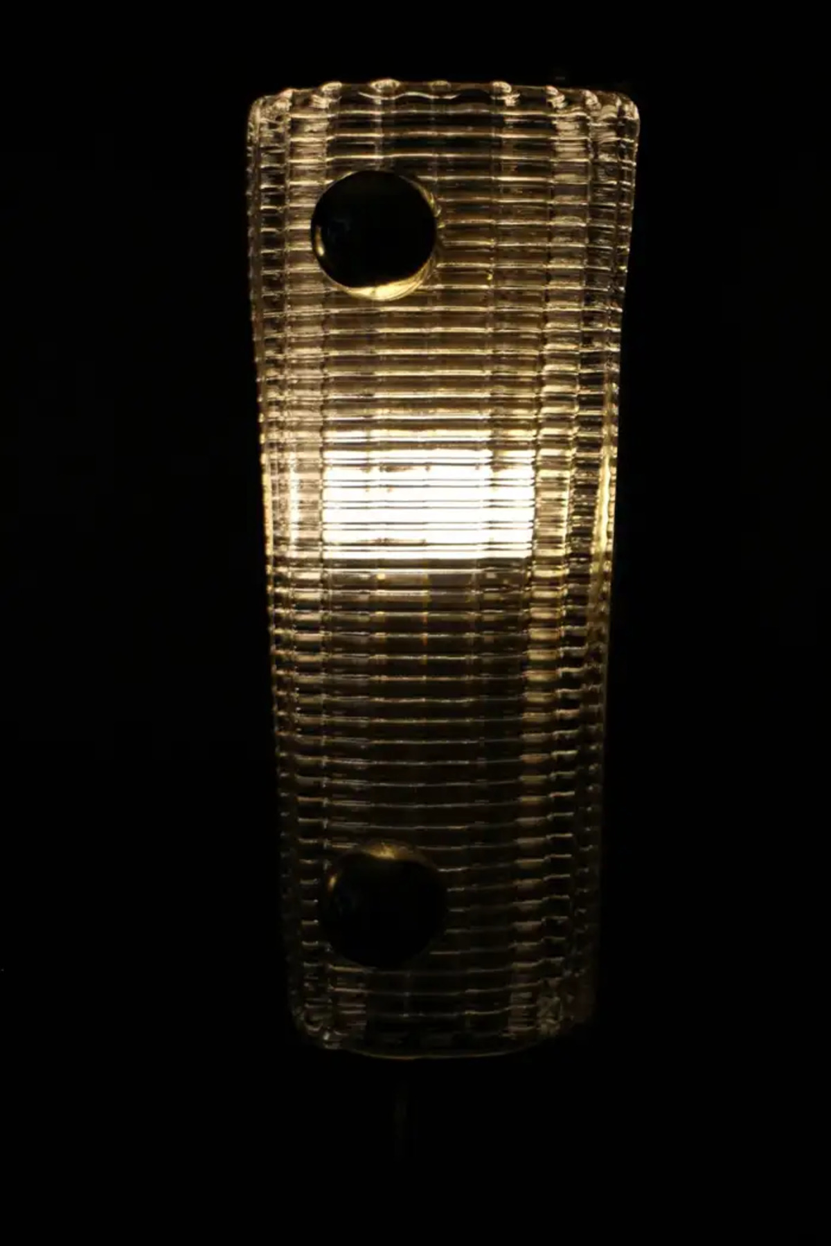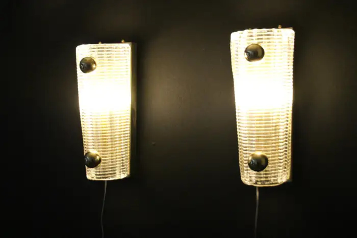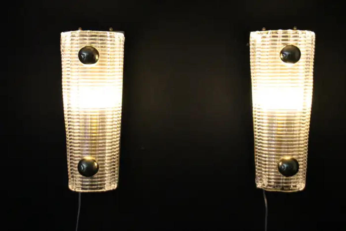 Cette magnifique paire d’appliques a été fabriquée à Murano . Elles présentent un aspect classique et très moderne à la fois grâce à leur beau verre de cristal texturé. Leur forme est très stricte et s’adoucit grâce à ses boules en laiton doré.