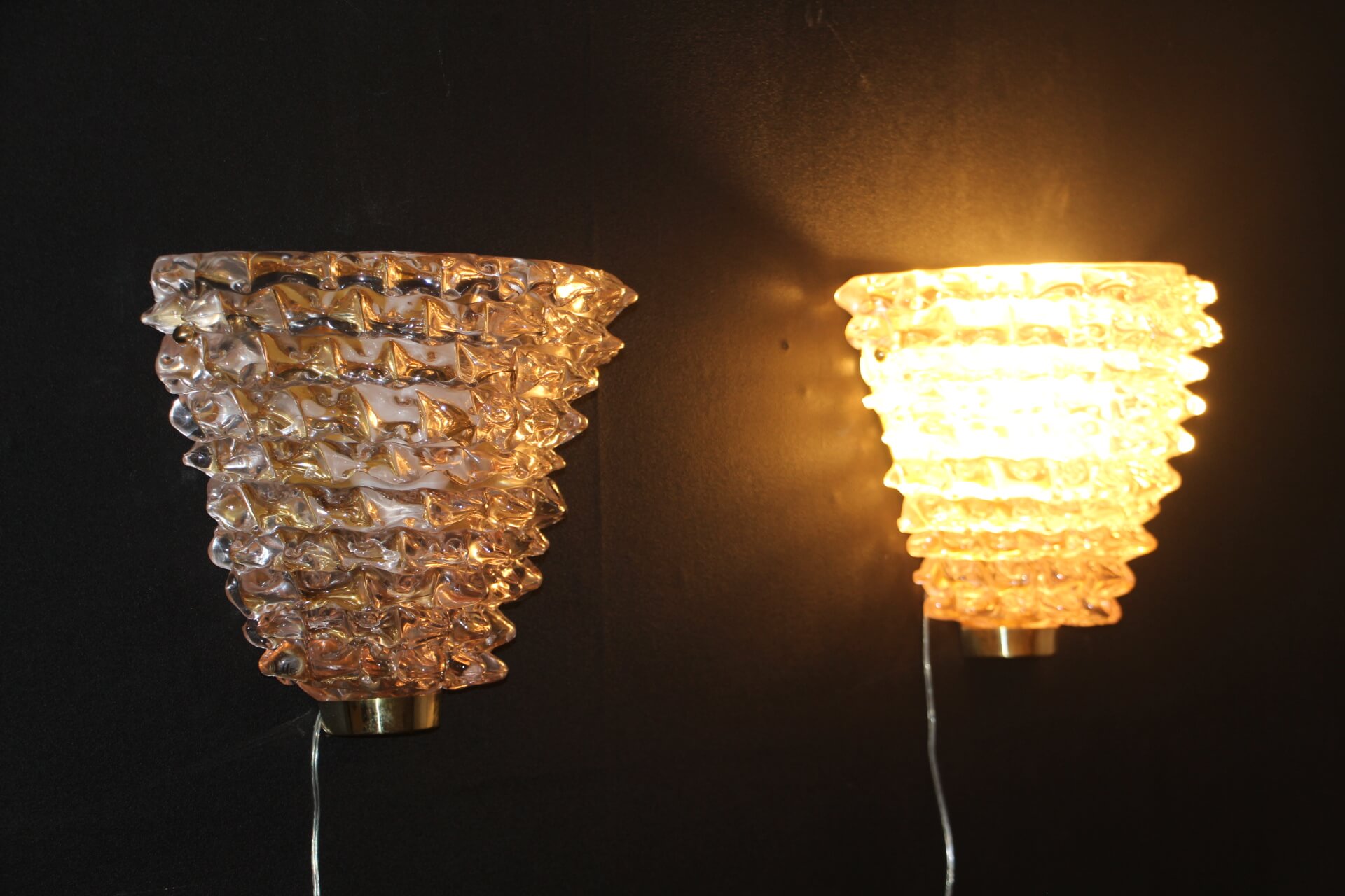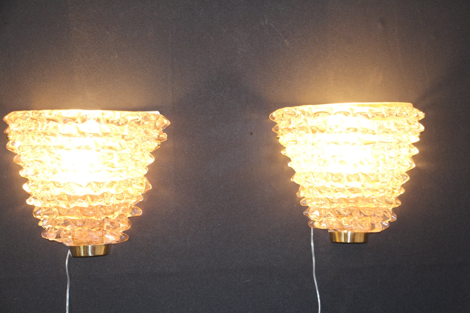 Seuls quelques maitres verriers à Venise détiennent ce savoir faire. Ces appliques comme cette paire d’appliques roses en verre de Murano sont très agréables et diffusent une belle lumière douce grâce à leur couleur légèrement rosée.