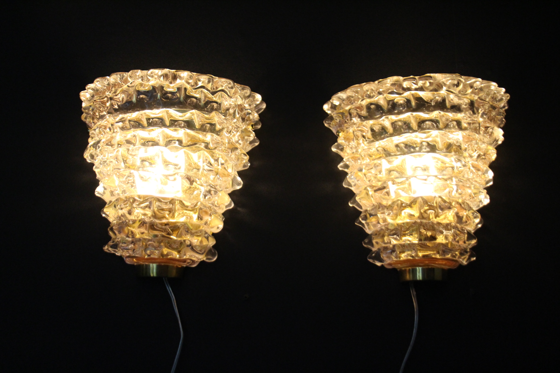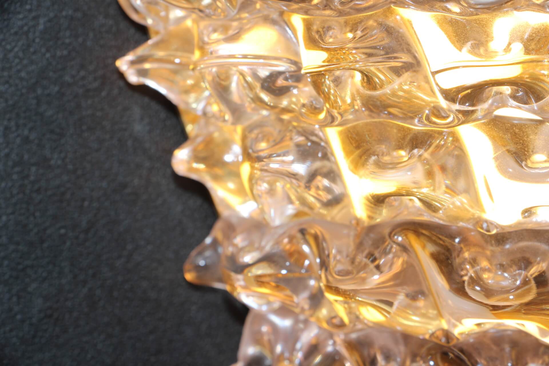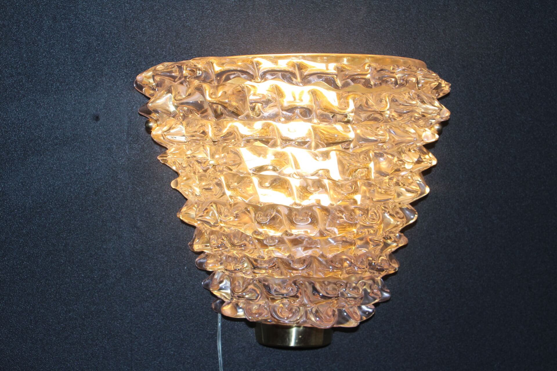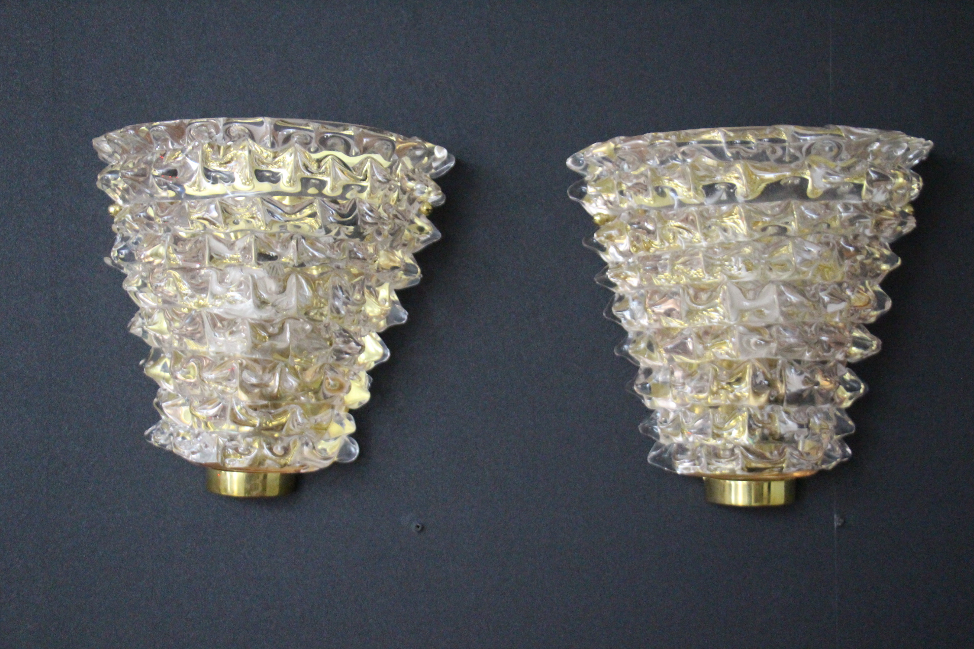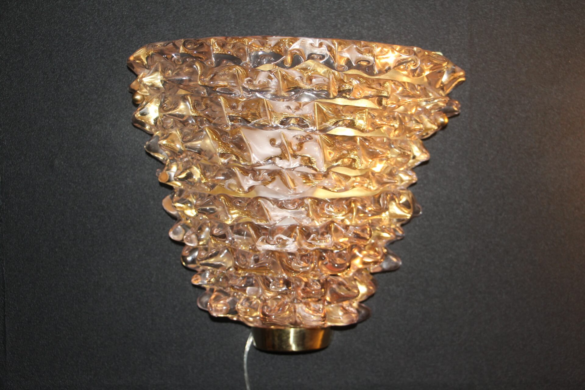 Cette trés belle paire d’appliques roses en verre de Murano dans le style de Barovier e Toso a été réalisée grace à la technique ” rostrato” . Entièrement réalisée à la main, cette technique consiste à tirer vers l’extérieur chaque pointe de verre pour obtenir cet aspect 3D impressionnant.