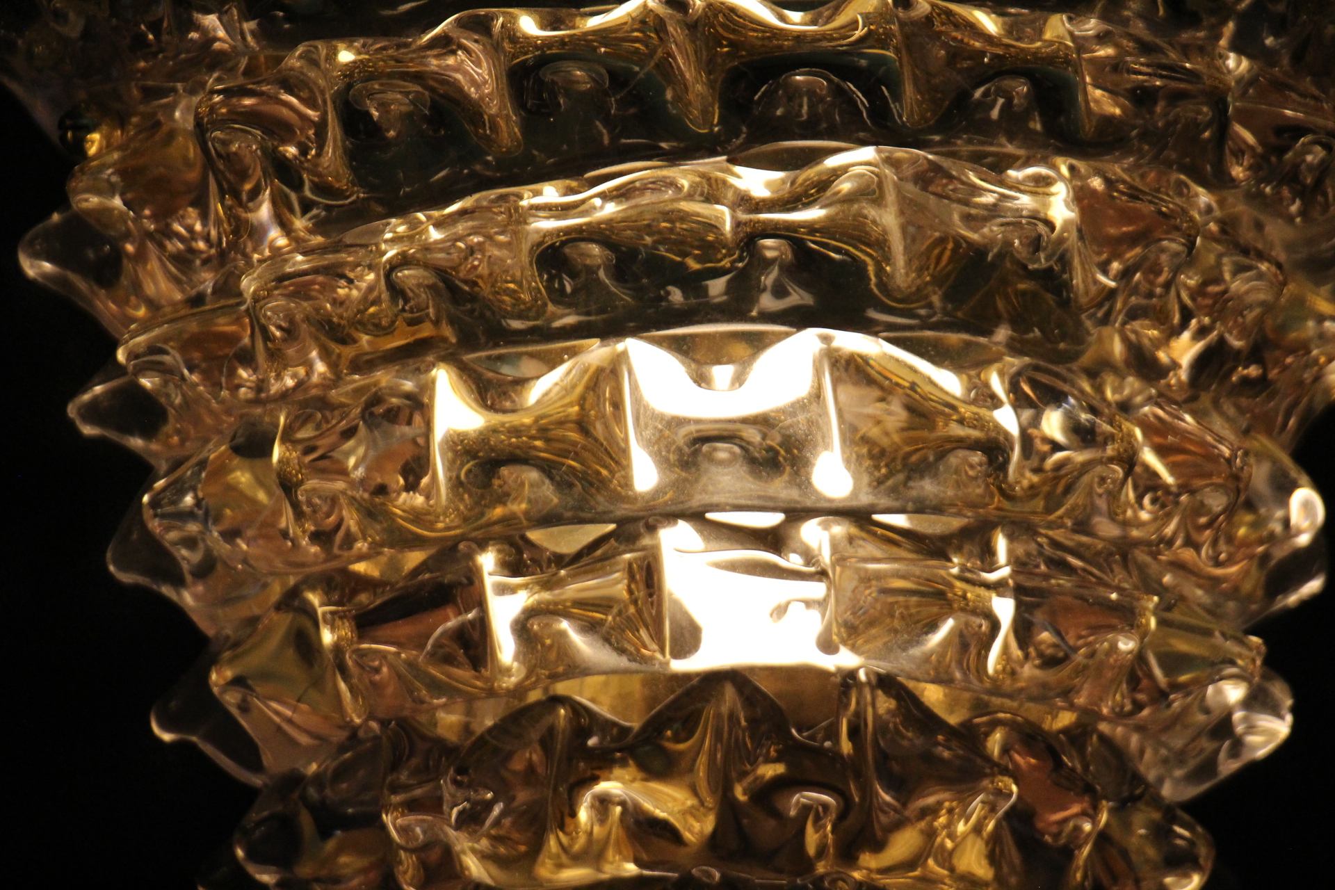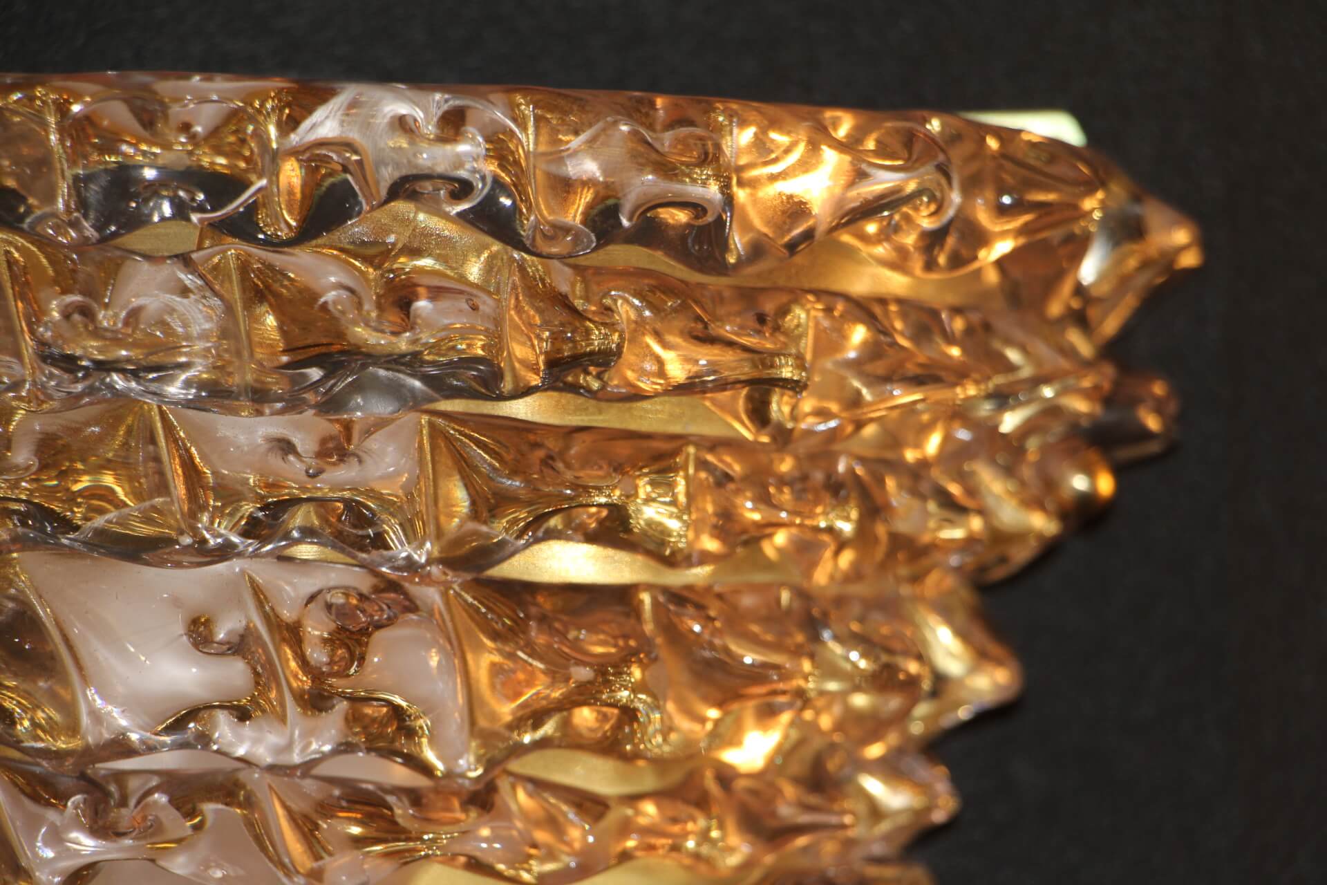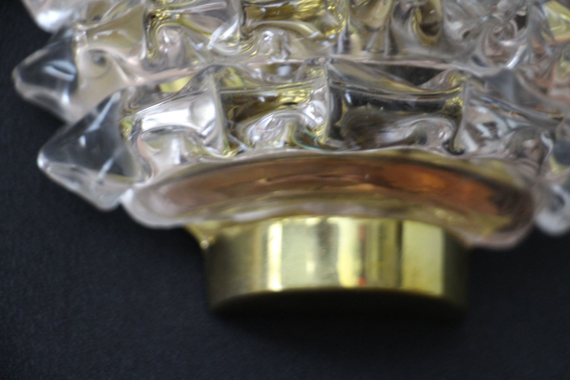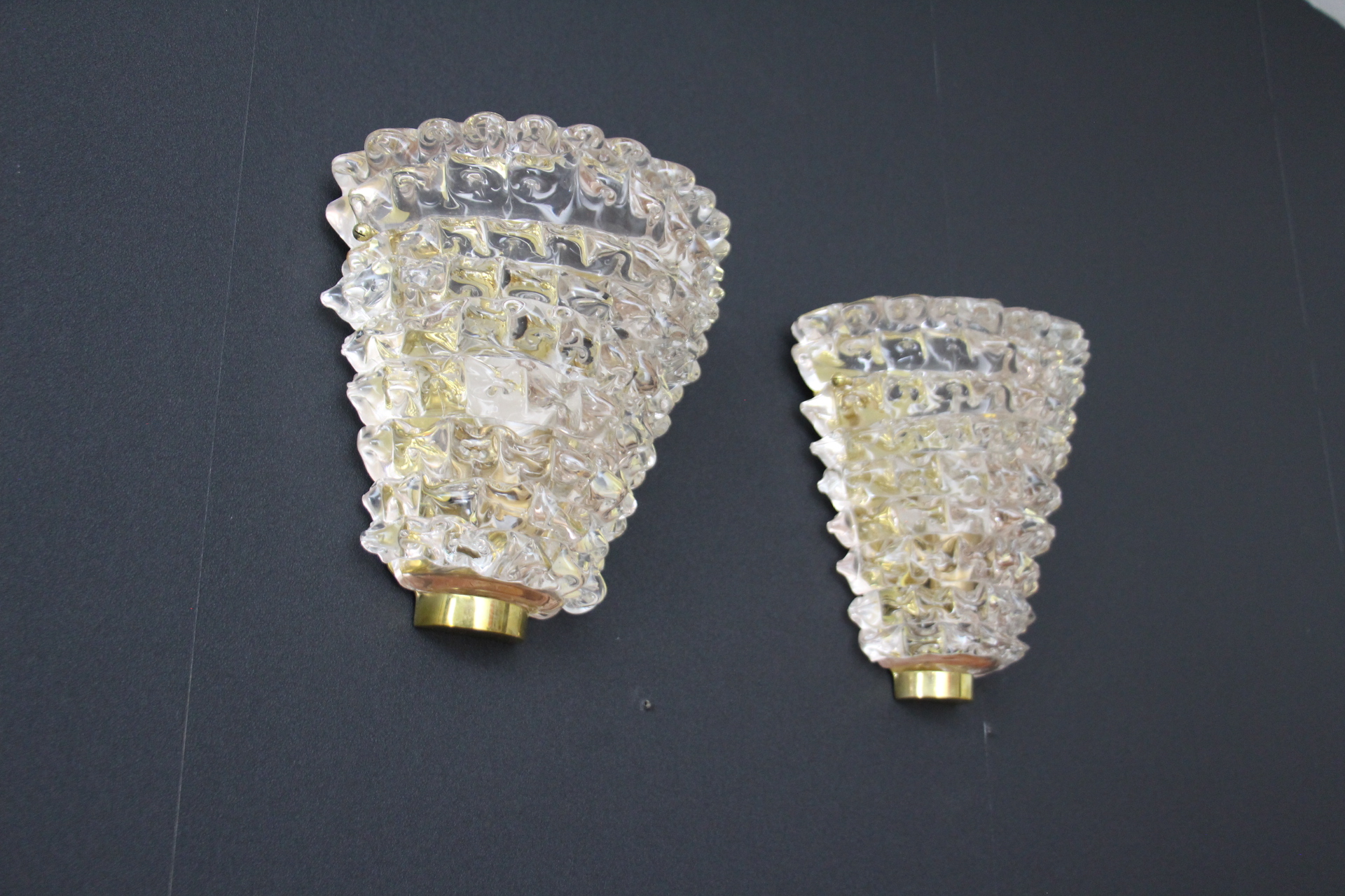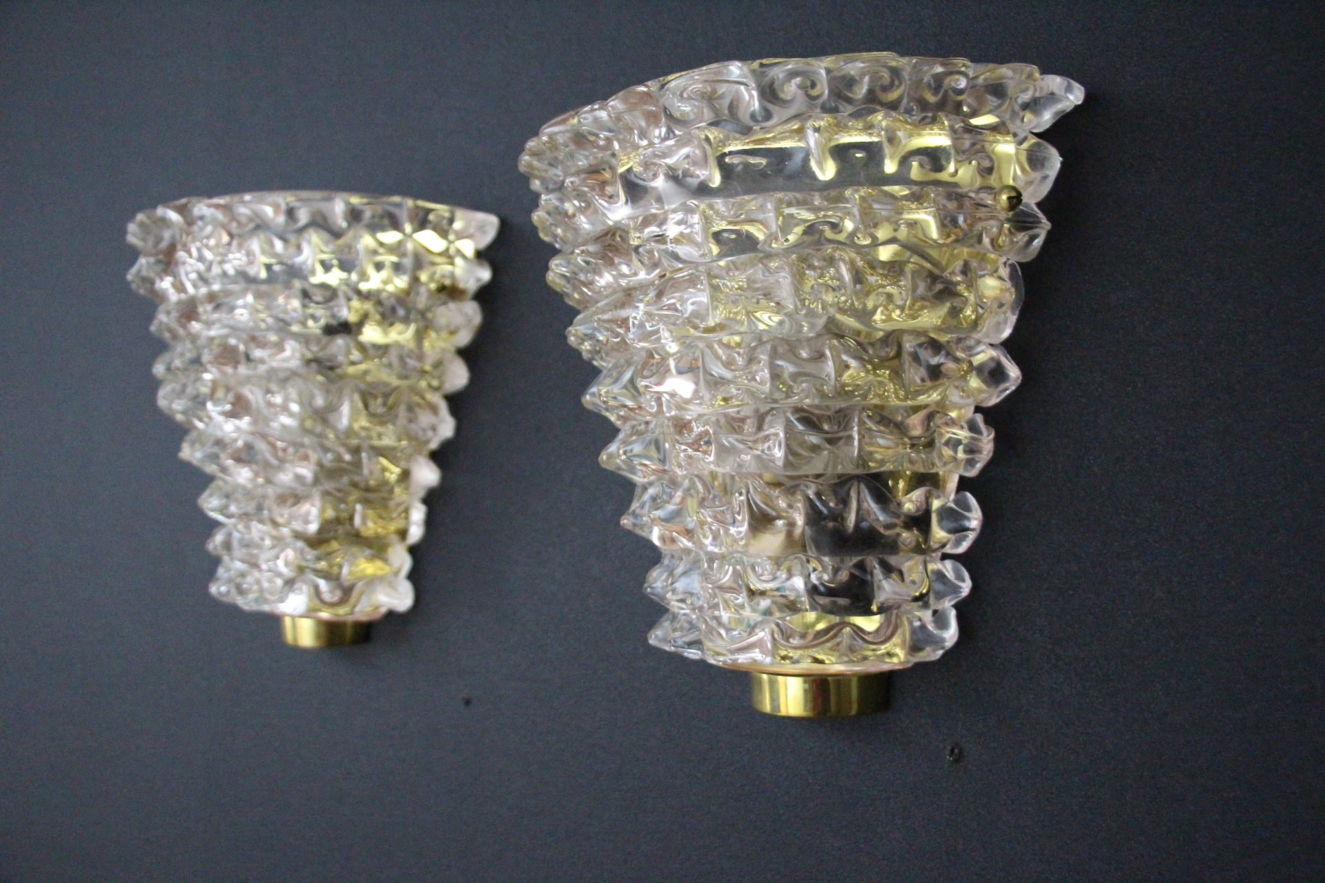 Cette trés belle paire d’appliques roses en verre de Murano dans le style de Barovier e Toso a été réalisée grace à la technique ” rostrato” . Entièrement réalisée à la main, cette technique consiste à tirer vers l’extérieur chaque pointe de verre pour obtenir cet aspect 3D impressionnant.