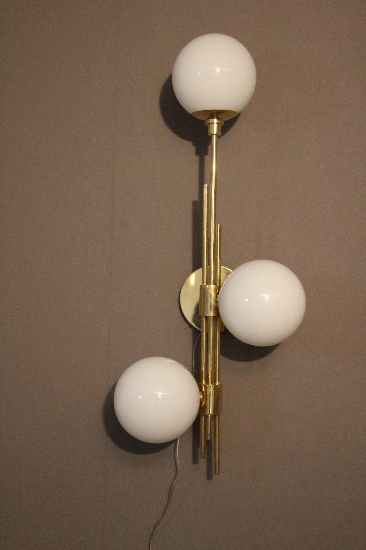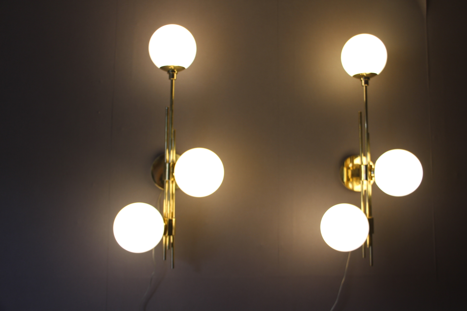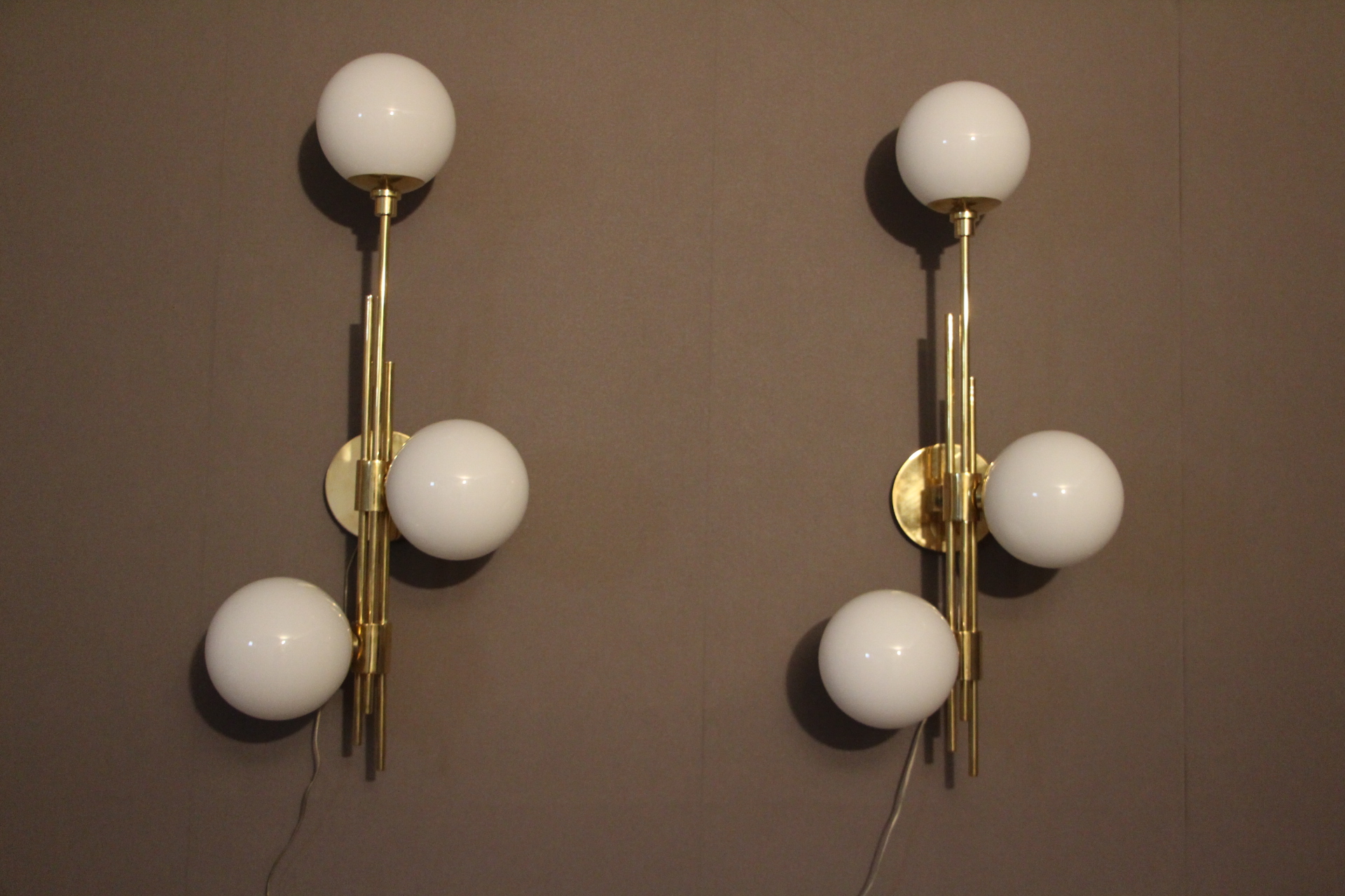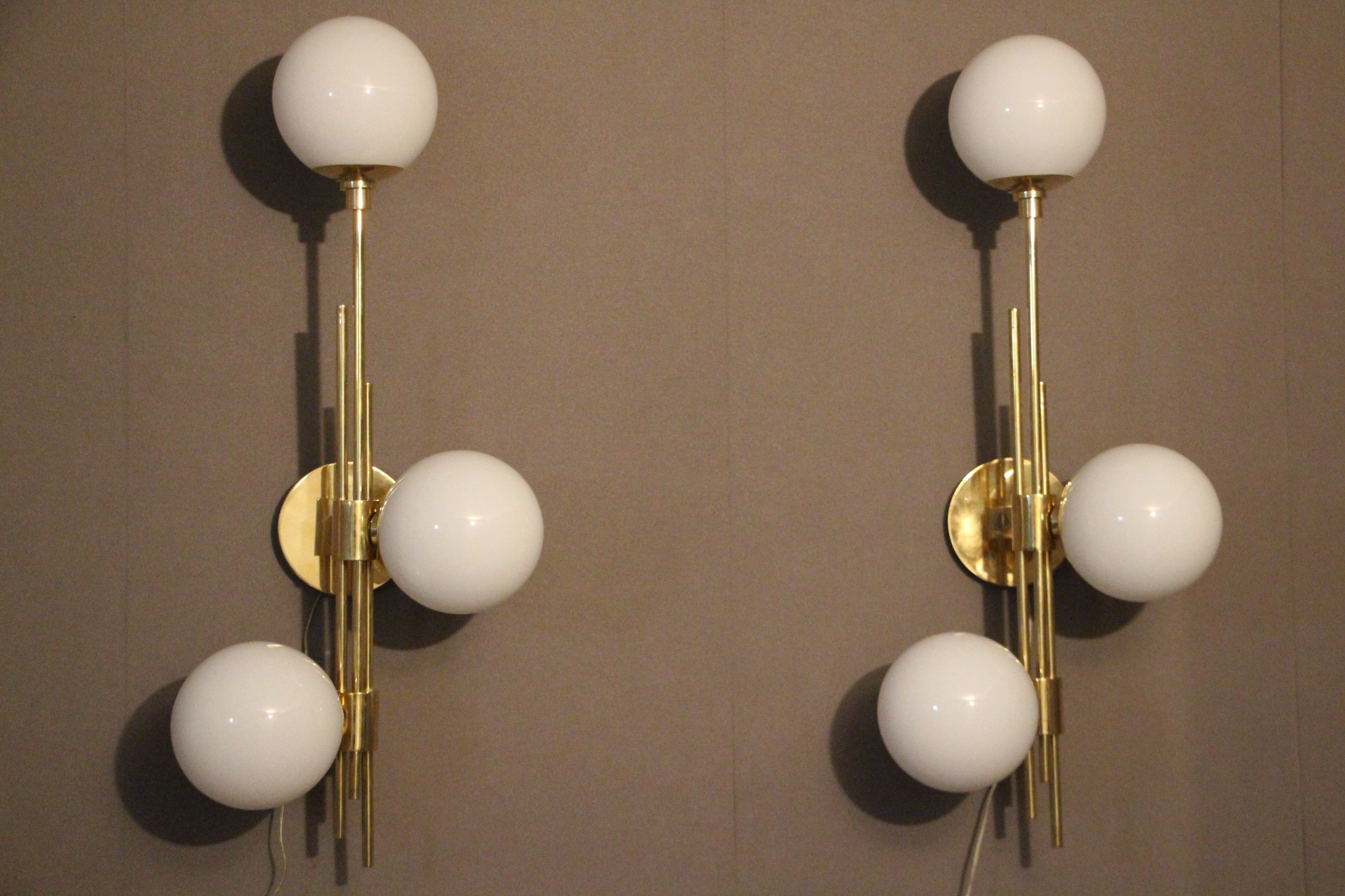 Cette très belle paire d’appliques vintage verticales en laiton doré comporte 3 globes blancs en verre de Murano. Sa structure est joliment ouvragée. La nature asymétrique de cette paire en fait une pièce unique, ajoutant un charme distinctif et un caractère affirmé à tout espace qu’elles habiteront.