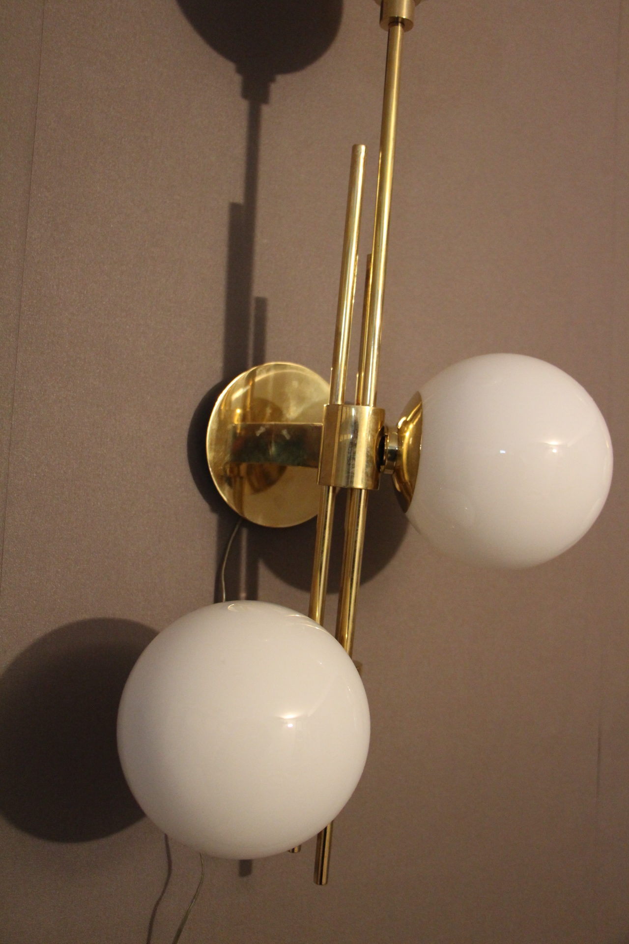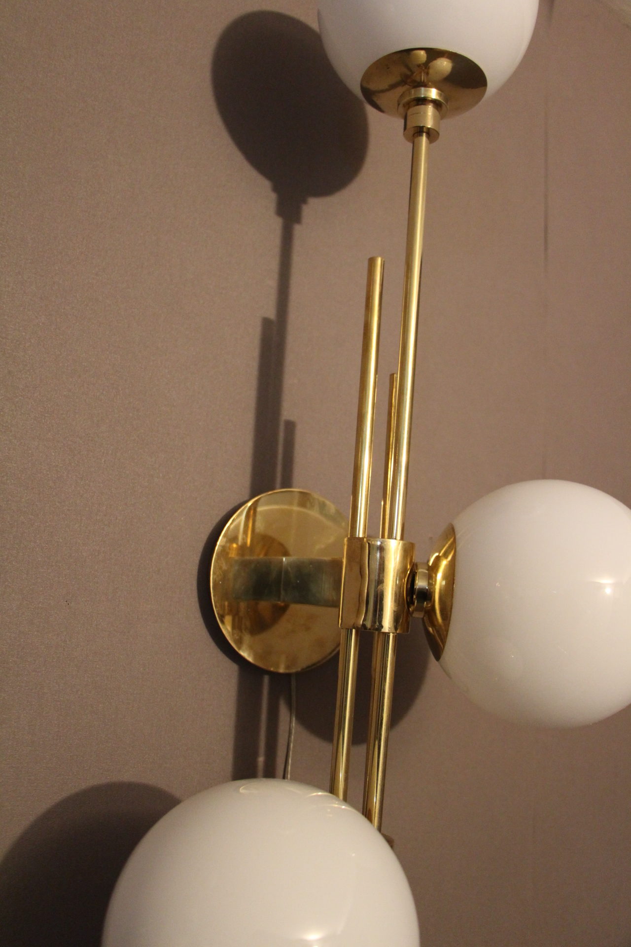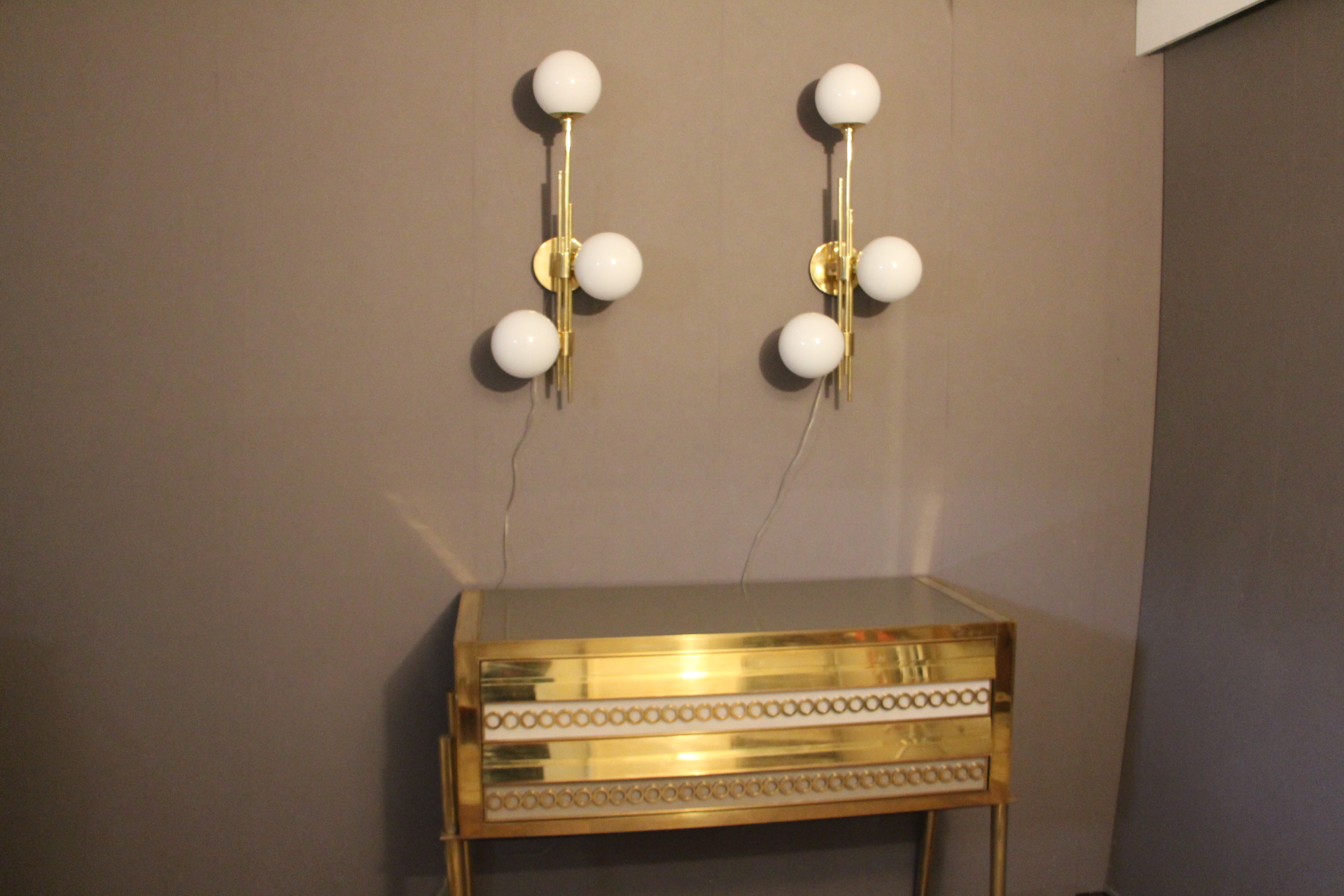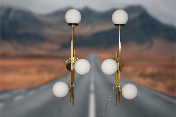 Cette très belle paire d’appliques vintage verticales en laiton doré comporte 3 globes blancs en verre de Murano. Sa structure est joliment ouvragée. La nature asymétrique de cette paire en fait une pièce unique, ajoutant un charme distinctif et un caractère affirmé à tout espace qu’elles habiteront.