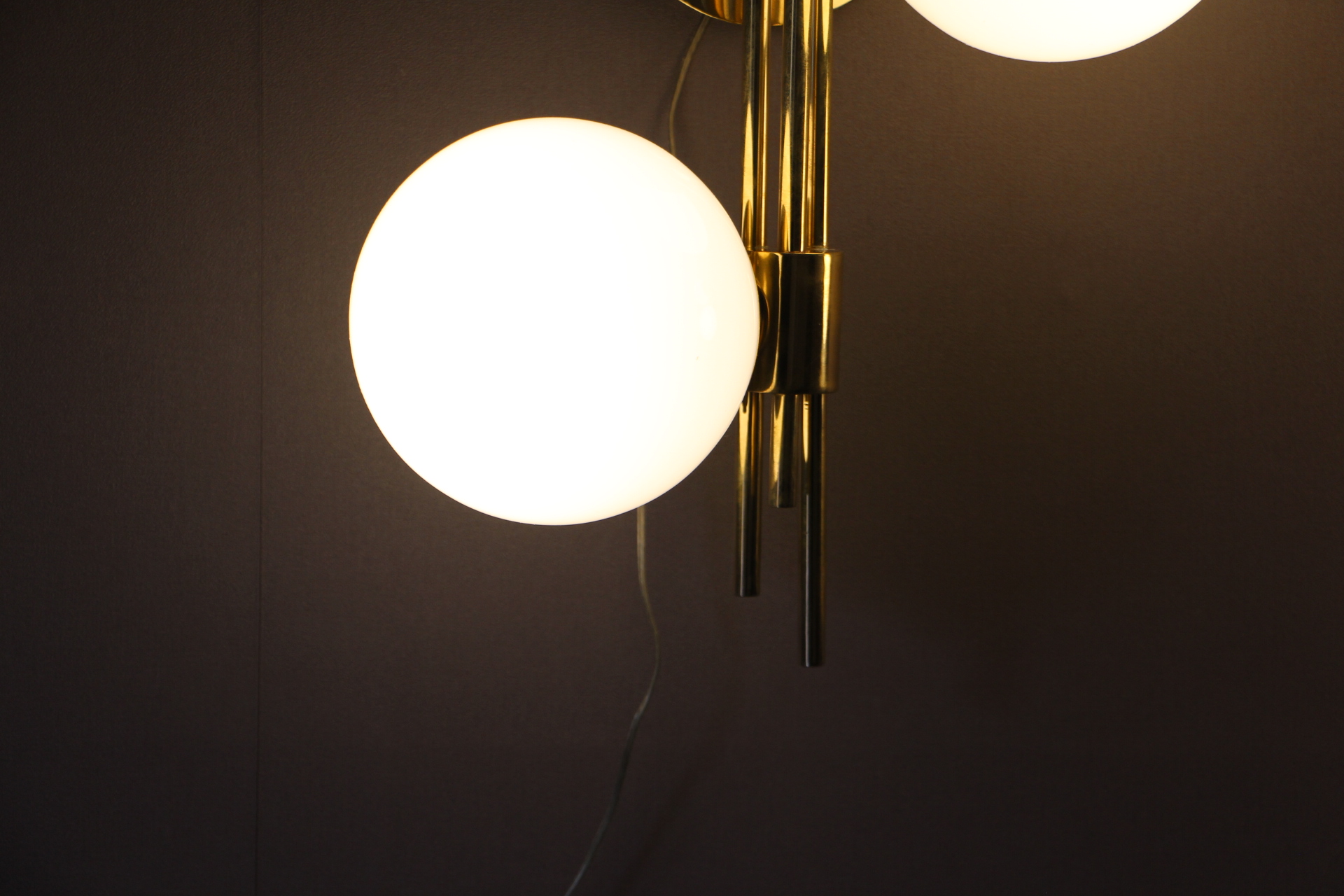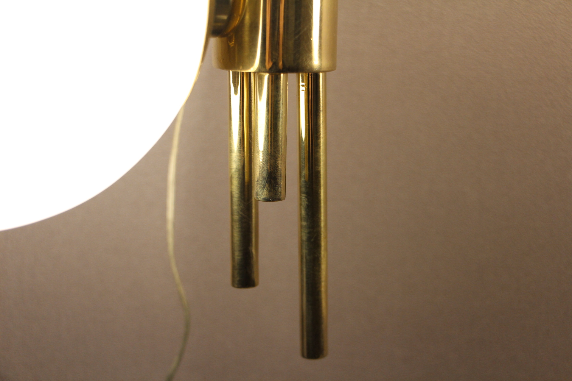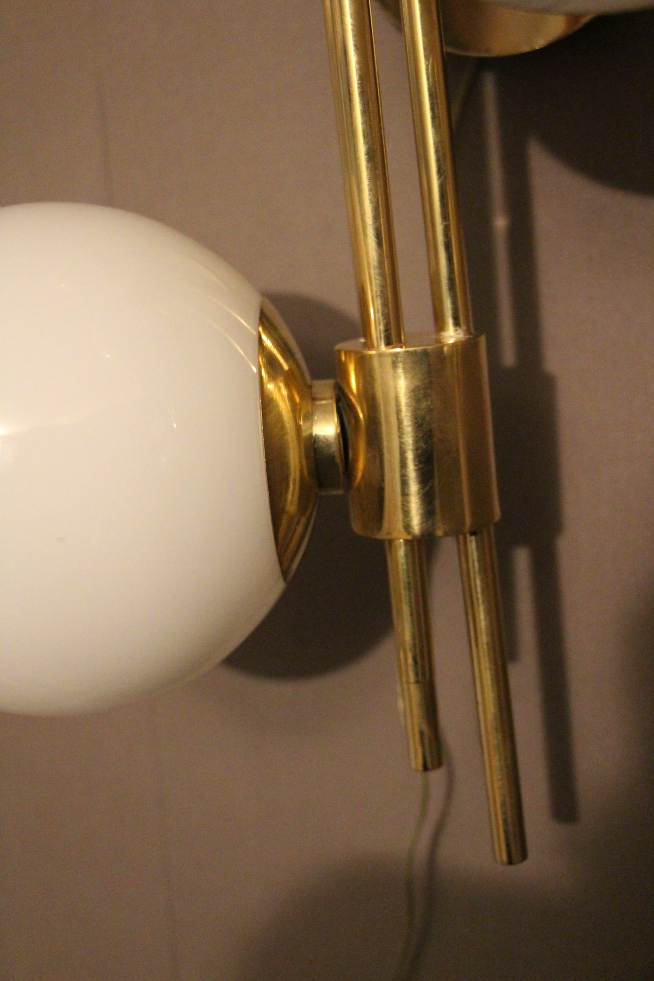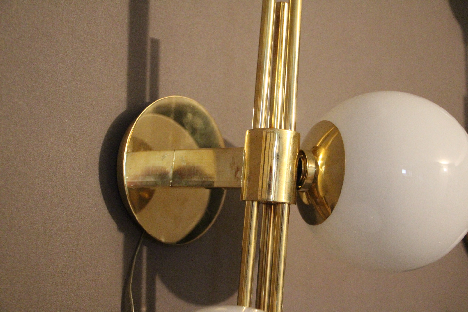 Cette très belle paire d’appliques vintage verticales en laiton doré comporte 3 globes blancs en verre de Murano. Sa structure est joliment ouvragée. La nature asymétrique de cette paire en fait une pièce unique, ajoutant un charme distinctif et un caractère affirmé à tout espace qu’elles habiteront.