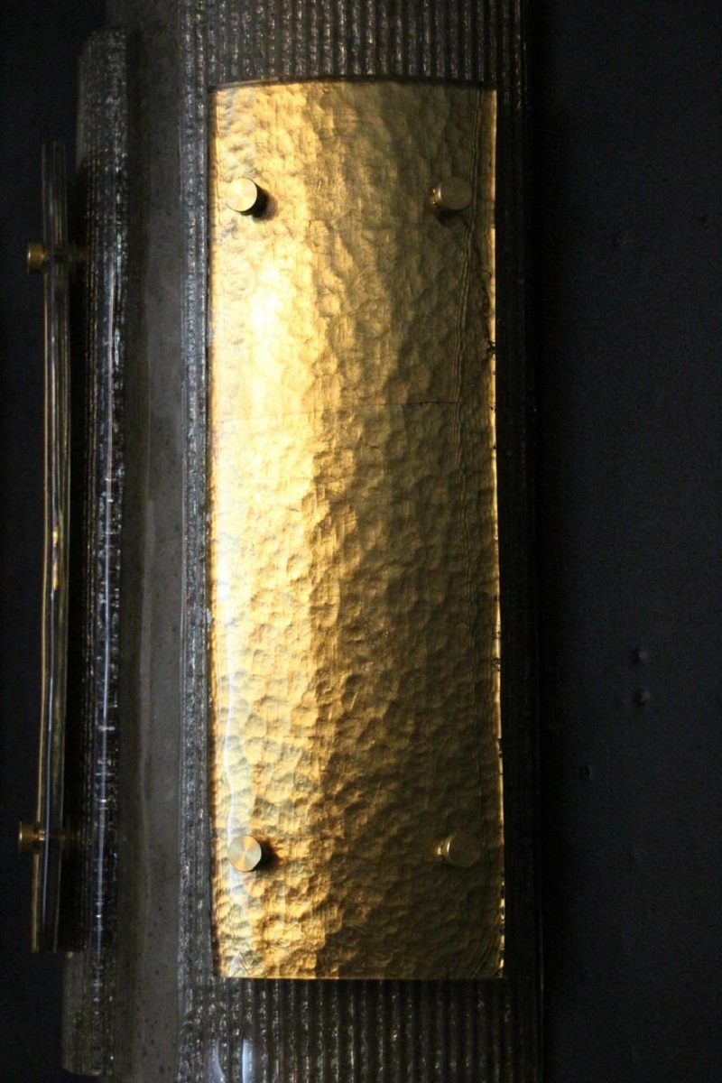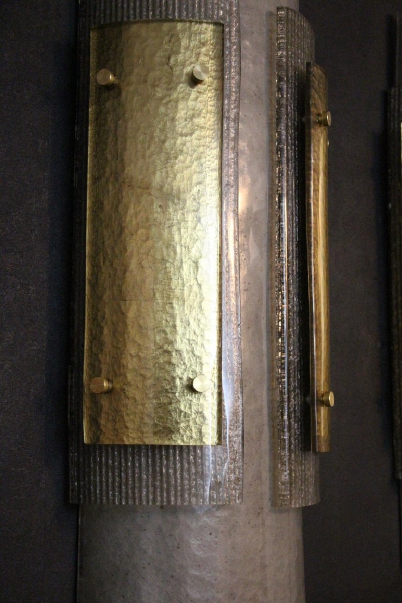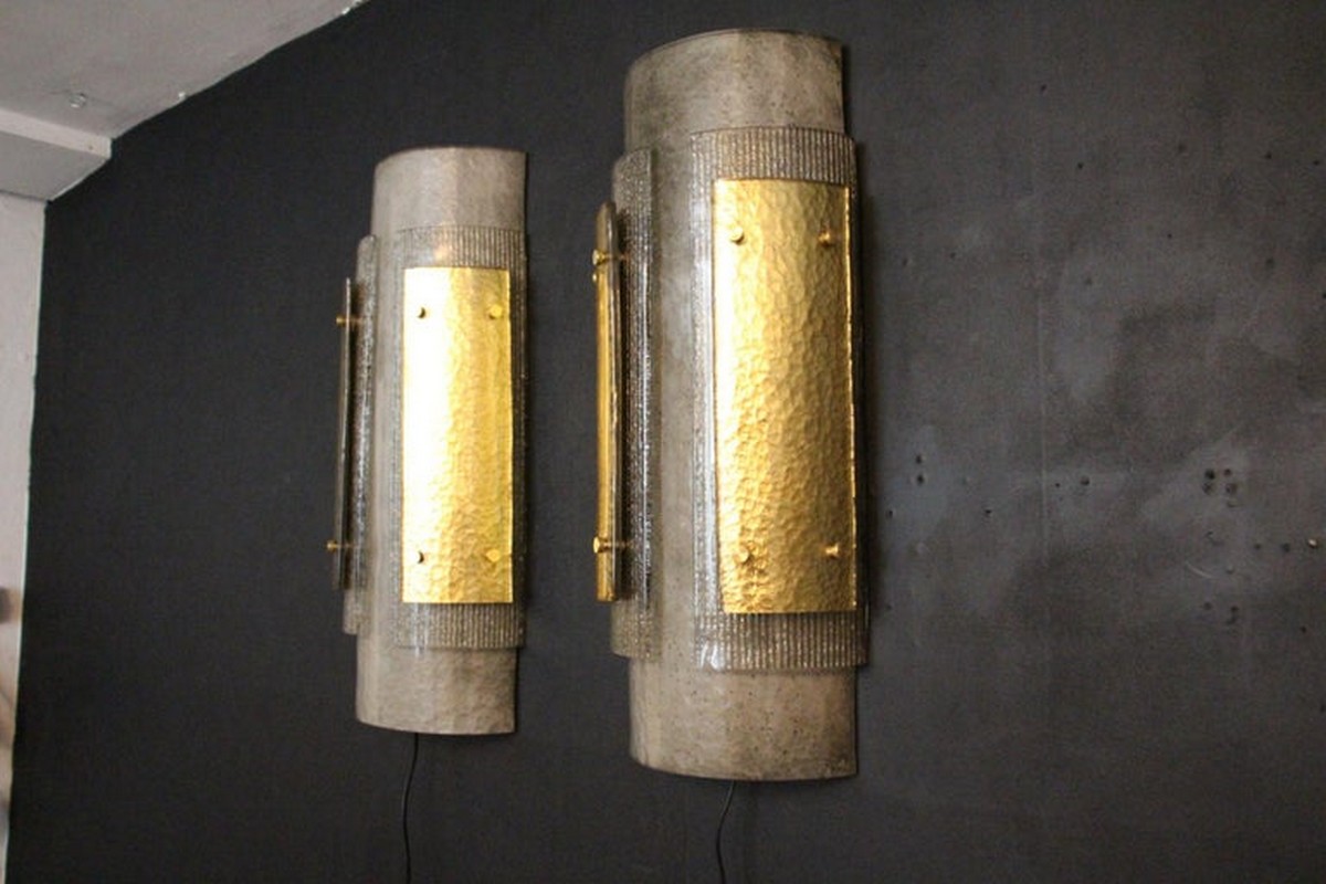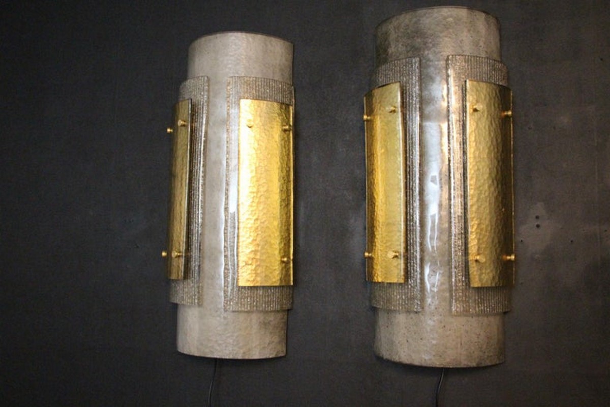 Cette grandes appliques murales modernes impressionnante d’appliques en verre de Murano est vraiment inhabituelle. En effet, ils sont constitués de 3 couches de verre plié, l’une fixée sur l’autre grâce à 2 goujons en laiton.