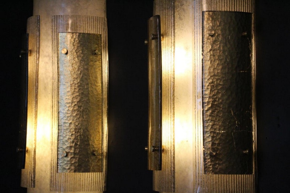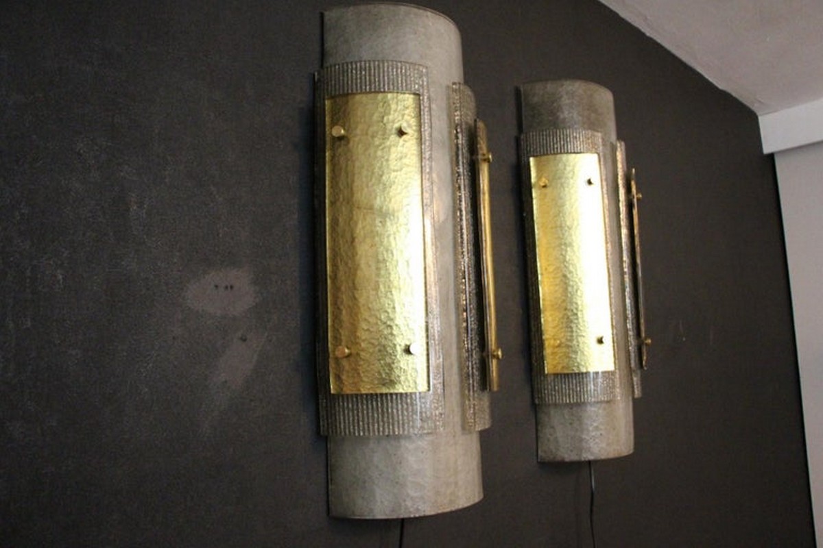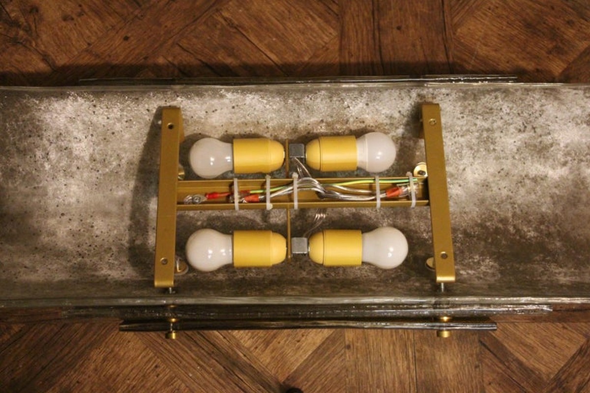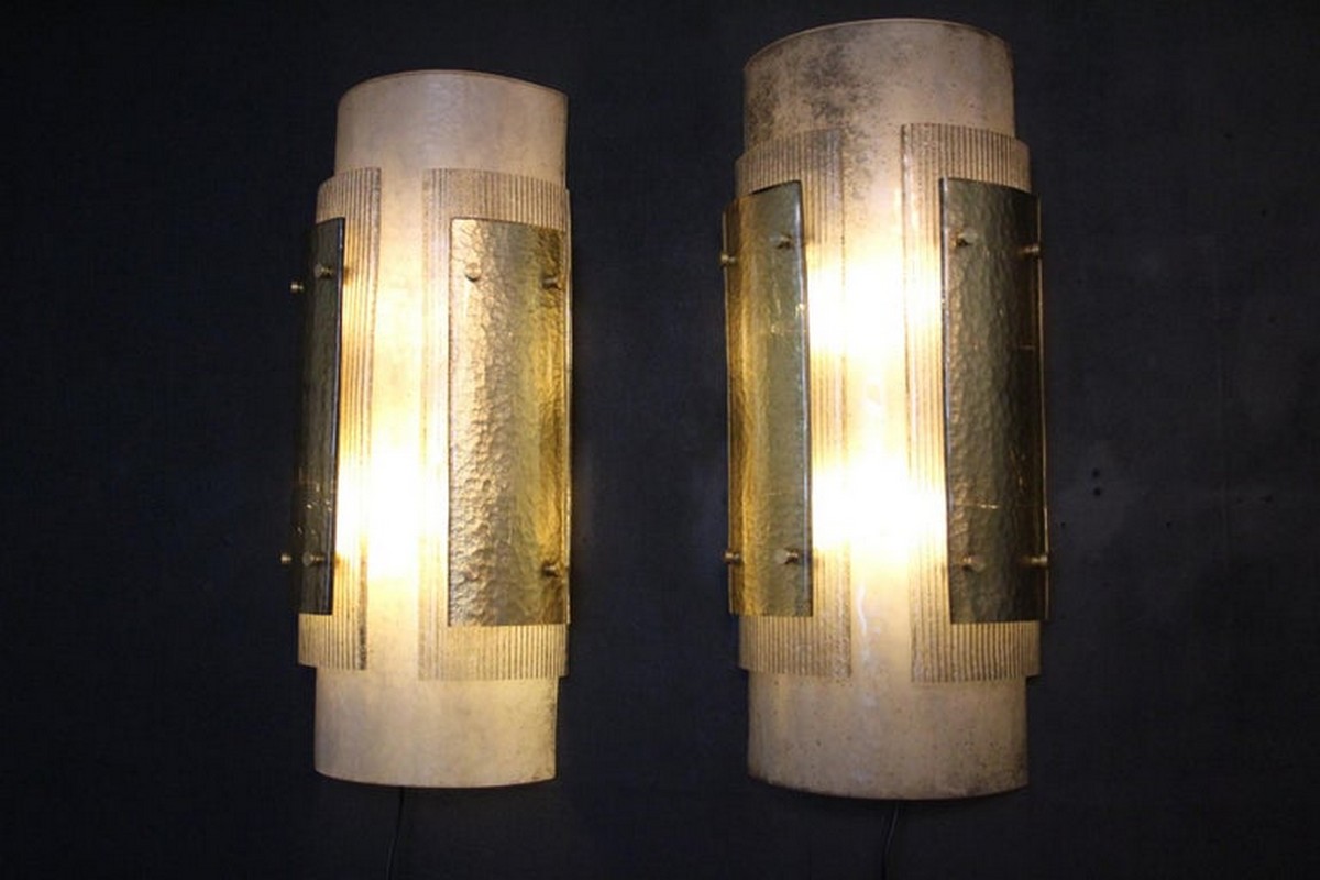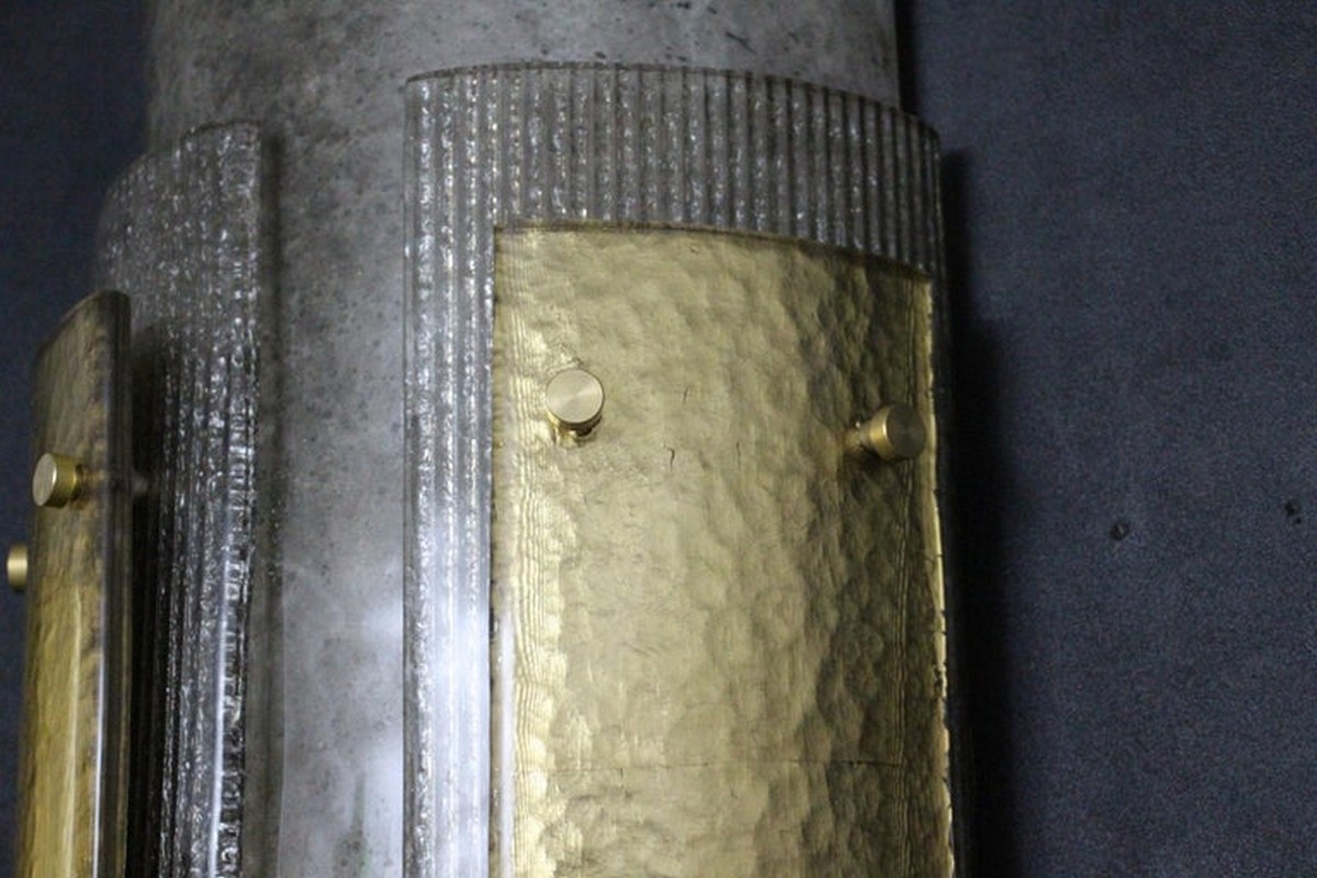 Cette grandes appliques murales modernes impressionnante d’appliques en verre de Murano est vraiment inhabituelle. En effet, ils sont constitués de 3 couches de verre plié, l’une fixée sur l’autre grâce à 2 goujons en laiton.