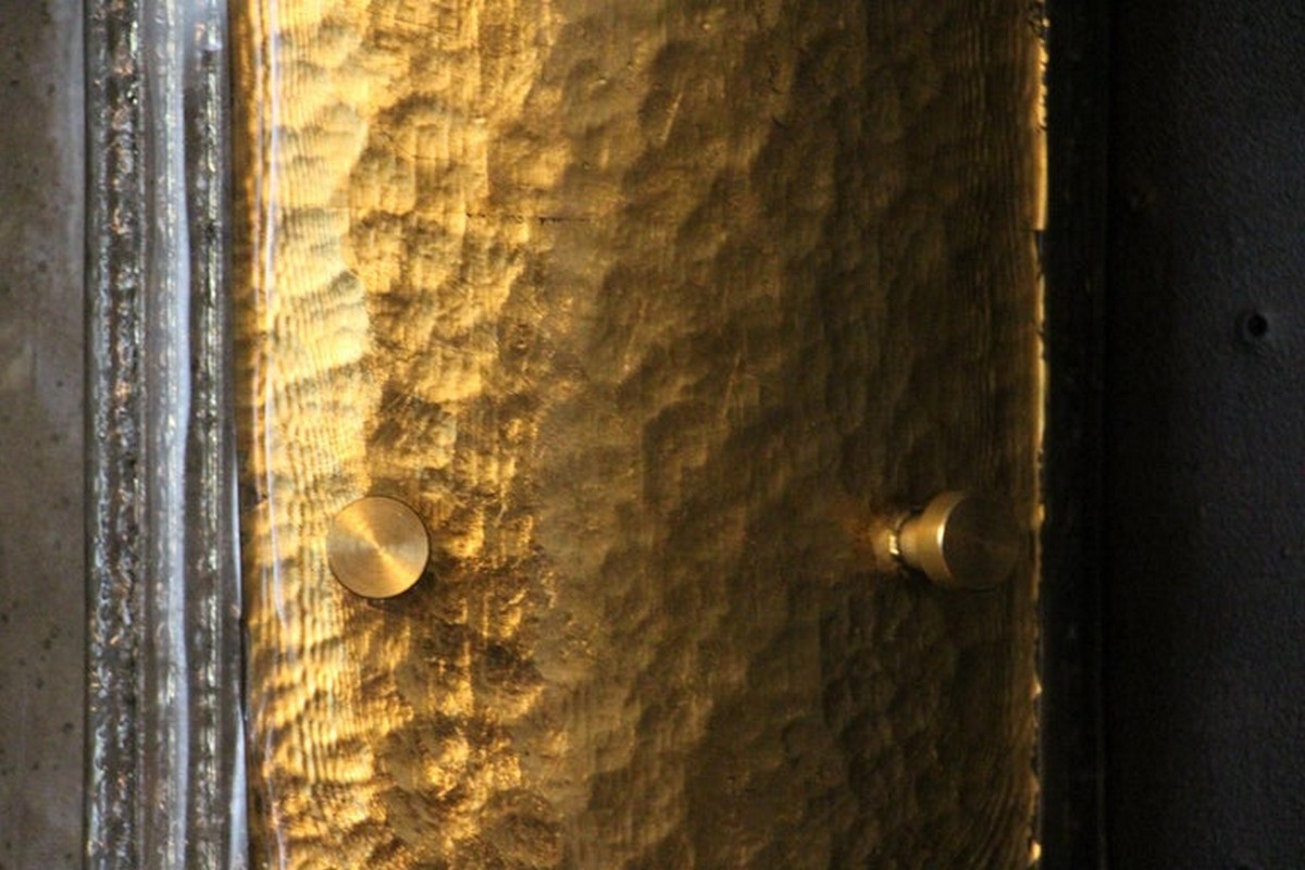 La pièce supérieure est entièrement en verre texturé à la feuille d’or, celle d’en dessous est en verre côtelé fumé gris et la dernière est en verre marbré gris. Chaque pièce de verre a été fabriquée individuellement à la main à Murano, et le résultat est absolument époustouflant !