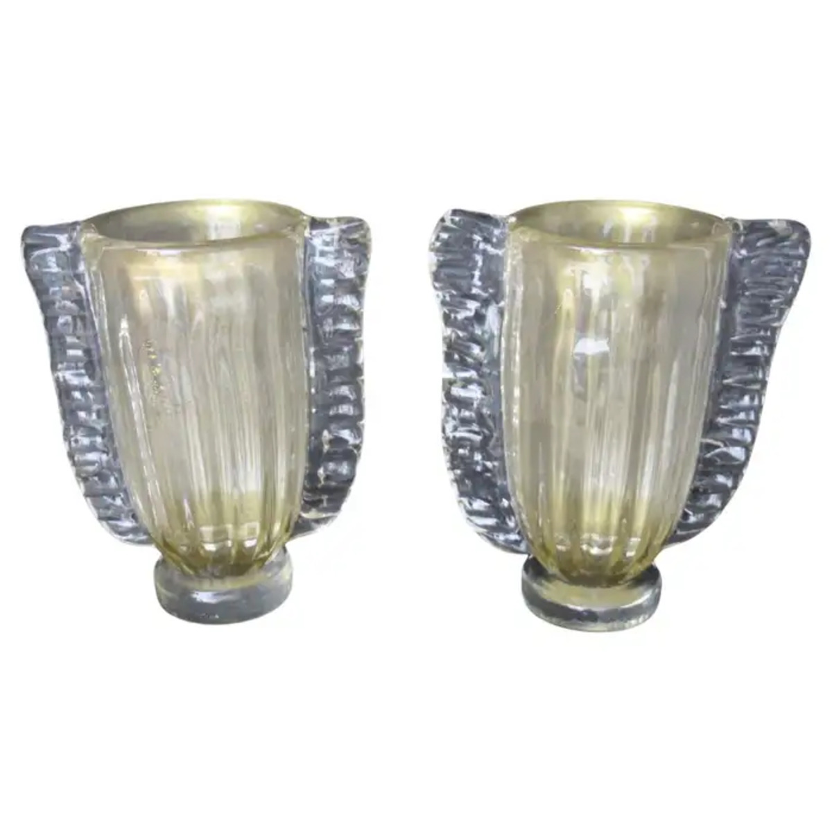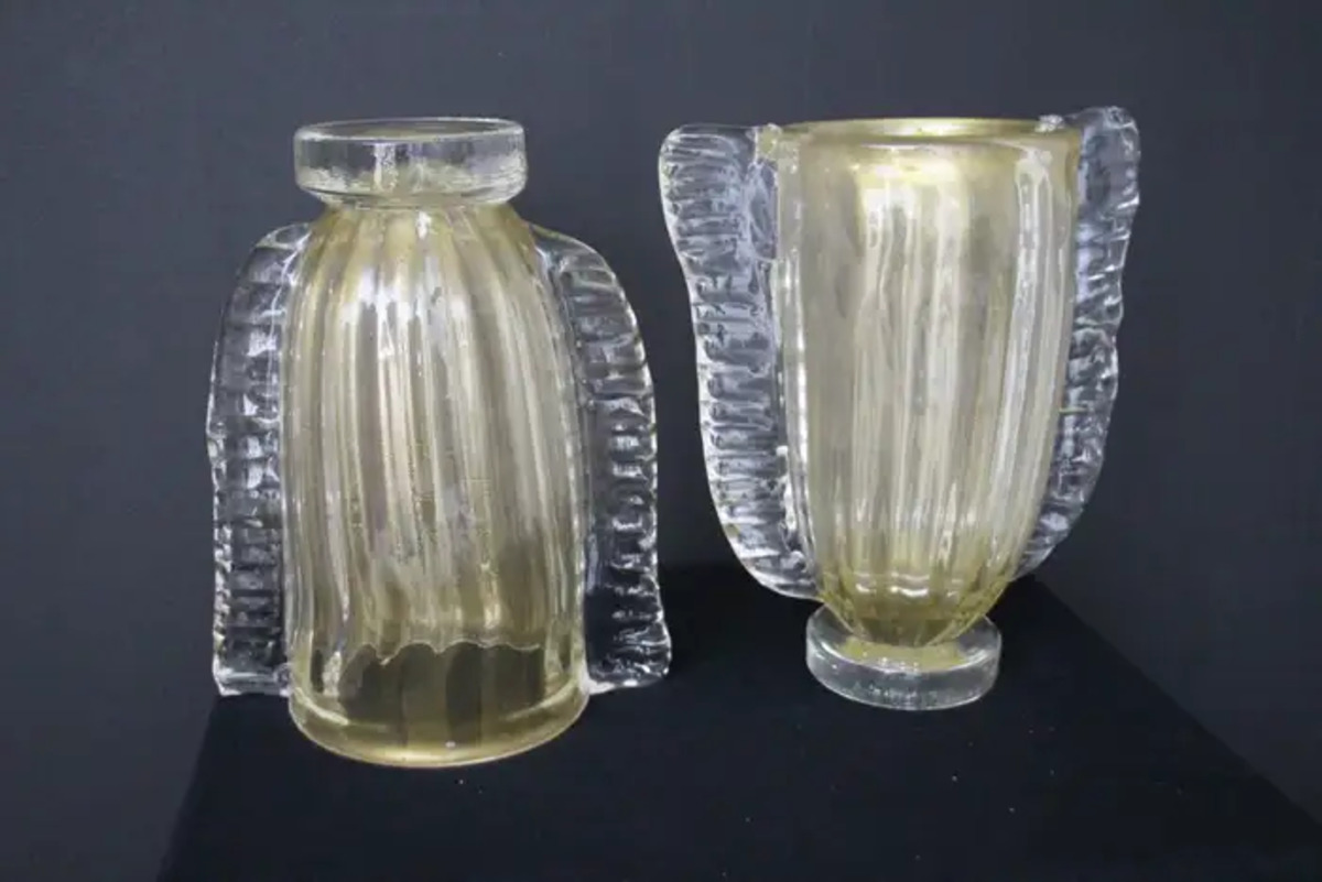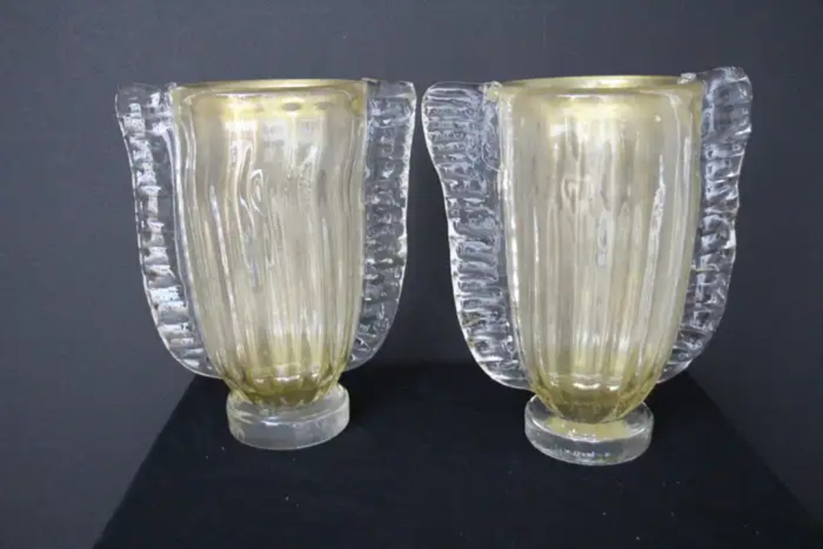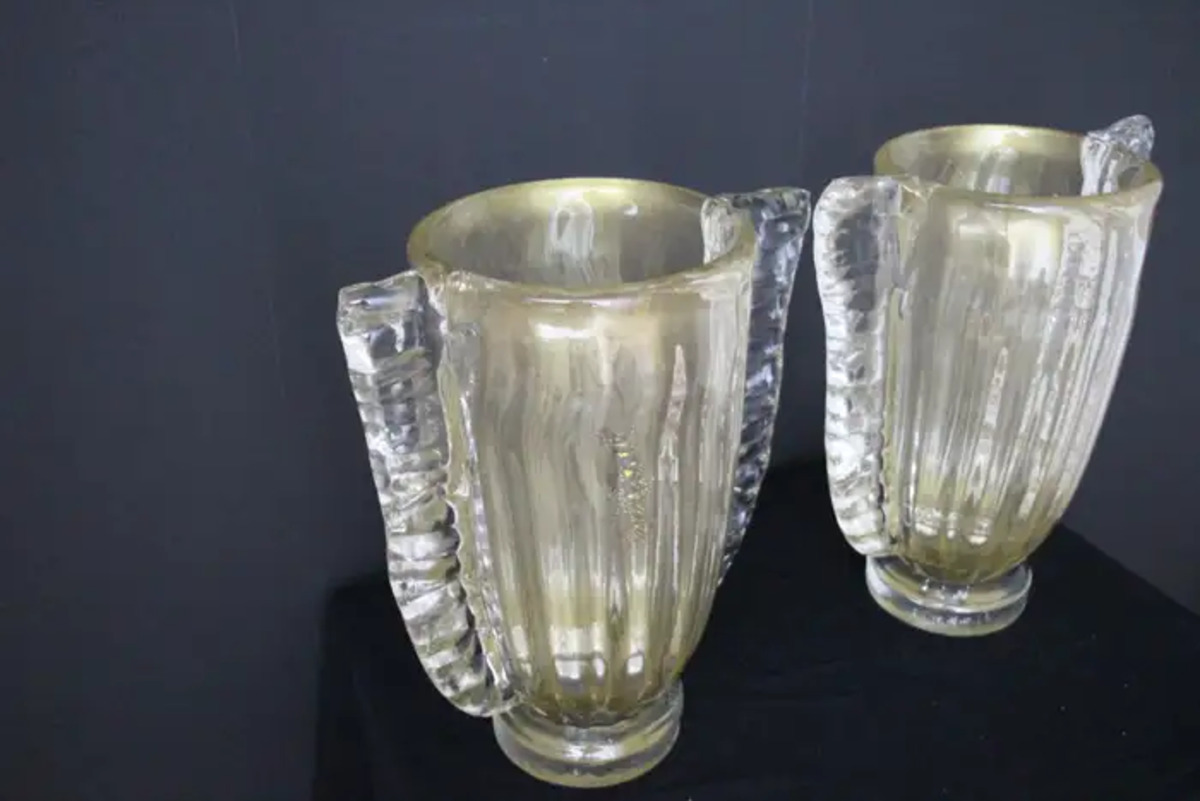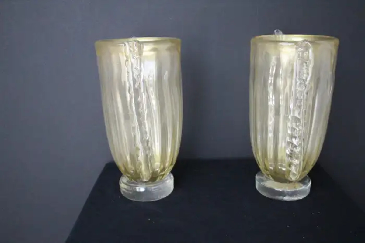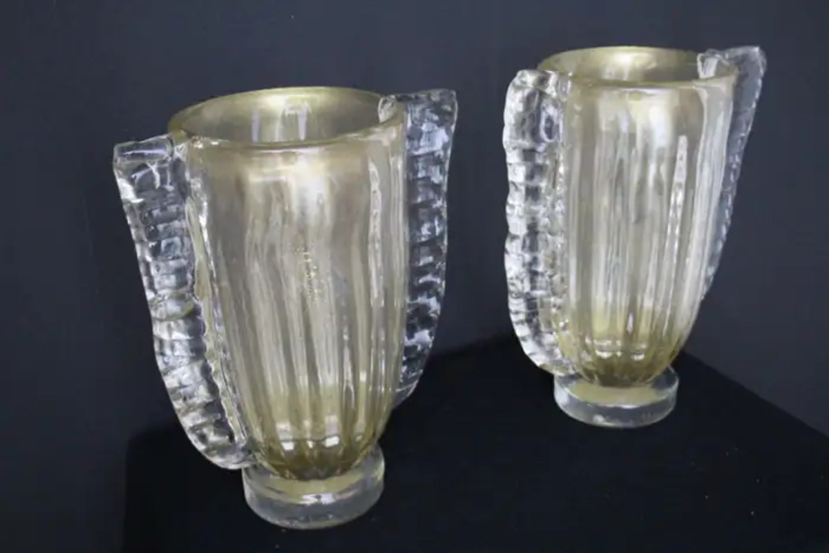 Cette paire de vases Italiens spectaculaires a une couleur dorée très inhabituelle en fonction des couleurs et de la lumière environnantes. Cet effet spécial est dû à de profondes inclusions de poussière d’or dans le verre.