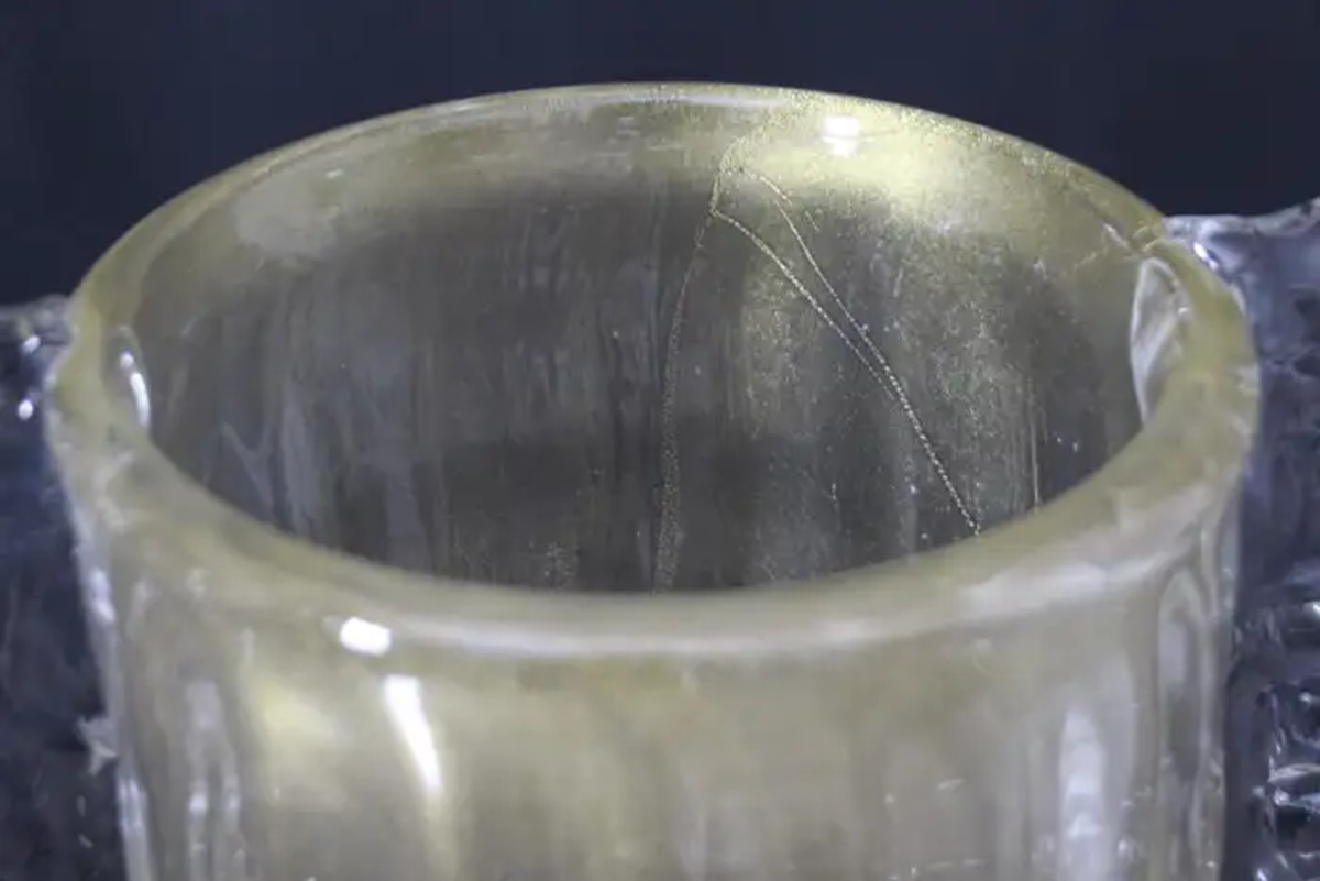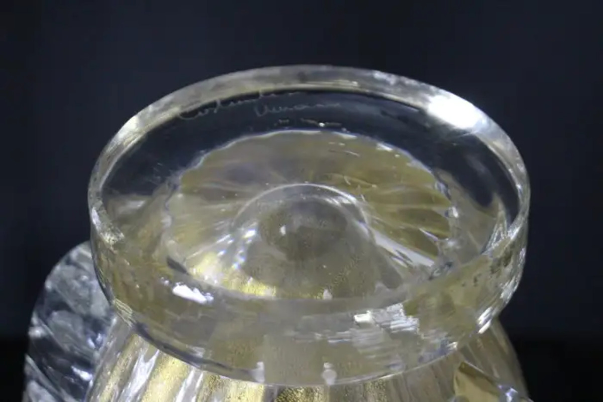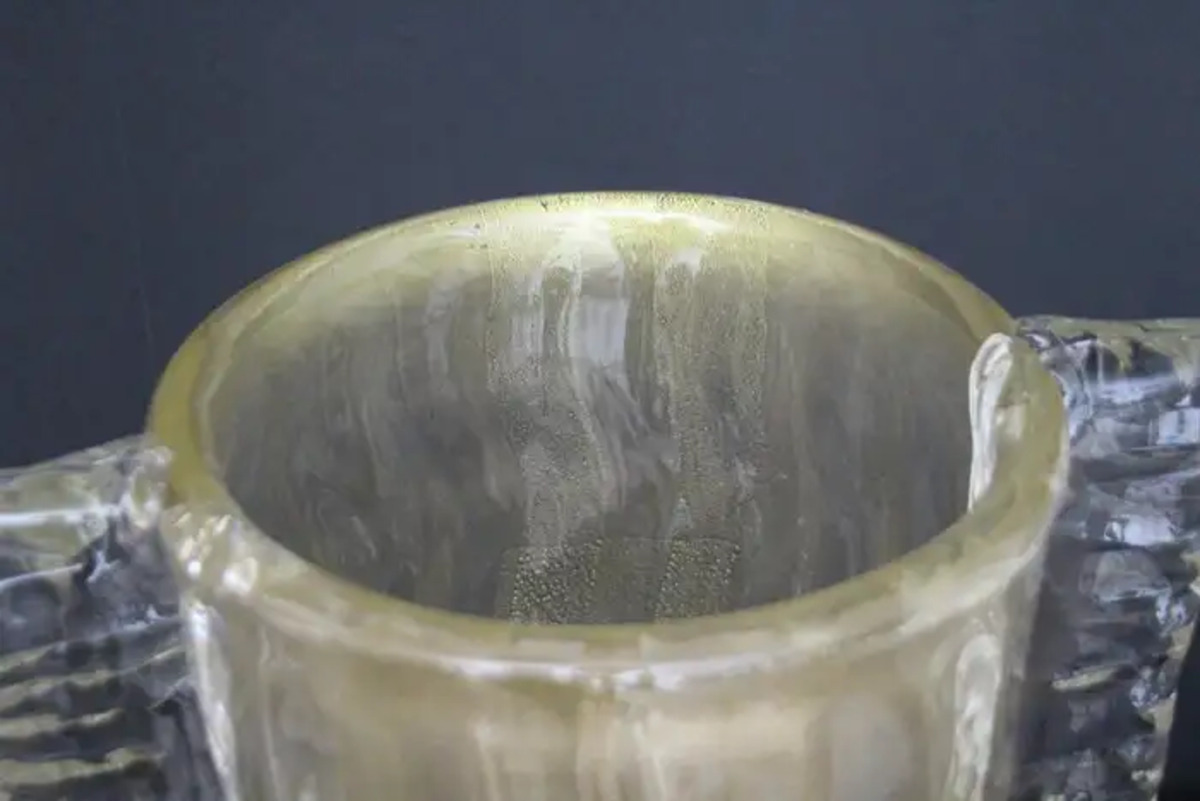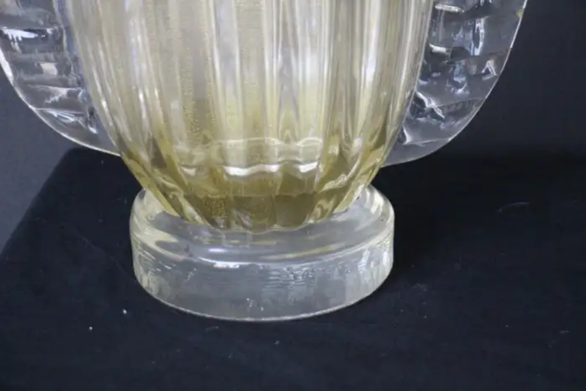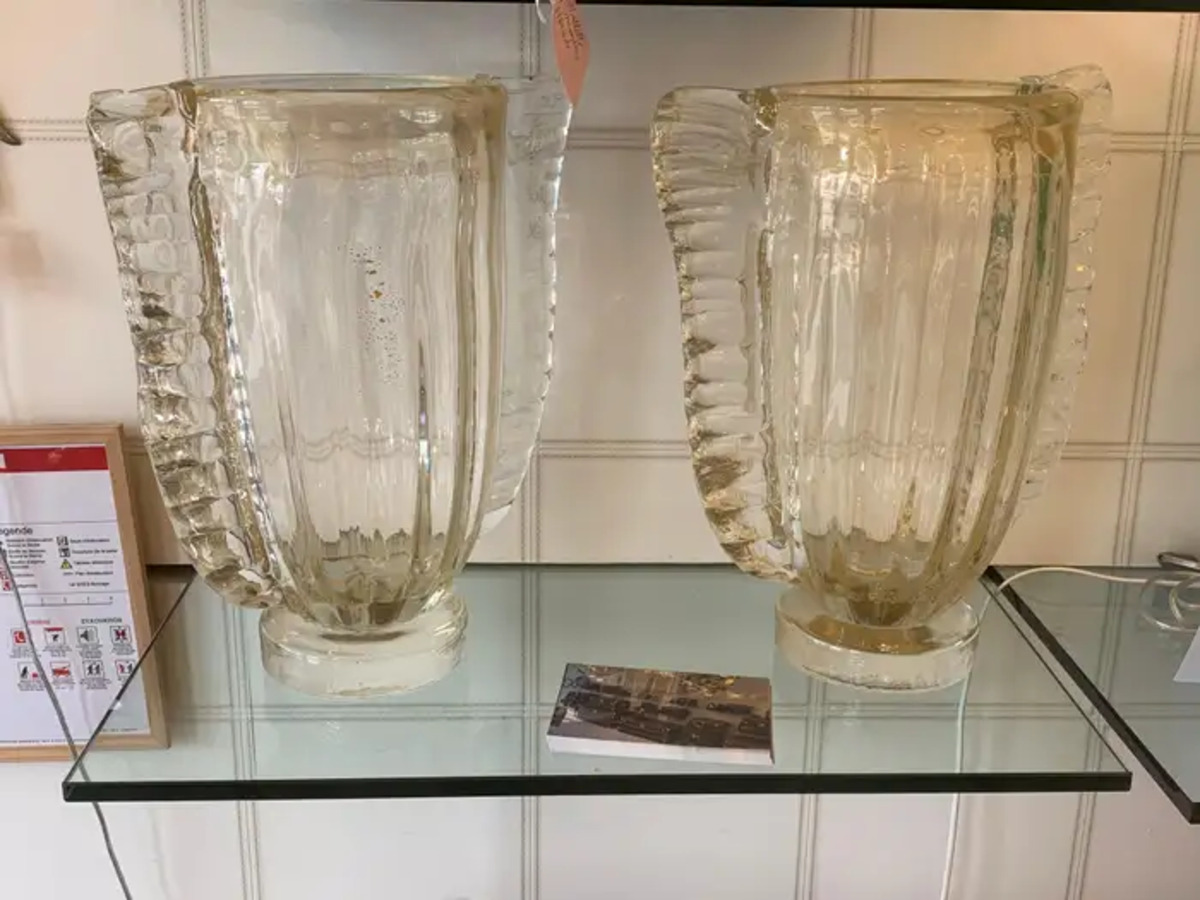 Cette paire de vases Italiens spectaculaires a une couleur dorée très inhabituelle en fonction des couleurs et de la lumière environnantes. Cet effet spécial est dû à de profondes inclusions de poussière d’or dans le verre.