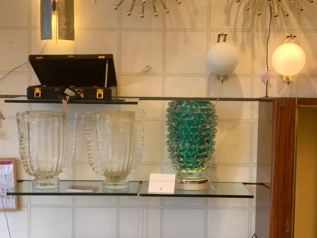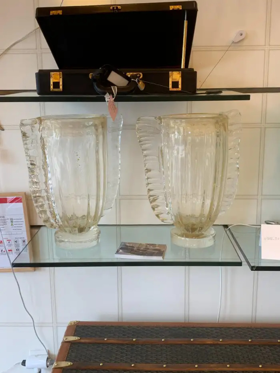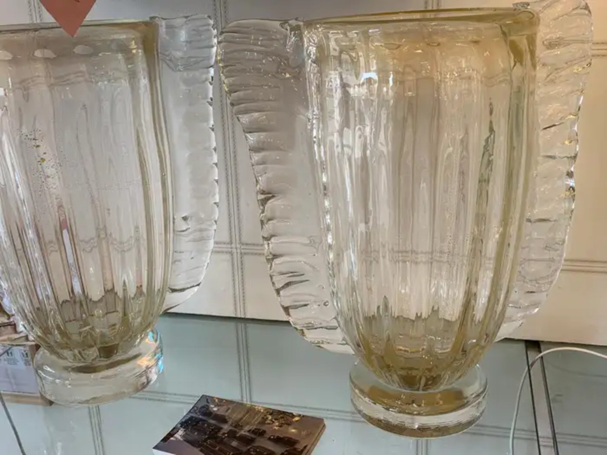 De chaque côté, ils présentent de généreuses festons de verre de couleur cristal. Leurs festons ressemblent à des ailes stylisées et leur donnent une allure aérienne. De plus, ils ont été entièrement réalisés à la main à Venise, y compris leurs larges festons latéraux pour un effet très vivant…