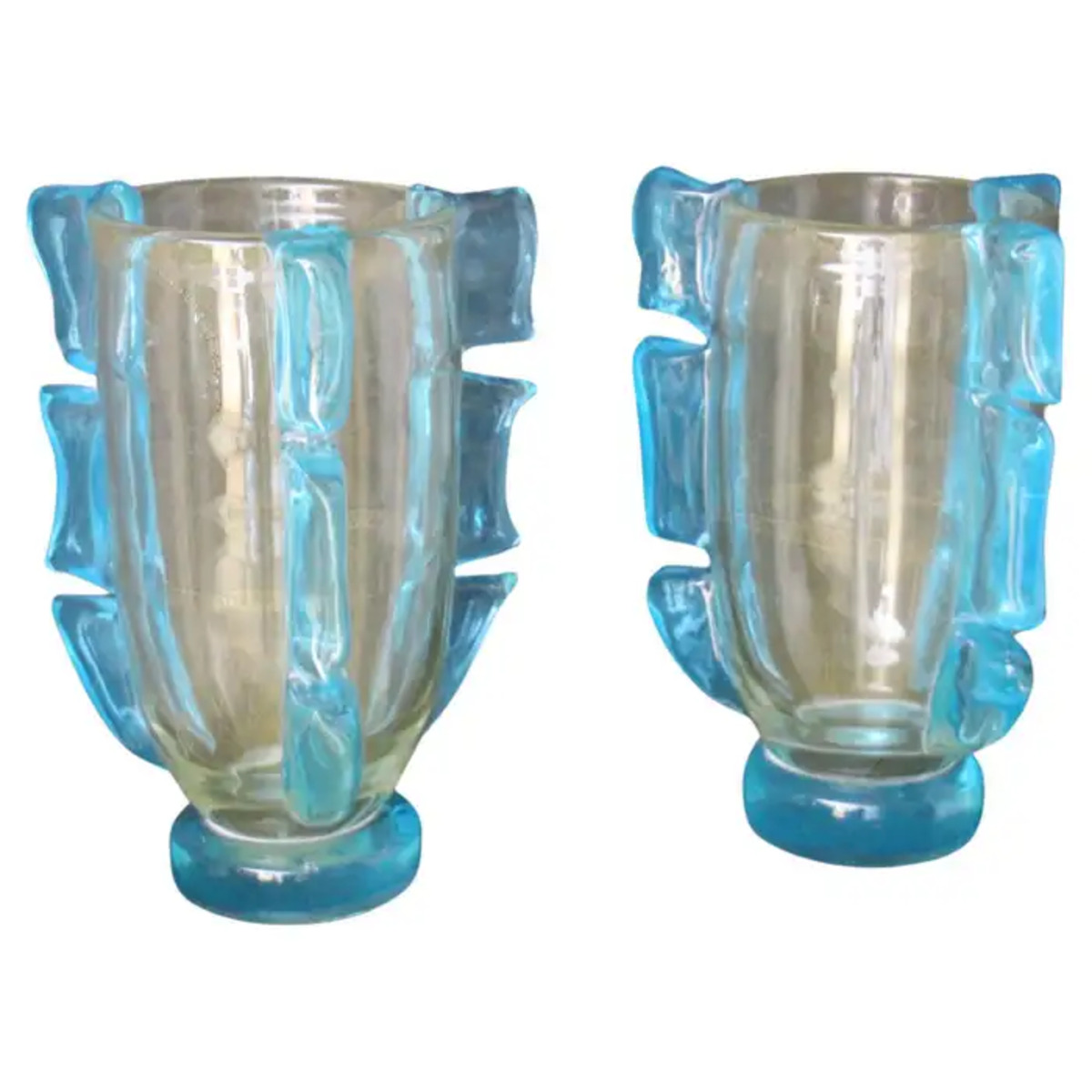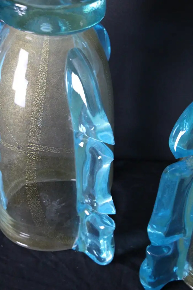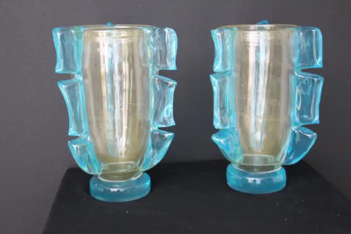 Elles sont composées de 3 généreux festons en verre bleu turquoise, qui ressemblent à des ailes stylisées et leur donnent une allure aérienne. Leur base est également en verre bleu.