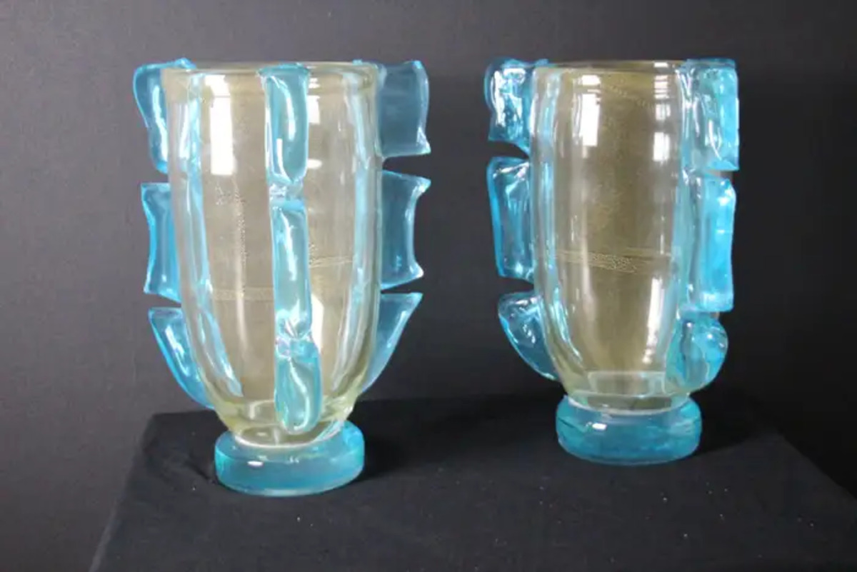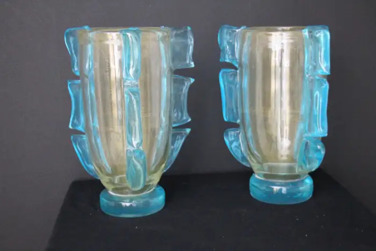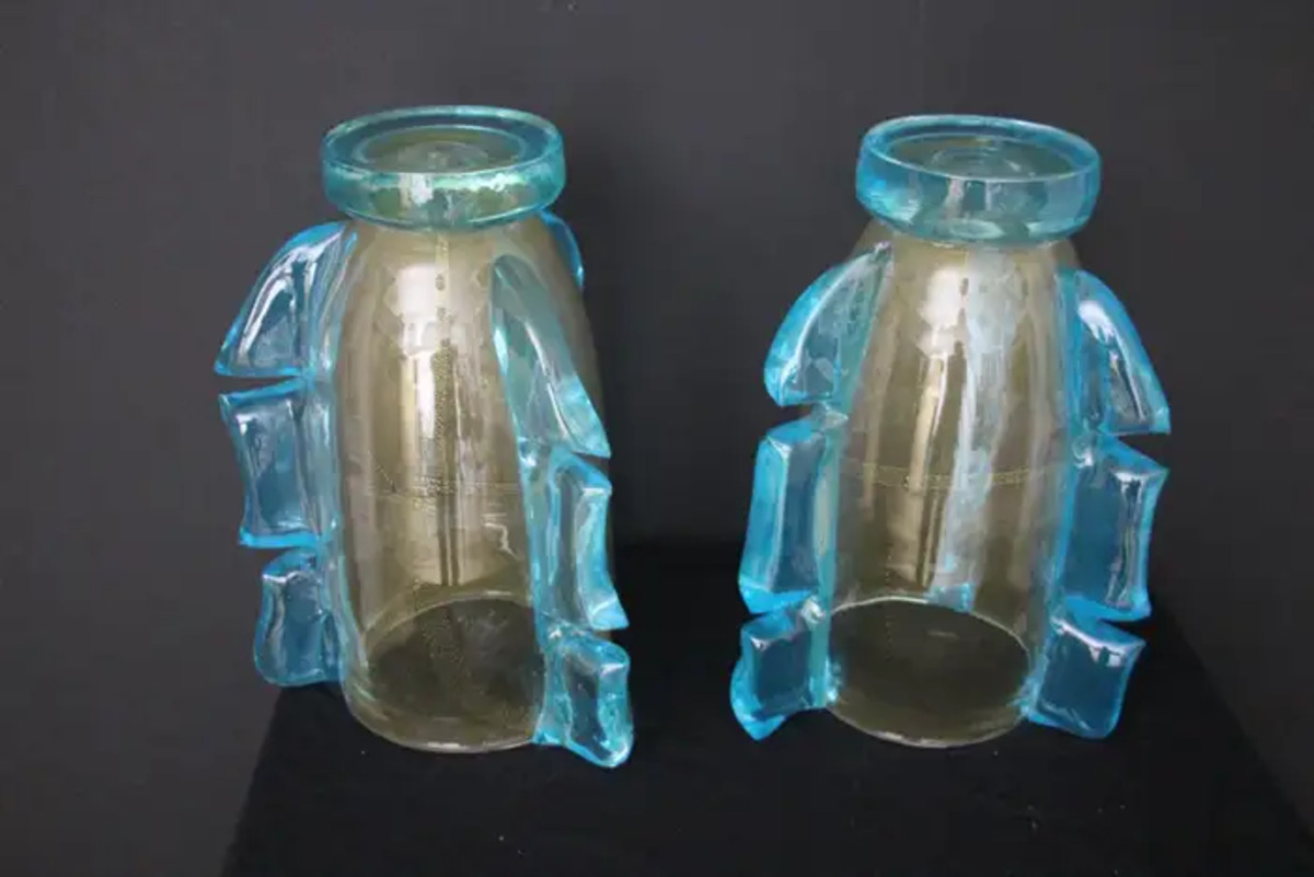 Cette paire de vases spectaculaires a une couleur dorée très inhabituelle en fonction des couleurs et de la lumière environnantes. Cet effet spécial est dû à de profondes inclusions de poussière d’or dans le verre.