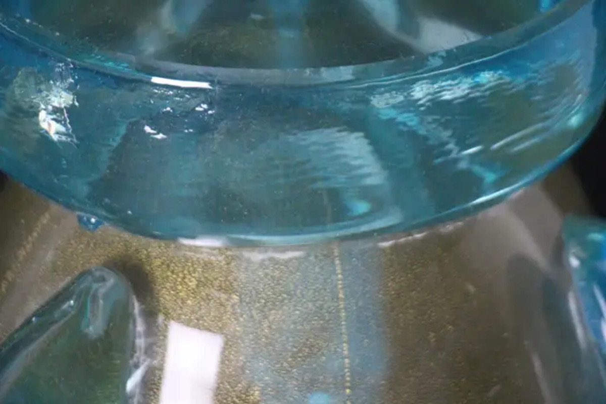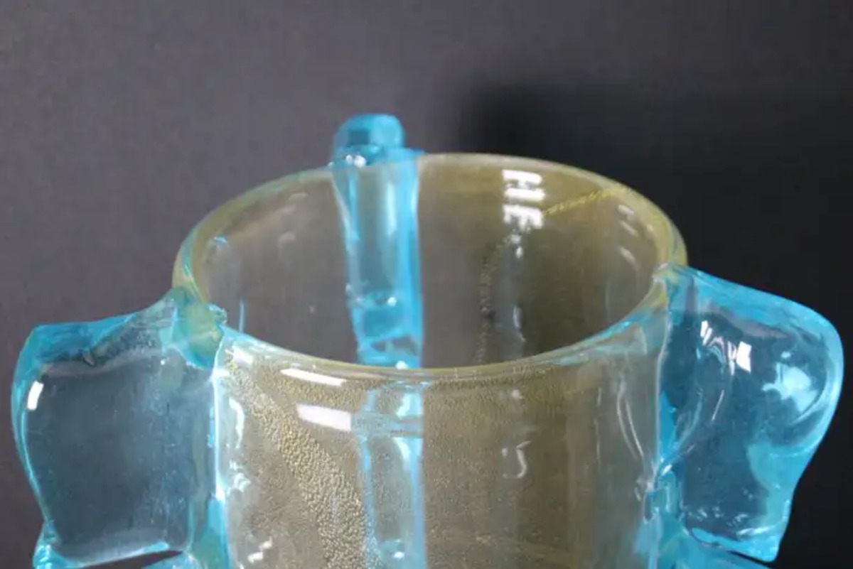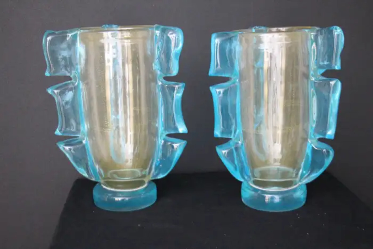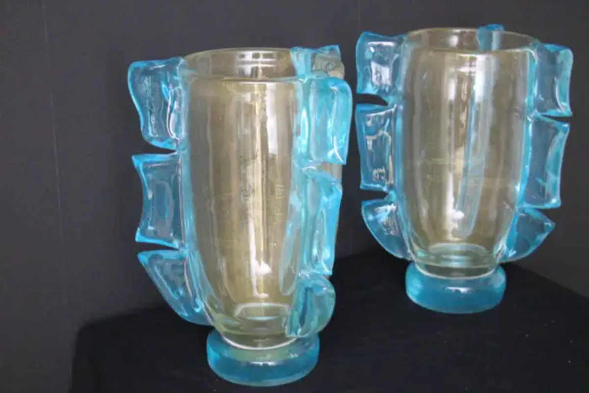 Cette paire de vases spectaculaires a une couleur dorée très inhabituelle en fonction des couleurs et de la lumière environnantes. Cet effet spécial est dû à de profondes inclusions de poussière d’or dans le verre.