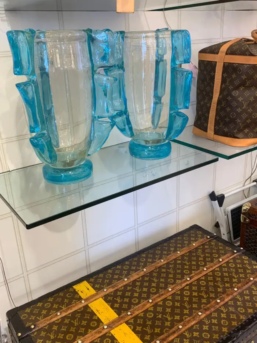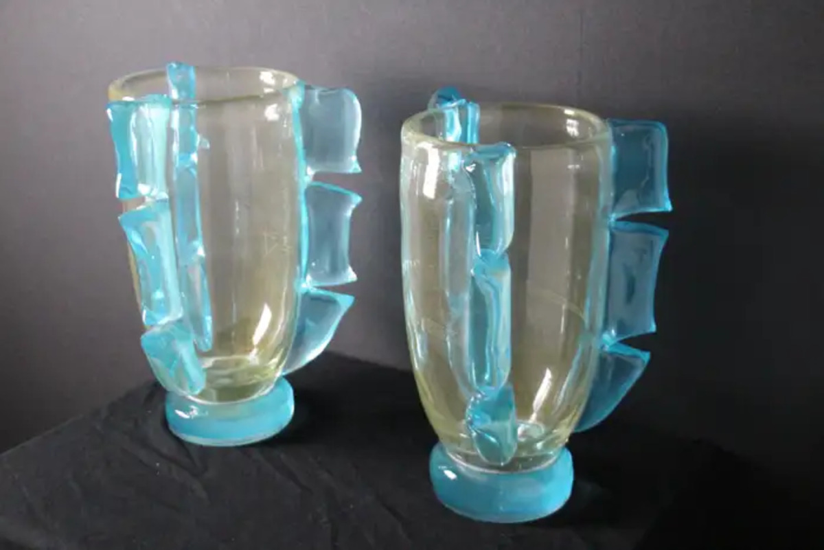 Ces vases en verre bleu turquoise s’adaptent à tous les styles d’intérieurs, qu’il s’agisse de l’art déco, du classique, du milieu du siècle, du moderne ou du contemporain.