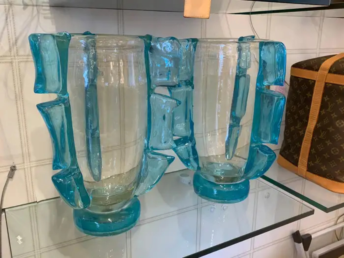 De plus, ils ont été entièrement réalisés à la main à Venise, y compris leurs larges festons latéraux pour un effet très vivant… Chaque vase pèse environ 15 kg. Ces vases sont bien plus beaux en vrai que sur les photos…