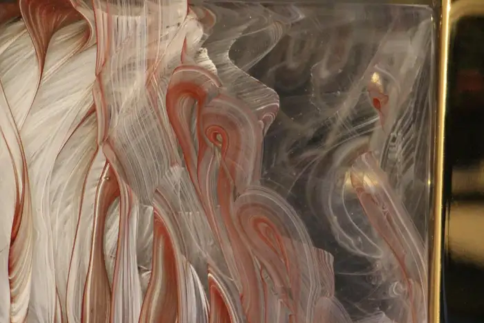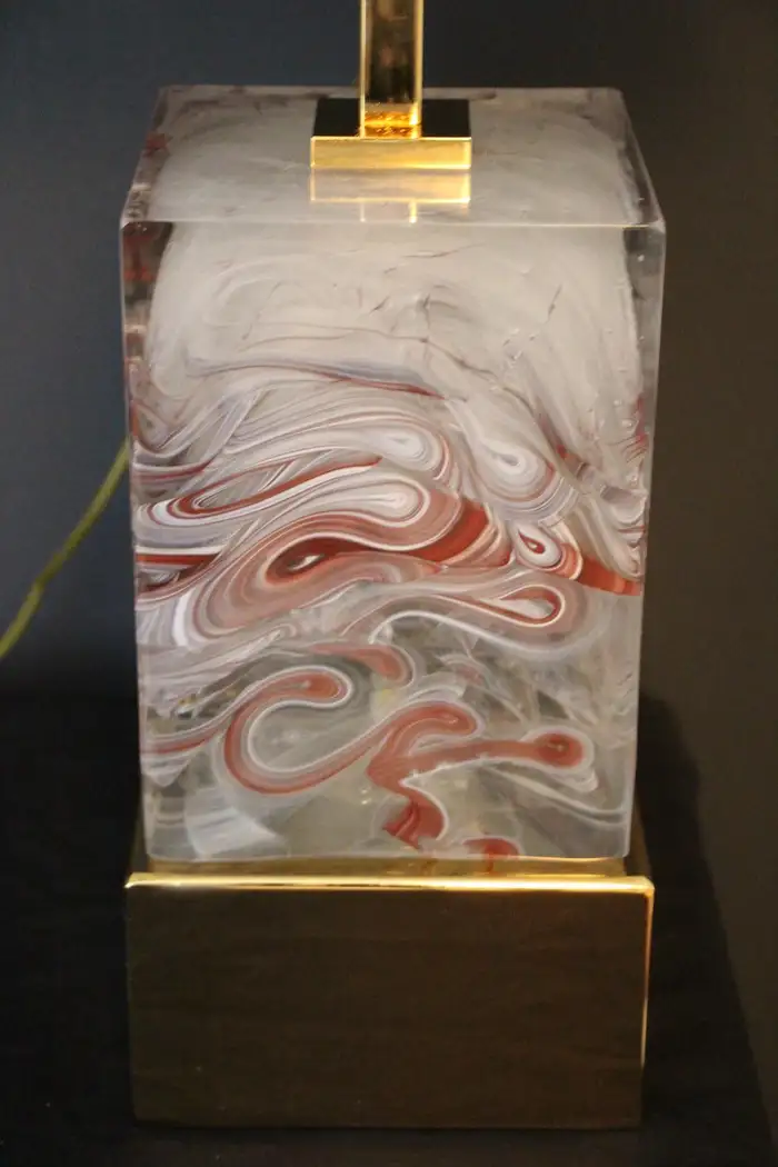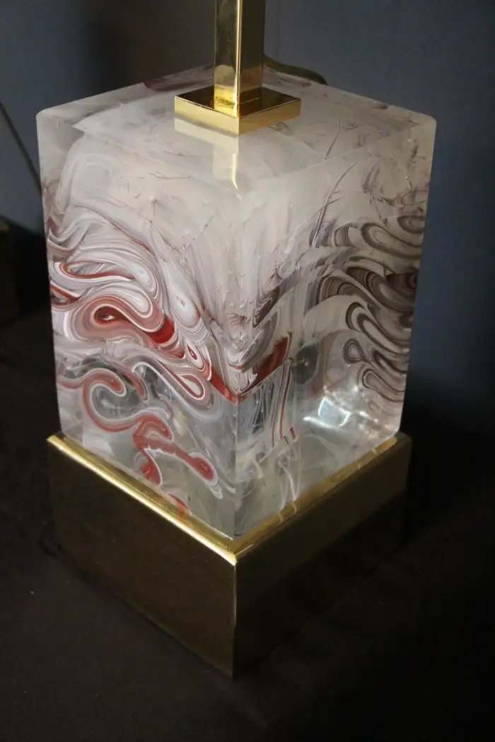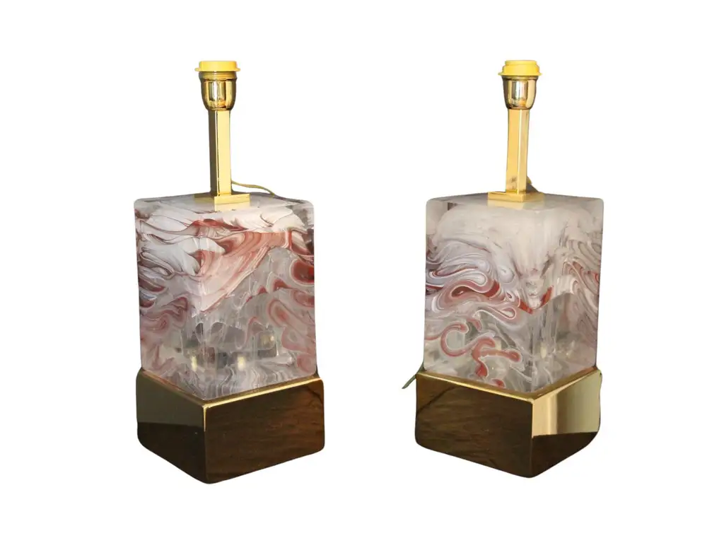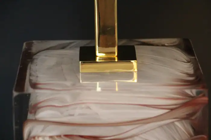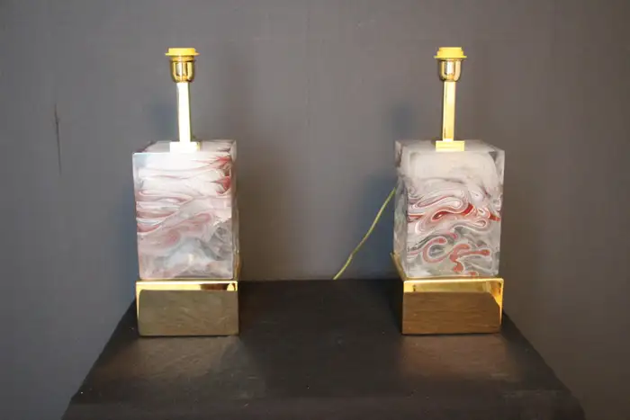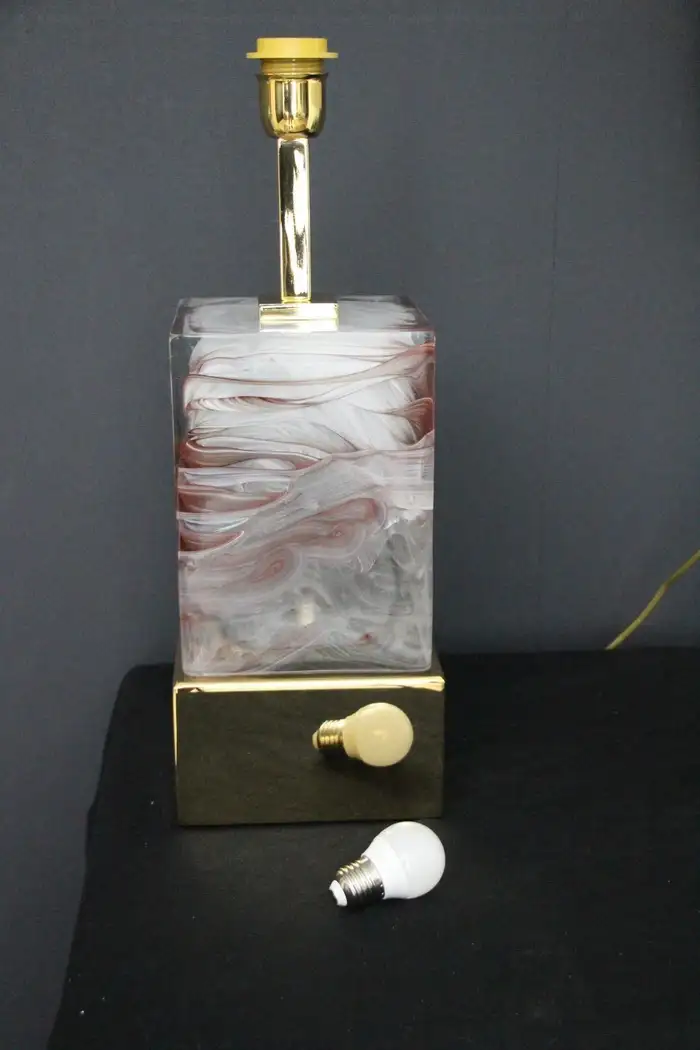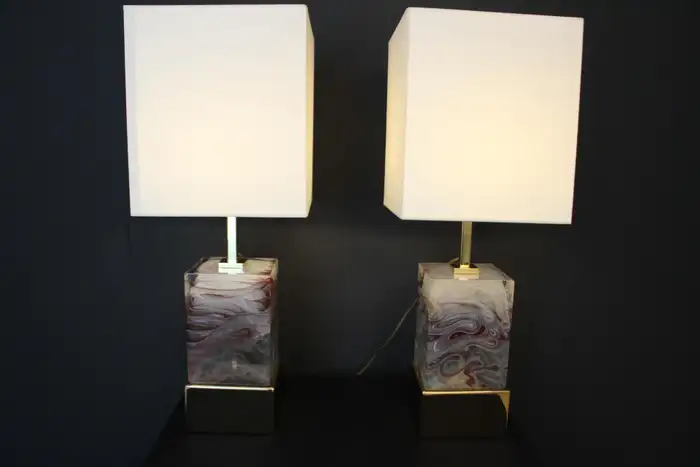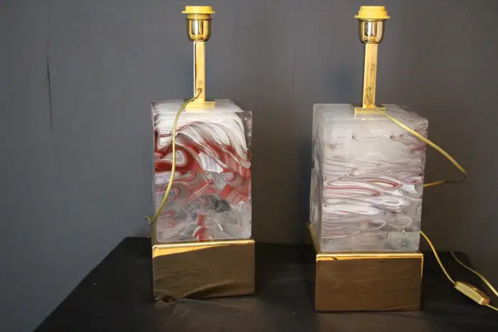 Cette impressionnante paire de lampes de table de Murano est fabriquée à partir de blocs massifs de verre brun-bordeaux, offrant un volume exceptionnel de 18 cm. Chaque lampe est une véritable œuvre d’art, car chaque face présente un motif de volutes emprisonnées à l’intérieur, créant un design unique.