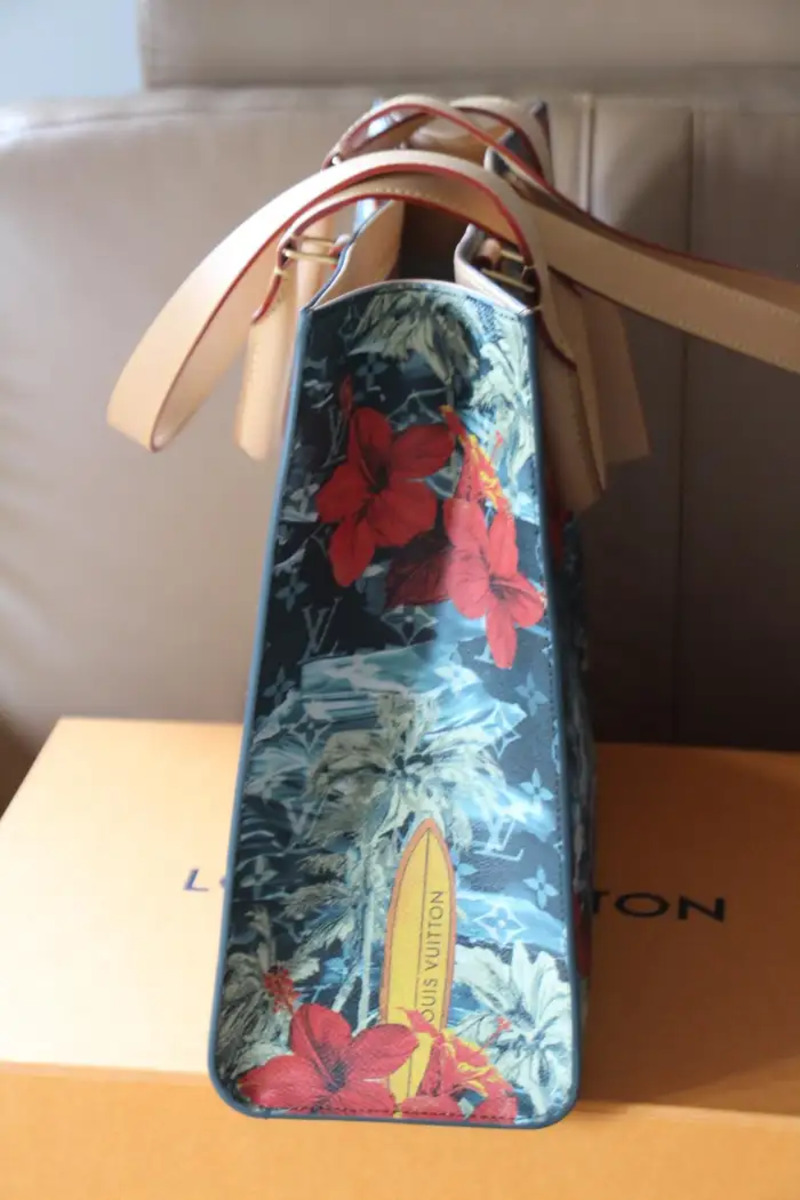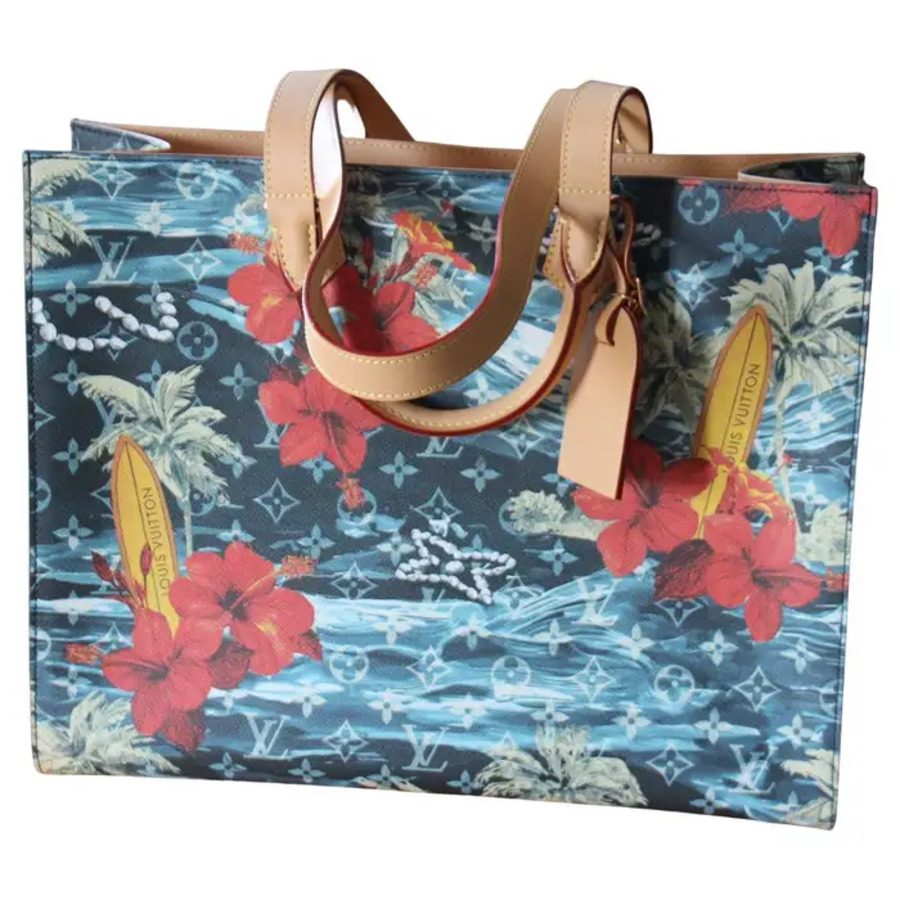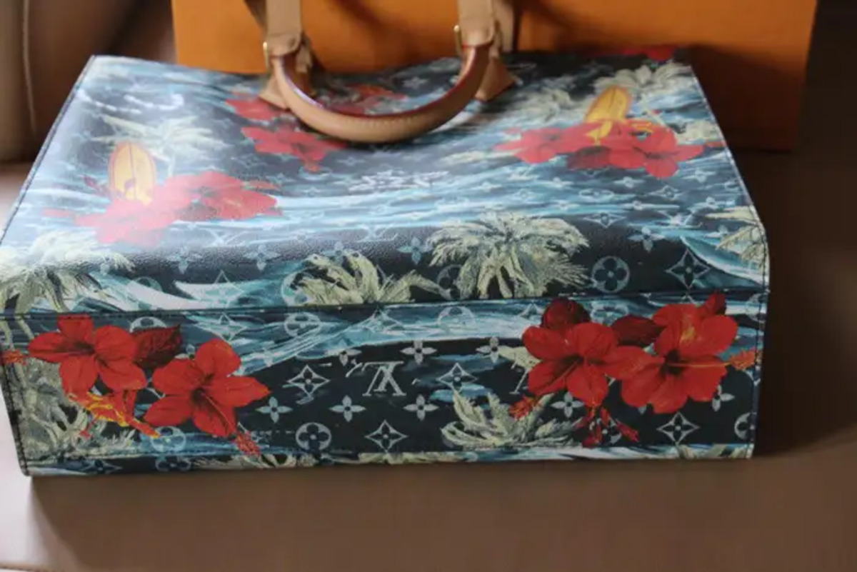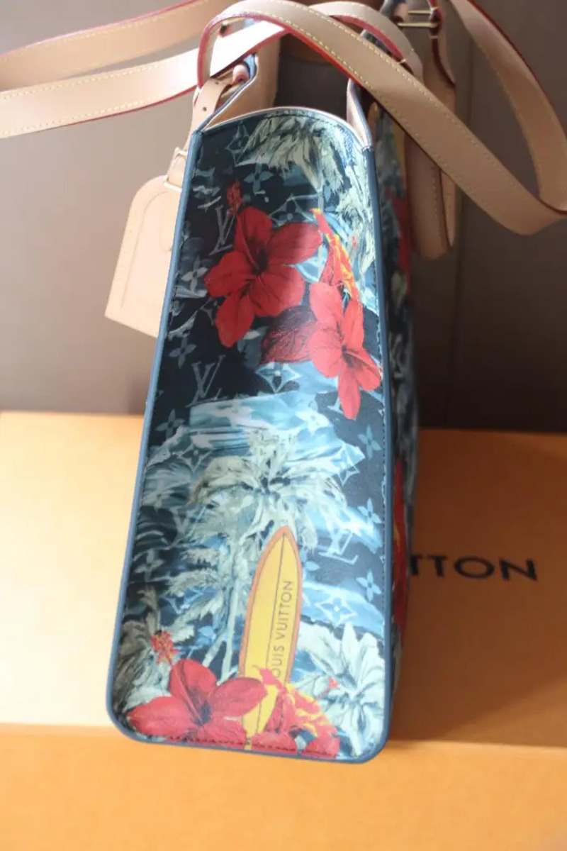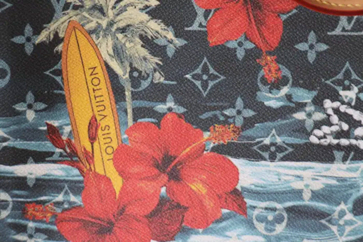 Sa toile bleu marine Monogramme Surfin’ est une toile enduite à motifs de plantes de surf et de fleures d’hibiscus rouges, des garnitures sont en cuir de vachette et sa doublure en textile ;Ses finitions sont dorées.