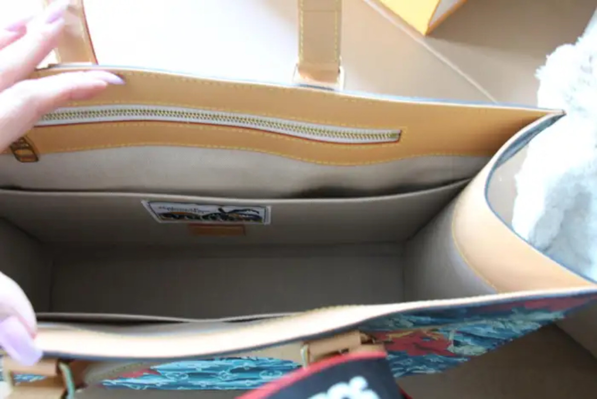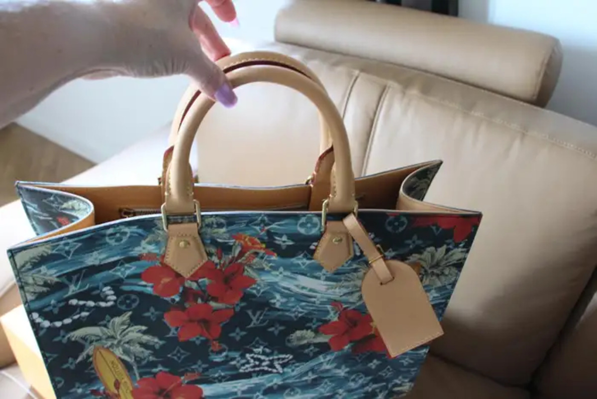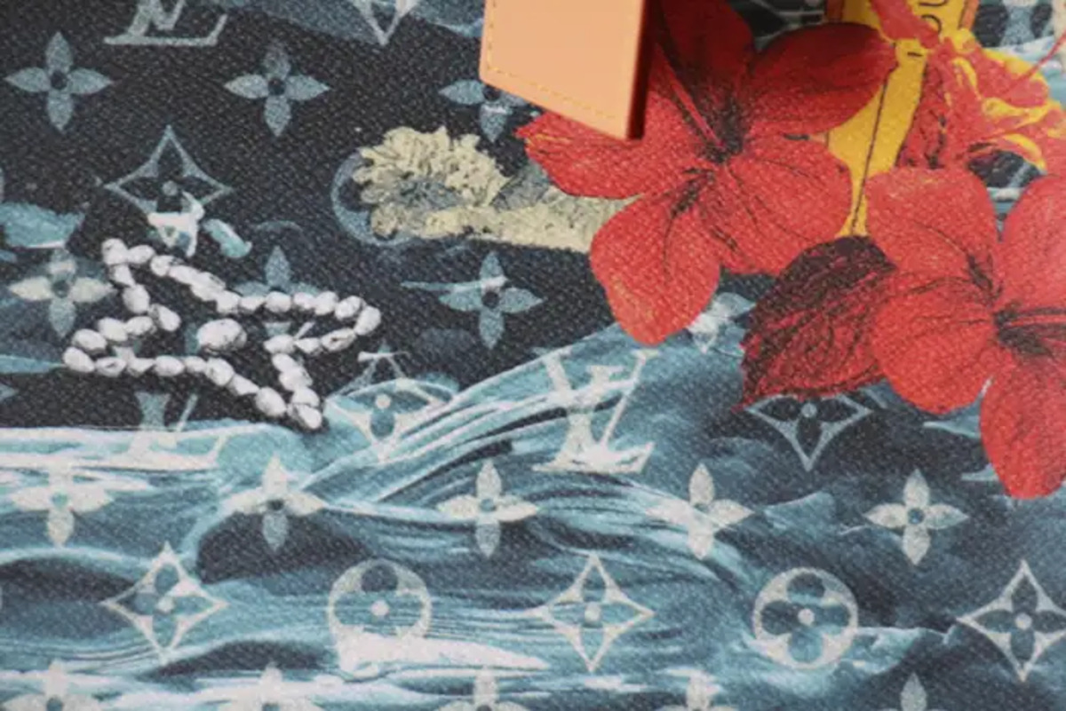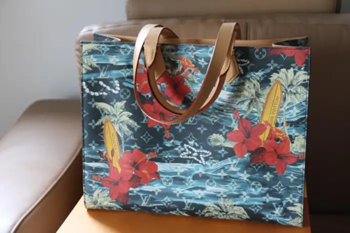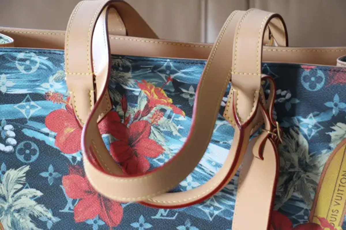 Sa toile bleu marine Monogramme Surfin’ est une toile enduite à motifs de plantes de surf et de fleures d’hibiscus rouges, des garnitures sont en cuir de vachette et sa doublure en textile ;Ses finitions sont dorées.