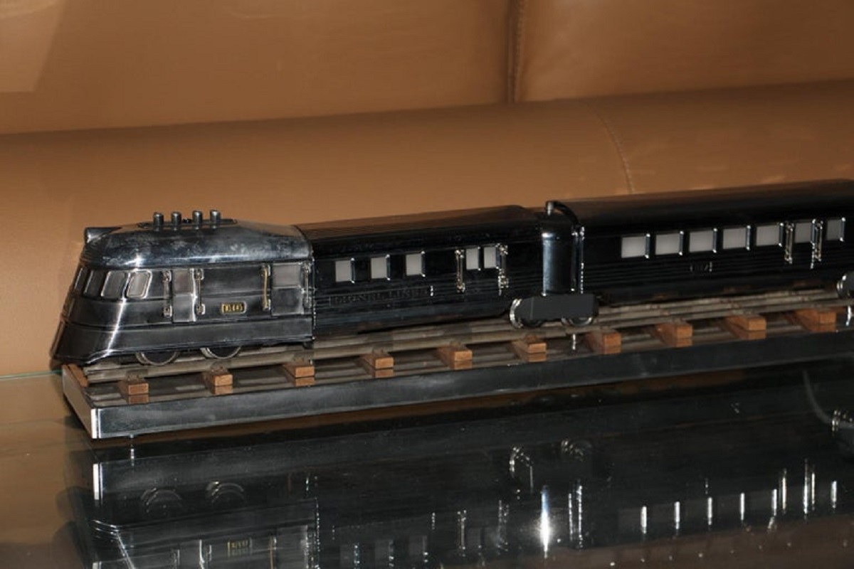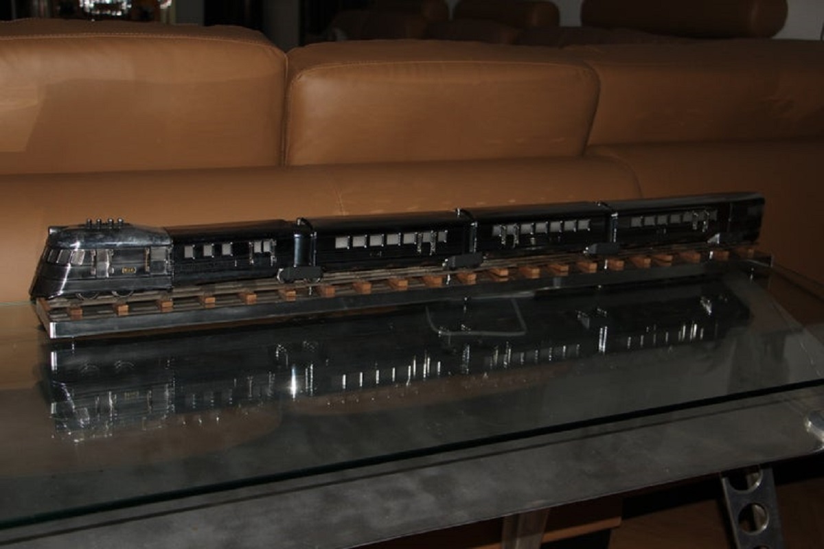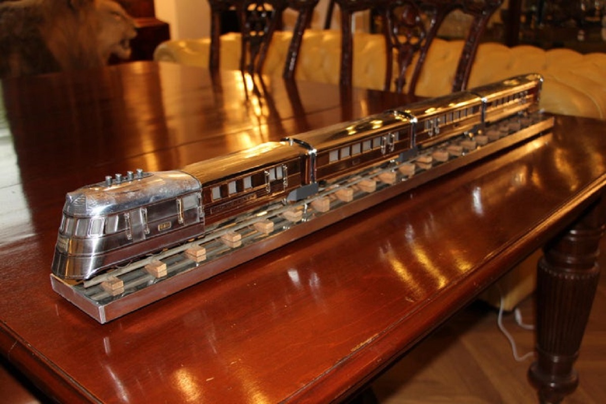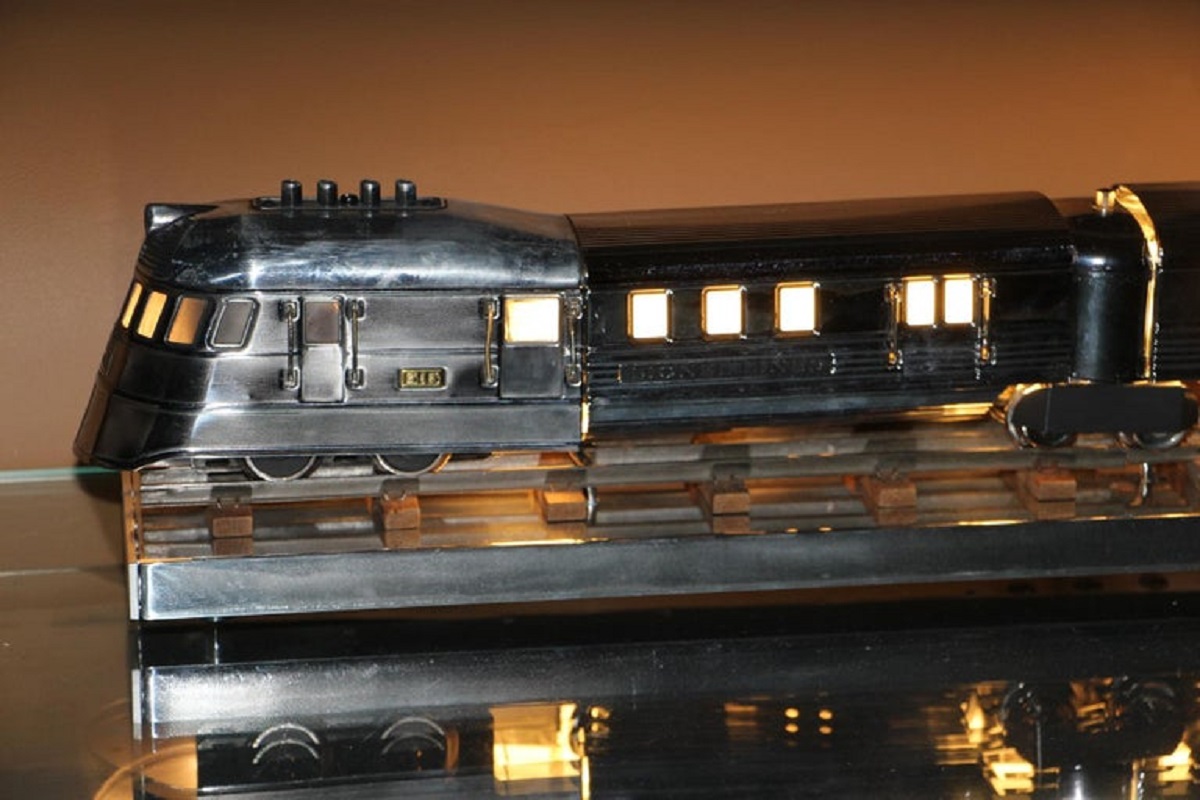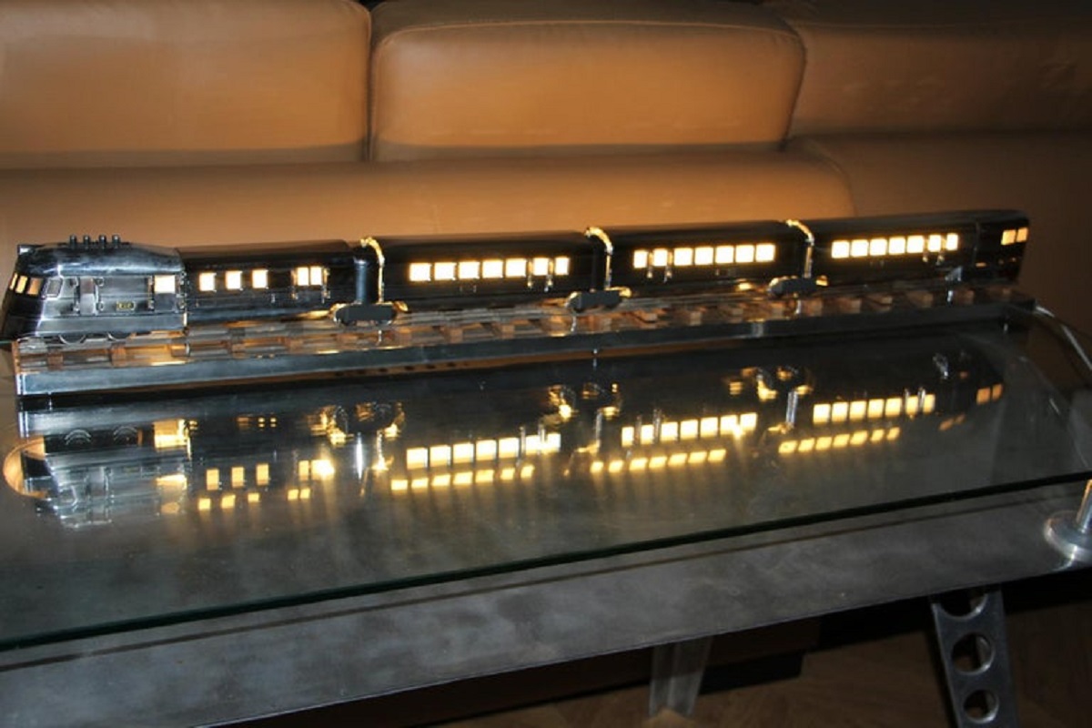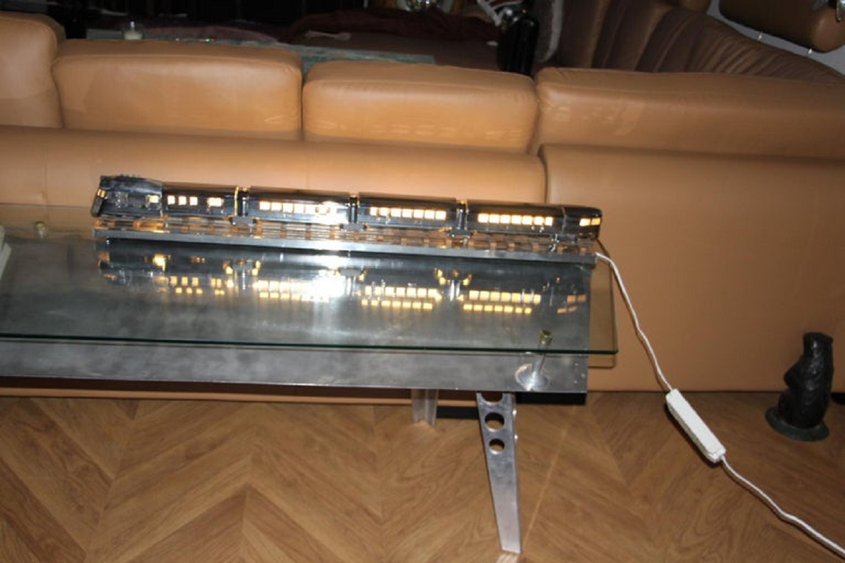 Ce modèle de train miniature en aluminium poli très inhabituel est équipé de lumières LED à l’intérieur et constitue une lampe de table spectaculaire et magnifique. C’est une pièce très rare et décorative qui peut être placée dans un bureau, un salon ou même dans une chambre. Il crée un beau décor et surtout il fait une lumière très douce pour créer une ambiance incomparable… Il est fixé sur son pied en aluminium poli pour un beau résultat.