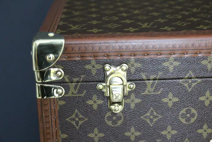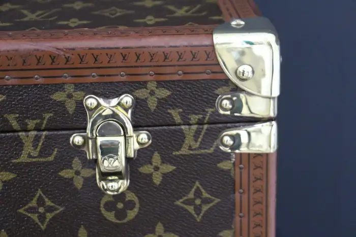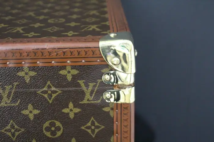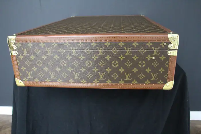 Cette très belle Valise Louis Vuitton du 20ème siècle monogramme est entièrement en laiton massif, avec une serrure principale et des fermoirs en laiton massif estampillés LV. Ses bordures sont marquées Louis Vuitton sur tout le pourtour.