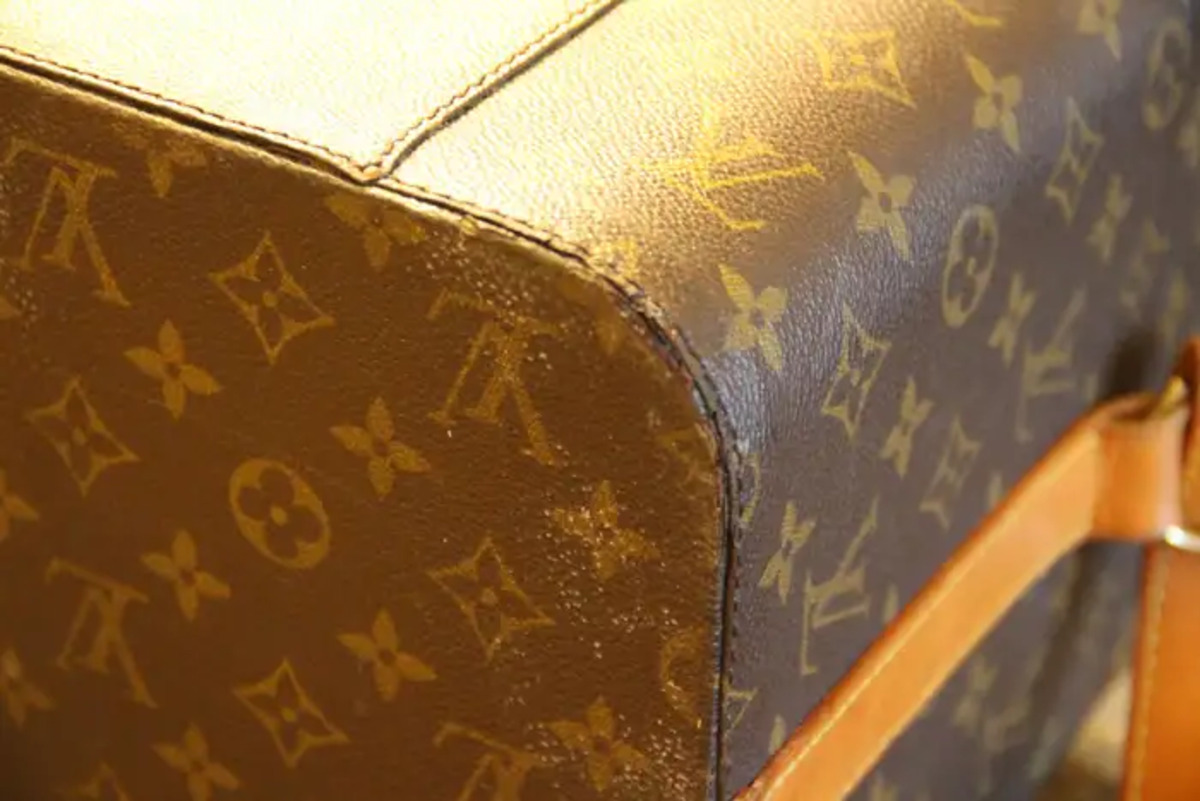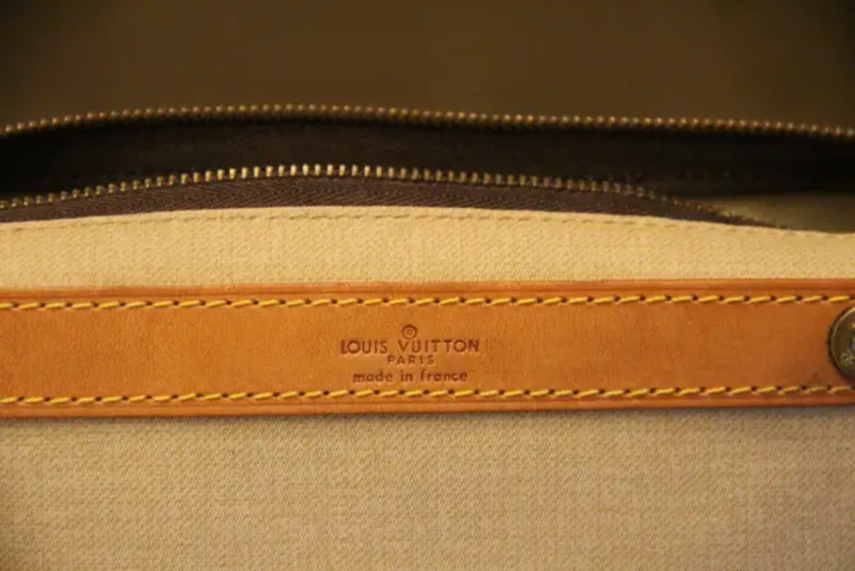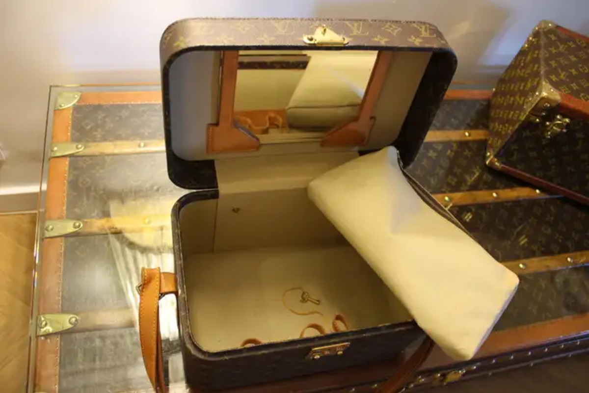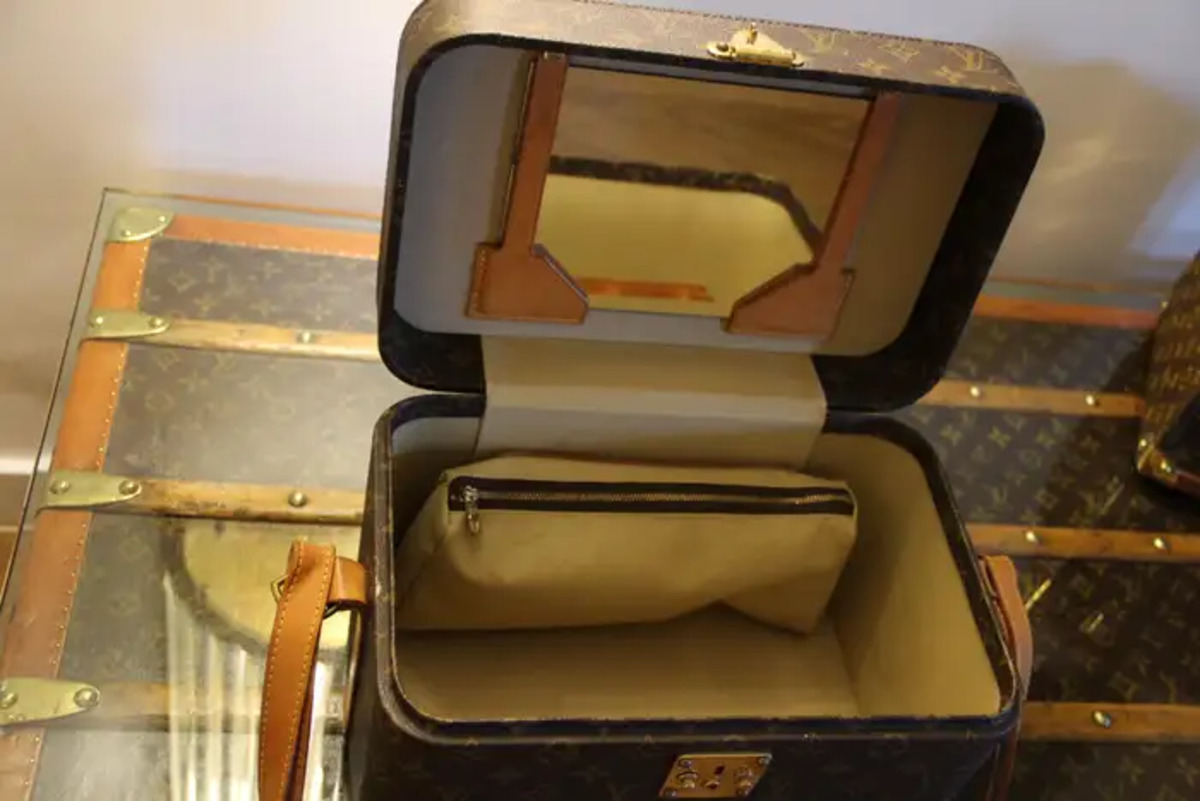 Son intérieur est en toile beige avec 3 sangles pour le maintien du matériel. Sous le capot se trouve un miroir amovible dans un cadre en cuir. Il possède également sa pochette amovible d’origine en toile beige, fermée par une fermeture éclair, ainsi que son étiquette en cuir Louis Vuitton.