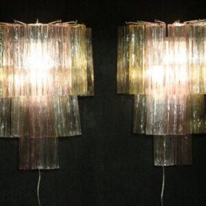 Cette paire d'appliques Tronchi Style Venini en verre de Murano est magnifique. Ses couleurs magnifiques et très douces sont très uniques. En effet, elle présente des tubes en verre de couleur rose, claire, jaune et fumée se terminant en forme de fleur. Vu d'en dessous, ça ressemble à un champ de fleurs. Chaque pièce de verre a été réalisée individuellement à Murano et est toutes légèrement différentes les unes des autres. Avec ses 3 étages de tubes en verre, cette paire d'appliques Tronchi style Venini est vraiment spectaculaire. Grâce à ses couleurs douces, elle donne une lumière très chaude et agréable et apporte une touche luxueuse dans tous les styles d'intérieurs. Ils sont bien plus beaux en vérité que sur les photos . Chaque applique nécessite 2 ampoules E14. Ils sont câblés pour les États-Unis.