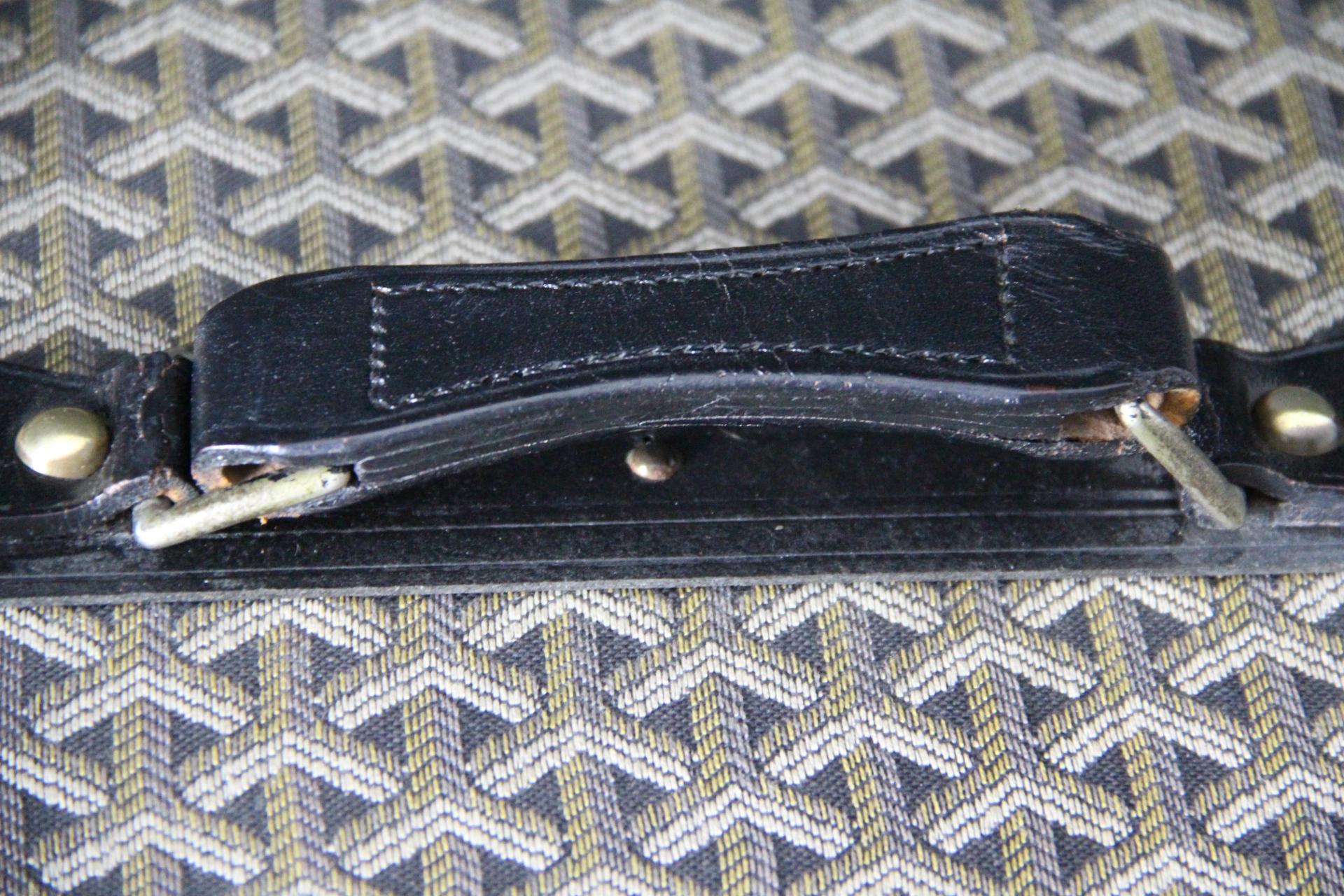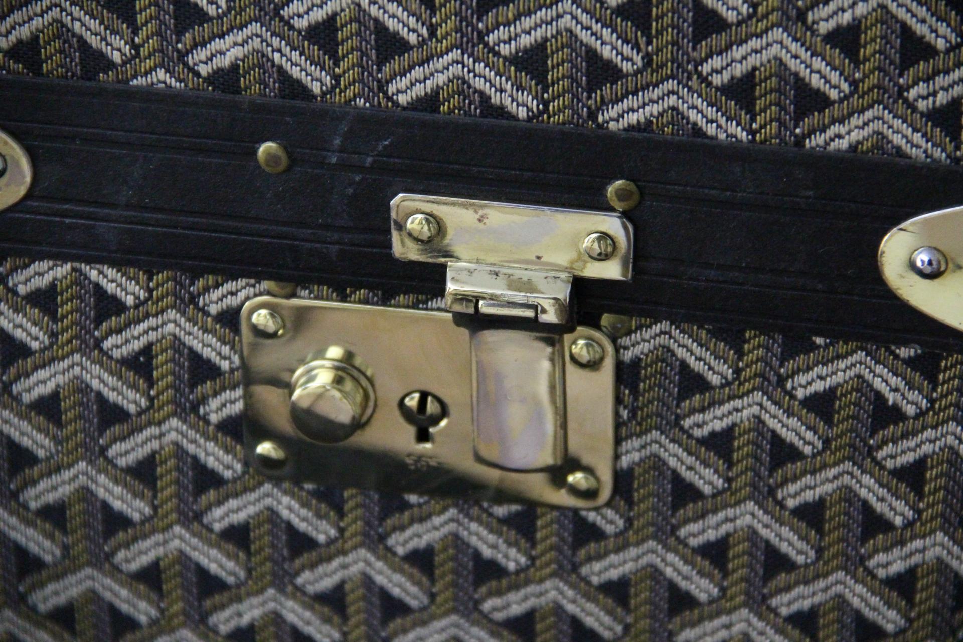 Cette superbe malle Goyard vintage présente la très recherchée toile tissée à chevrons ainsi que toutes les finitions en laiton massif; Elle comporte de grandes poignées latérales en cuir. Clous en laiton.