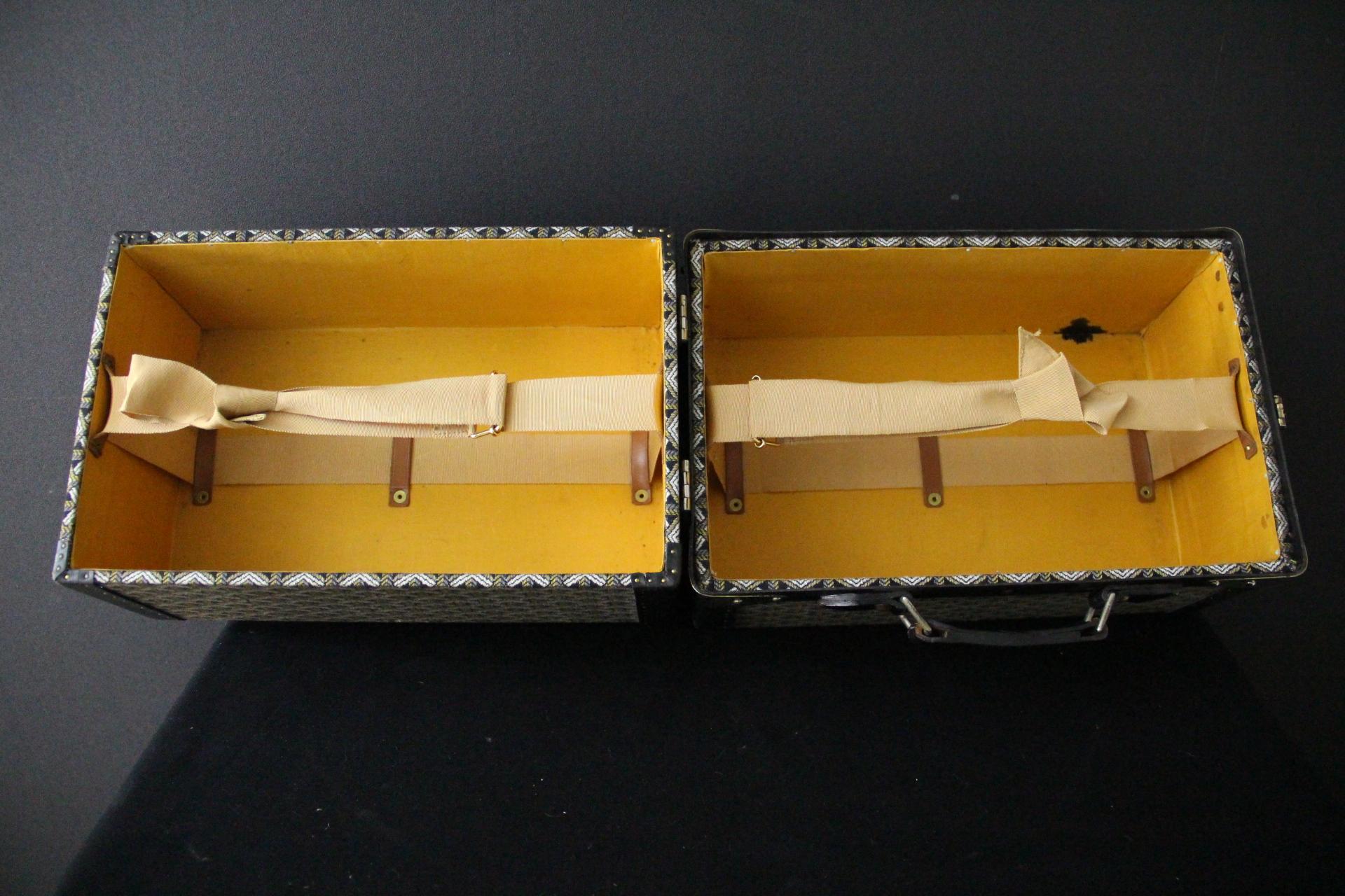 Sa toile est également en très bon état. Elle porte encore quelques belles étiquettes de voyage sur son dessus et sur son côté. Son intérieur jaune est parfaitement d'origine ainsi que son plateau amovible d'origine. Aucune odeur à l'intérieur.