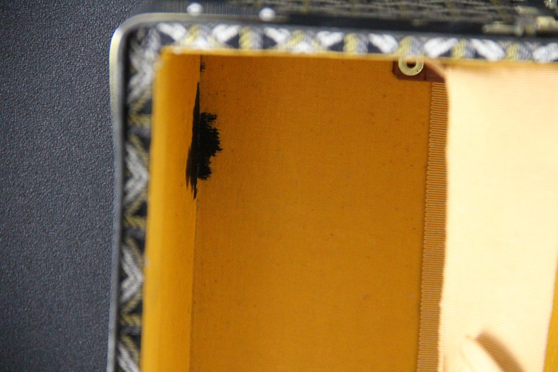 Elle dispose d'une bande peinte personnalisée jaune et blanc sur ses côtés. Elle a une belle patine chaude d'origine et est très élégante. Son intérieur est également d'origine et complet avec ses deux plateaux amovibles.