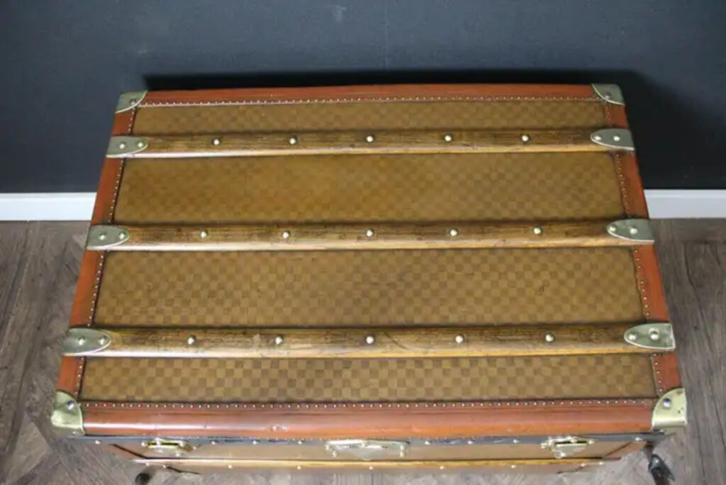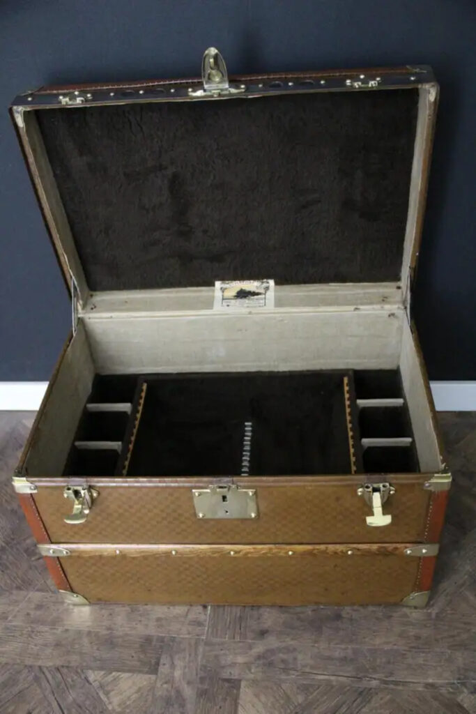L'intérieur, parfaitement conservé, révèle un espace de rangement généreux, souligné par l'étiquette Louis Vuitton d'origine et le numéro de série. Le dessous de la malle, avec sa toile monogramme et ses lattes de bois imprimées, ajoute une touche d'authenticité supplémentaire.
