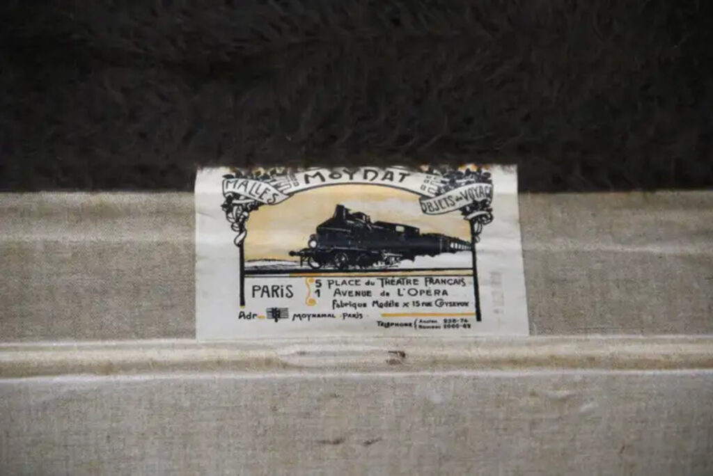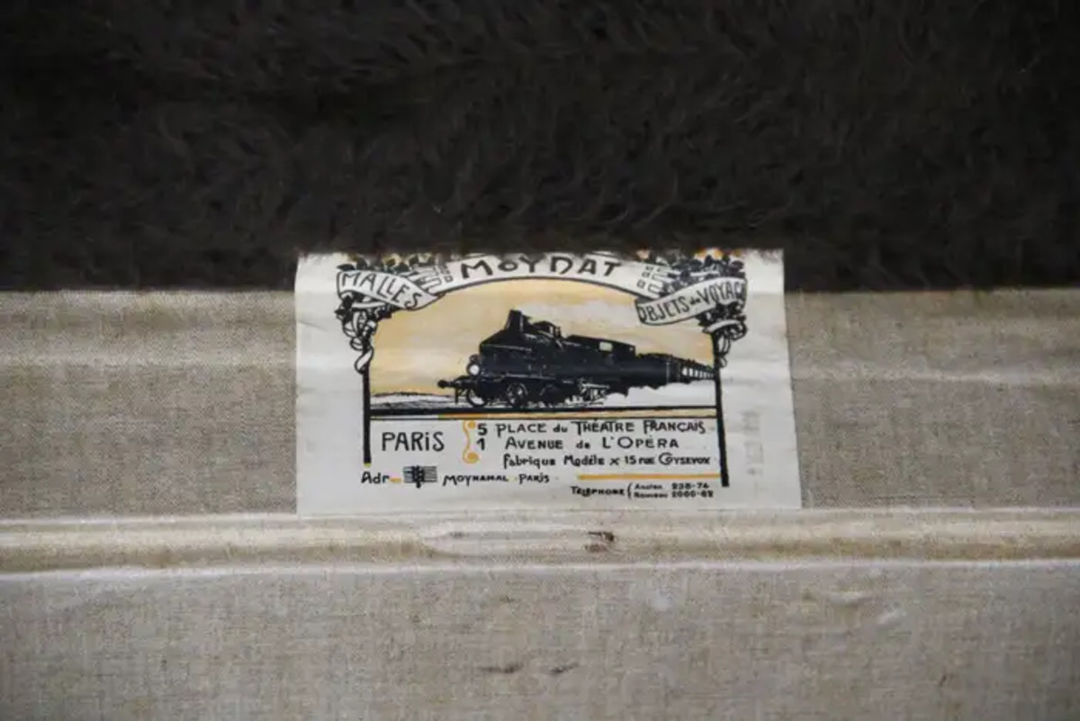 Sa patine est magnifique. L'intérieur a été regarni il y a quelques années, de même que le capiton sous le capot. Elle a conservé son etiquette intérieure Moynat d’origine. L’intérieur de cette malle Moynat est donc en parfait état, très propre et frais, parfait pour le rangement.