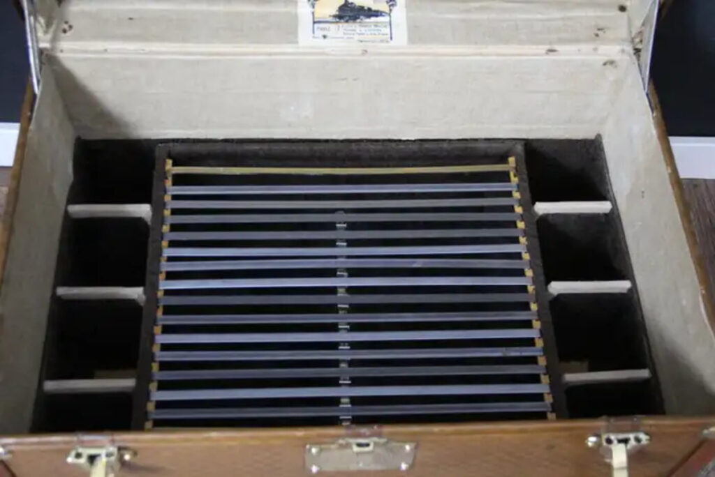 Son capot est garni de feutre brun, de même que son fond intérieur. Cette Malle Moynat pique nique peut être employée comme une table d’appoint très élégante, une table basse ou comme une parfaite table de nuit. Elle est si chic qu’elle attirera l’attention partout où elle trouvera une nouvelle maison…