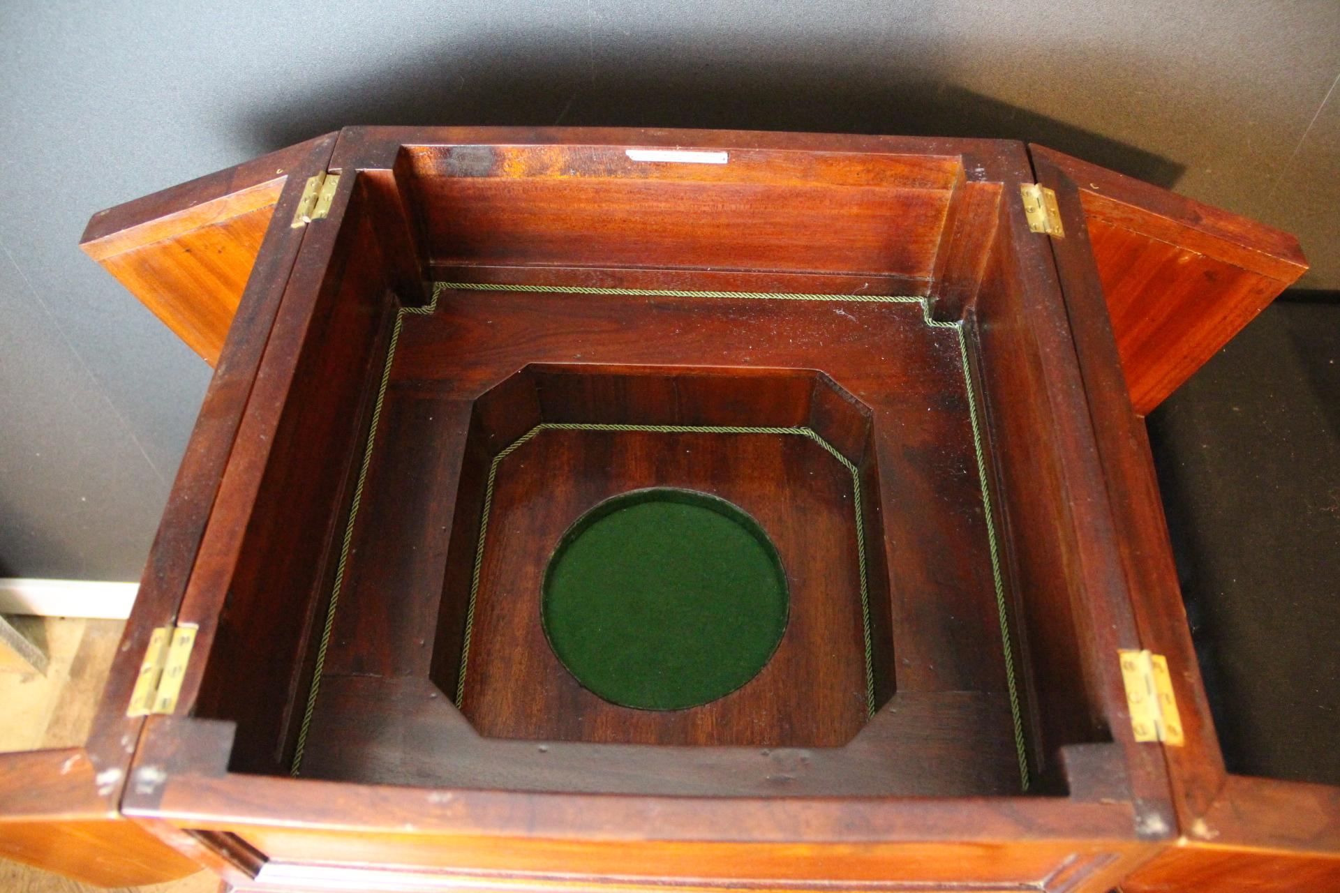 Son dessus à charnières s'ouvre et fait remonter un plateau, sur lequel sont disposés un service complet de magnifiques verres en cristal taillé, un petit plateau amovible en bois et trois carafes en cristal taillé.
