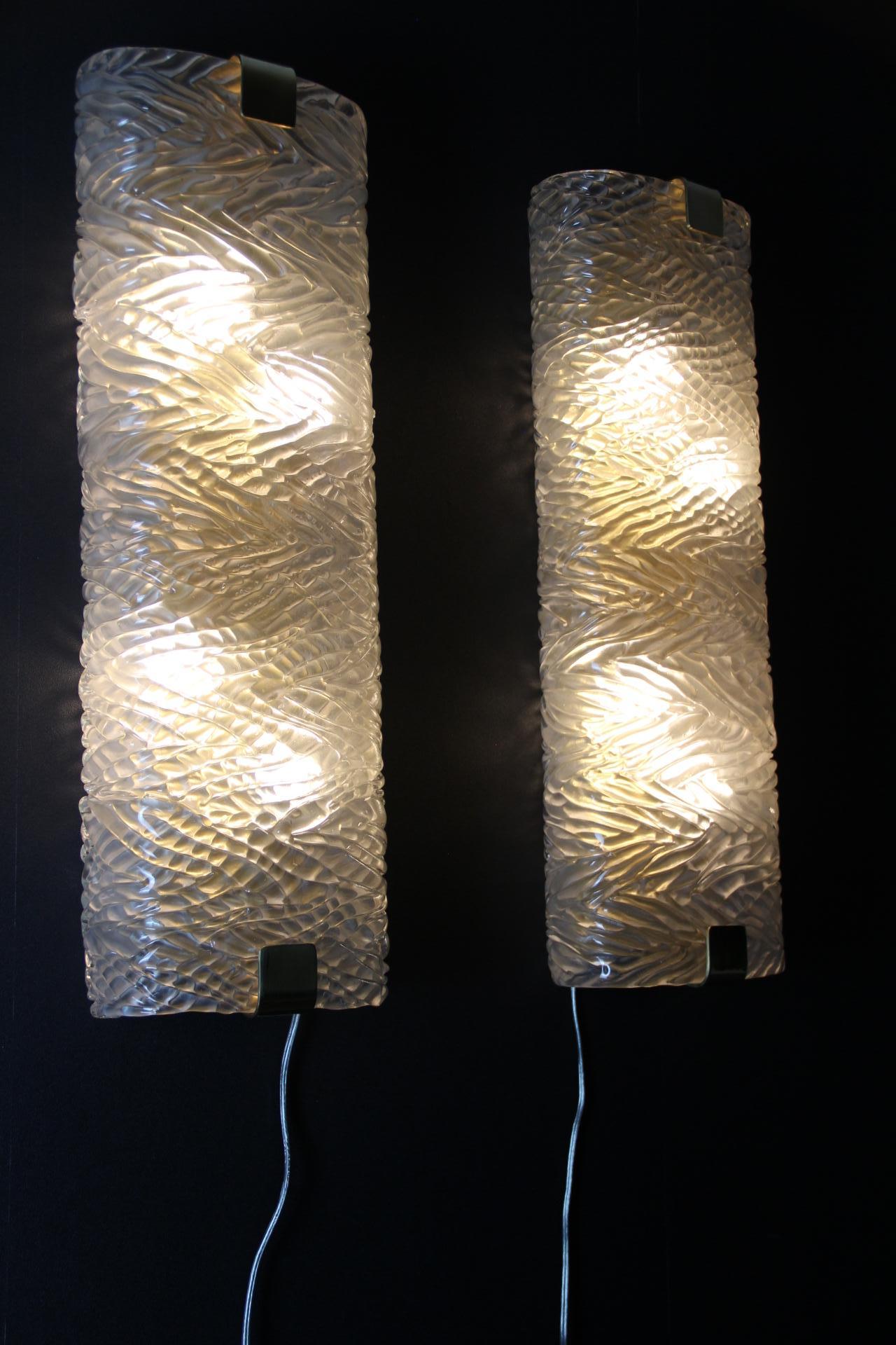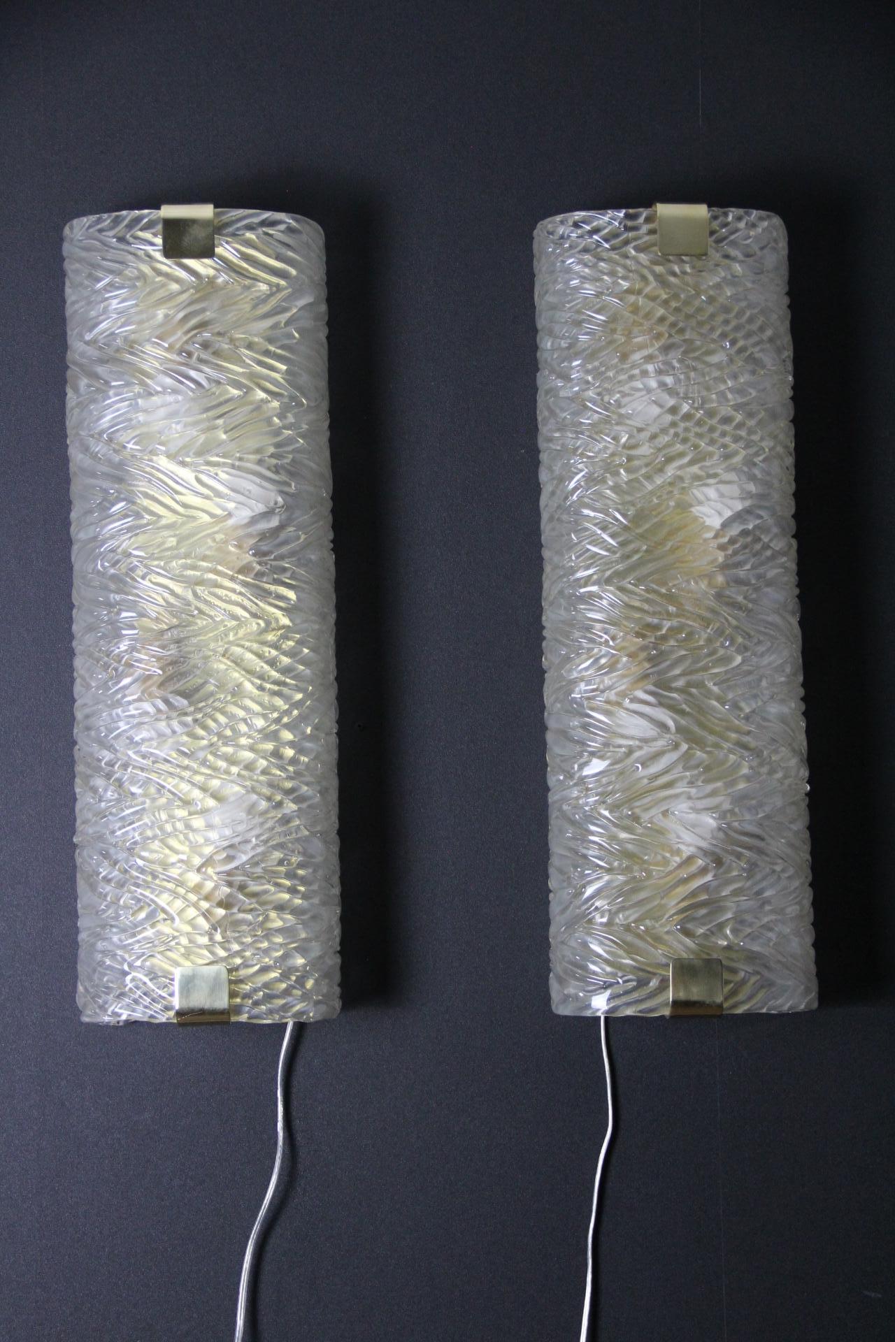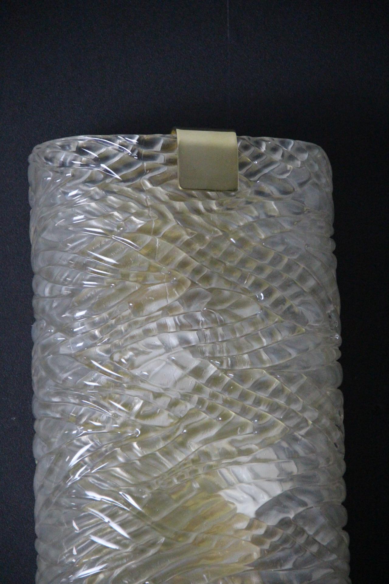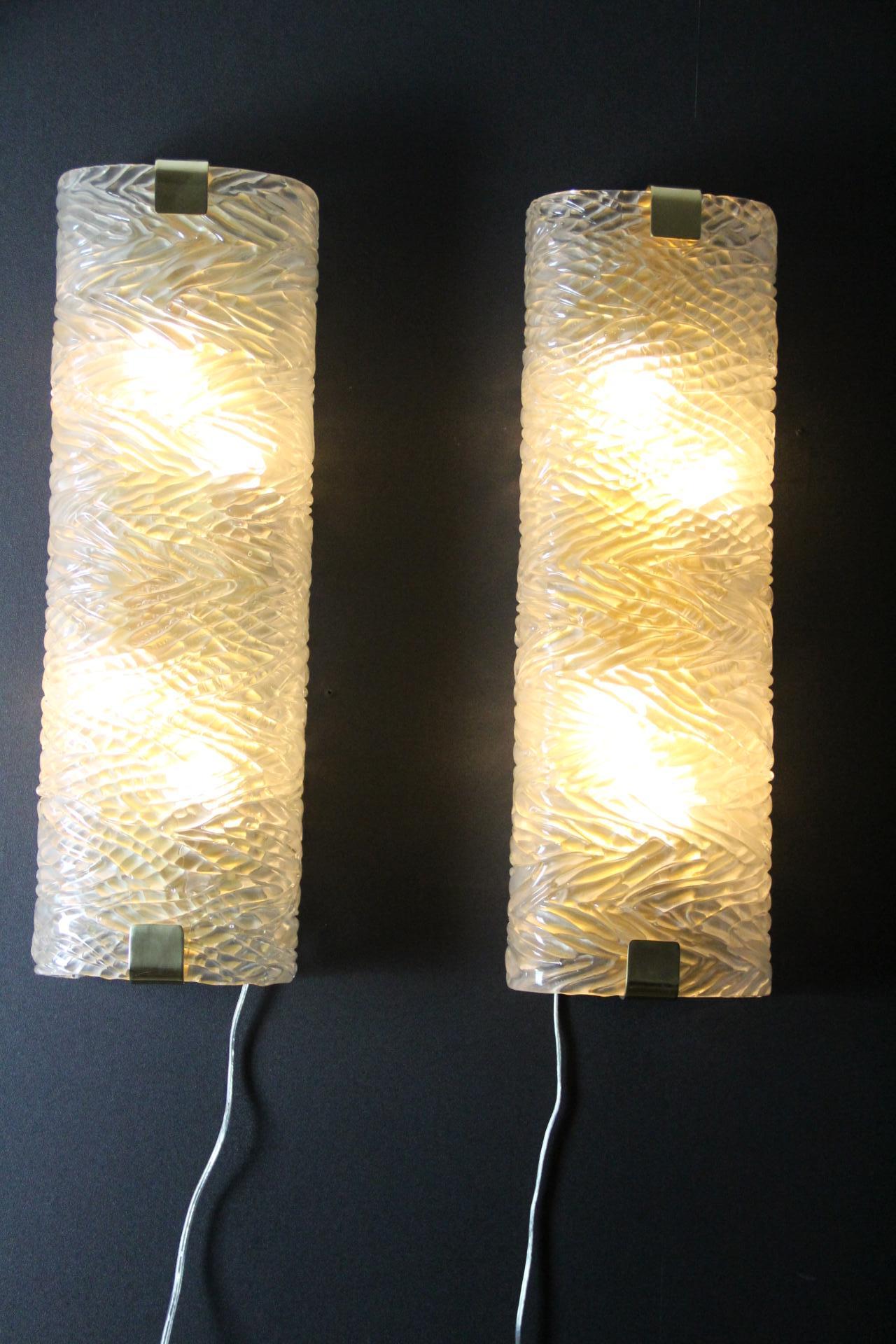 Cette paire d’appliques murales fabriquées à la main présente une paroi épaisse en verre de Murano texturé avec un motif géométrique en relief. Il crée un mouvement unique et magnifique qui rappelle les décors modernes ou la haute couture.