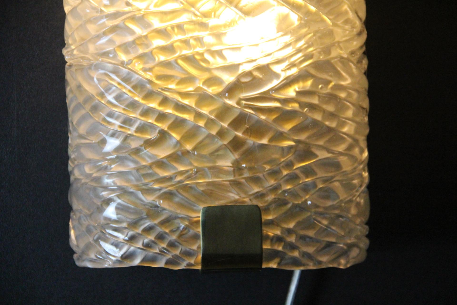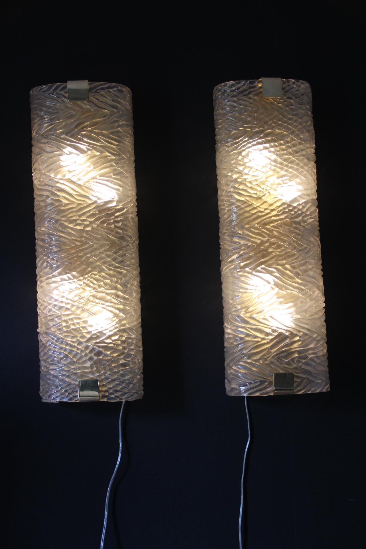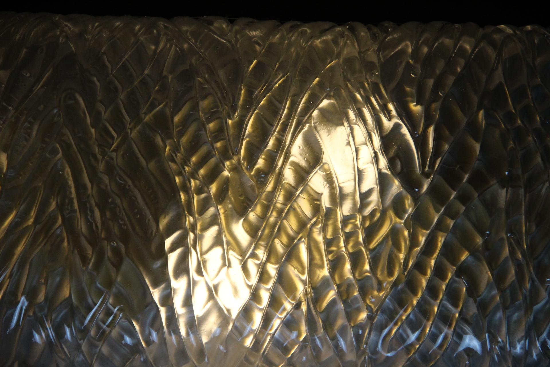 Cette paire d’appliques murales fabriquées à la main présente une paroi épaisse en verre de Murano texturé avec un motif géométrique en relief. Il crée un mouvement unique et magnifique qui rappelle les décors modernes ou la haute couture.