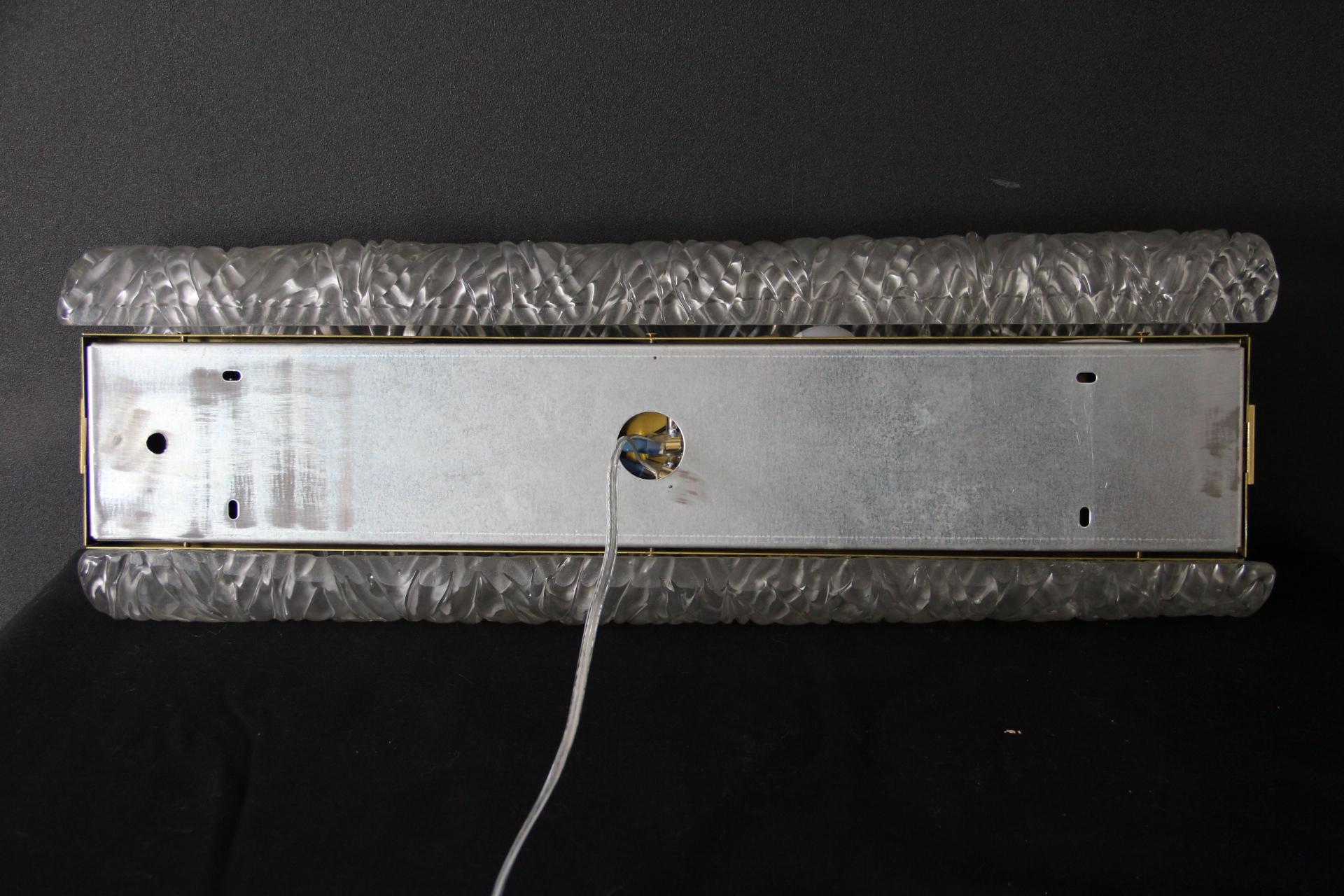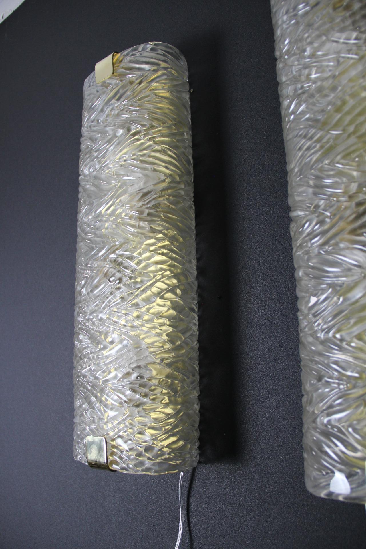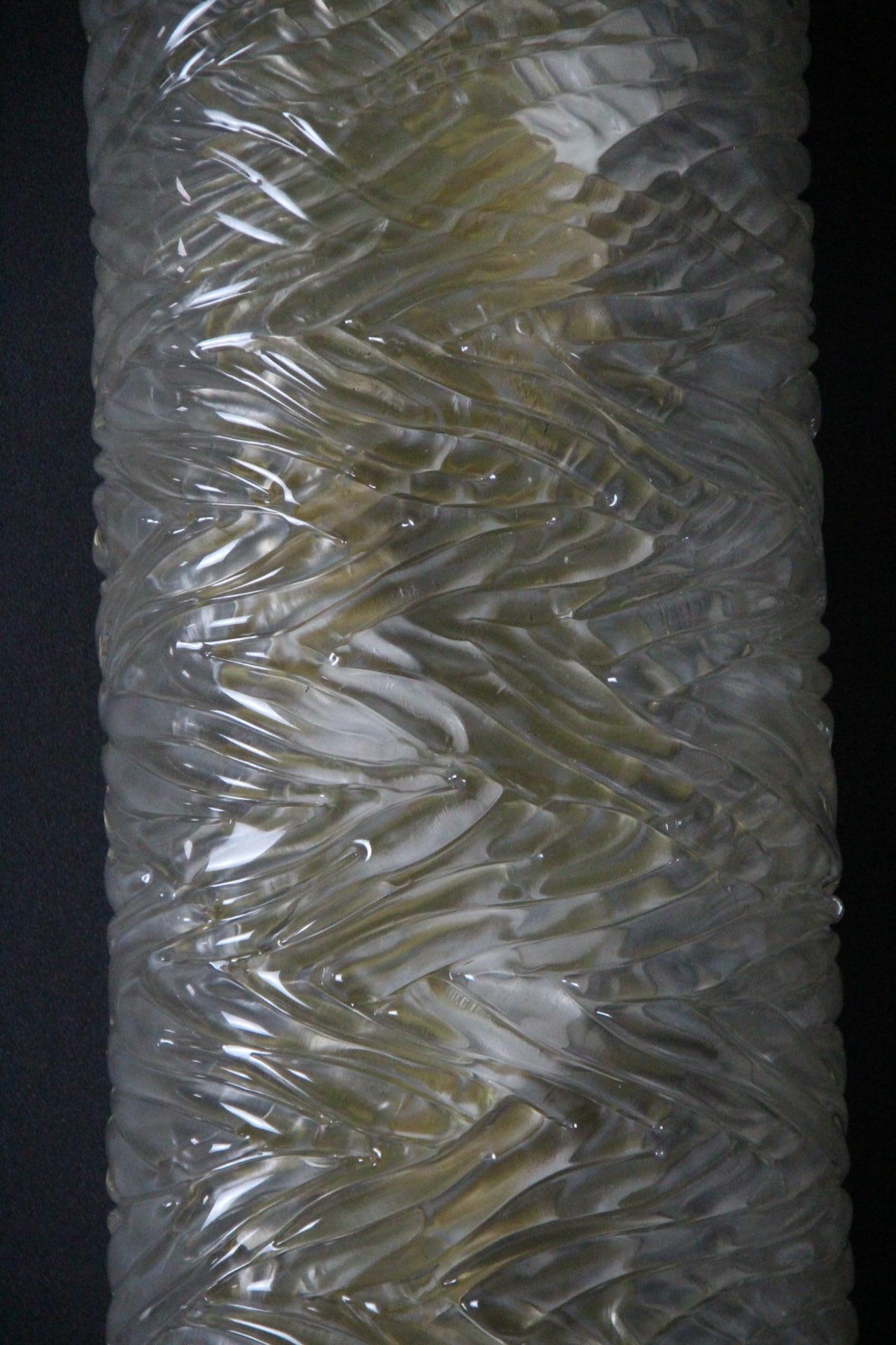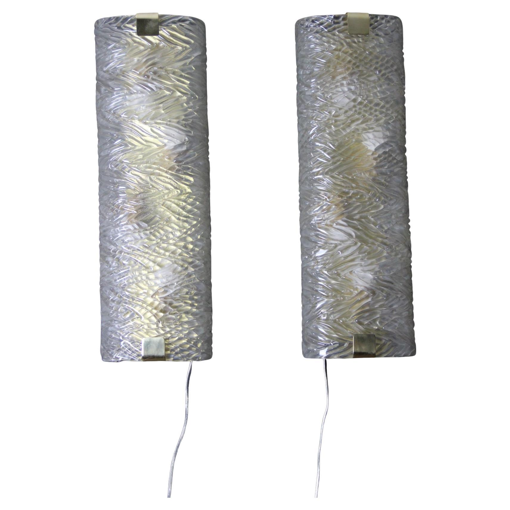 Cette paire d’appliques murales fabriquées à la main présente une paroi épaisse en verre de Murano texturé avec un motif géométrique en relief. Il crée un mouvement unique et magnifique qui rappelle les décors modernes ou la haute couture.