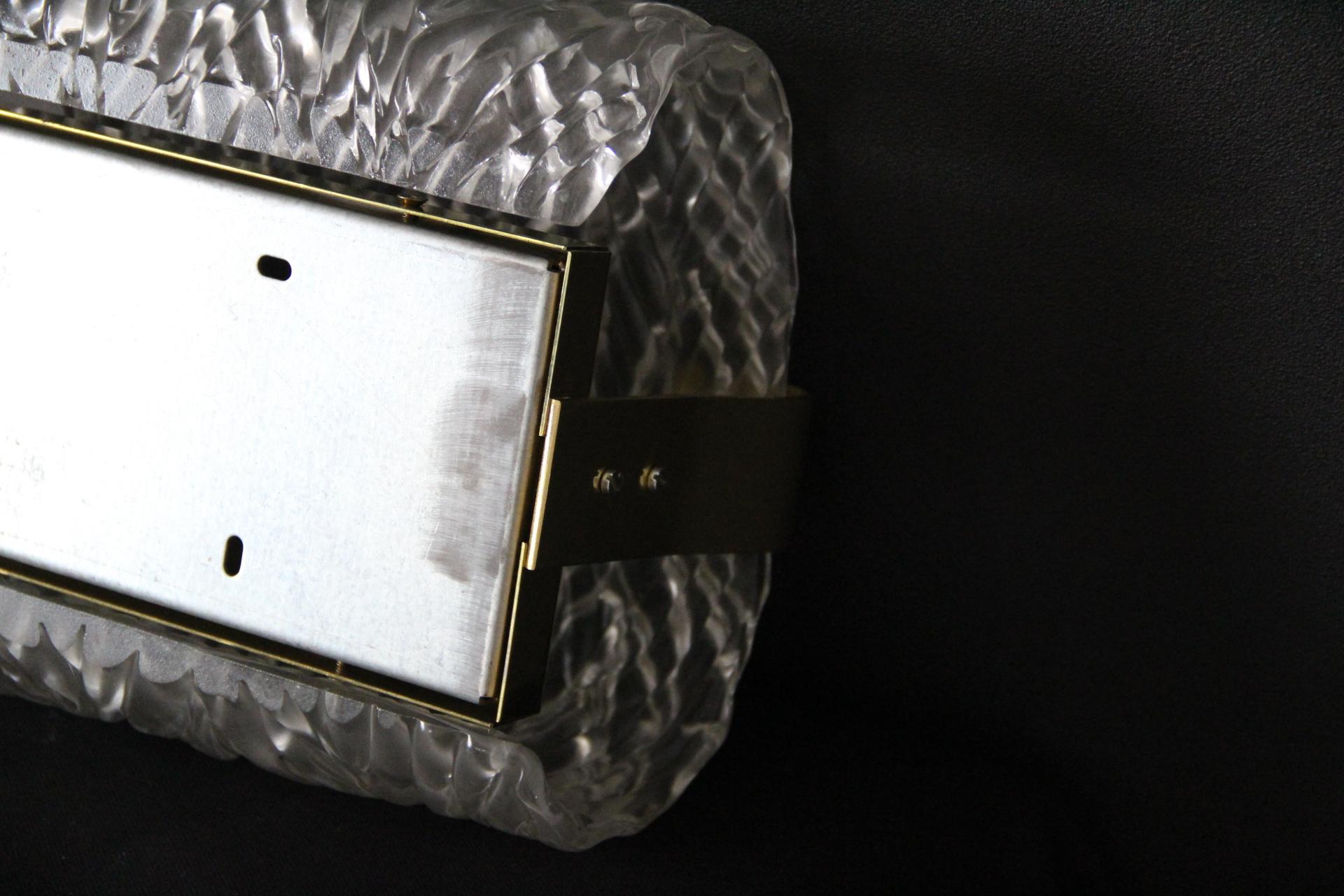 Ces appliques sont de véritables œuvres d’art en verre puisqu’elles ont toutes été fabriquées à la main, chaque motif géométrique ayant été surfacé et meulé à la main. Son verre soufflé richement texturé donne une lumière agréable et chaleureuse grâce à sa plaque arrière en laiton doré.